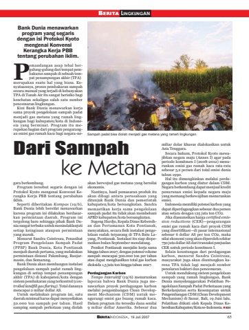 BERITAINDONESIA, 19 Juli 2007 65BERITA LINGKUNGANDari Sampahke MetanaBank Dunia menawarkanprogram yang segarisdengan isi Protokol Kyotomengenai KonvensiKerangka Kerja PBBtentang perubahan iklim.emandangan asap tebal bergulung-gulung dari tempat pembakaran sampah di sebuah tempat penampungan akhir (TPA)merupakan suatu hal yang biasa. Kenyataannya, proses pembakaran sampahsecara manual yang terjadi di kebanyakanTPA di Tanah Air itu sangat berisiko bagikesehatan sekaligus salah satu sumberpencemaran lingkungan.Kini Bank Dunia menawarkan kerjasama proyek pengelolaan sampah padatmenjadi gas metana yang ramah lingkungan bagi kabupaten/kota di Indonesia yang berminat. Program itu merupakan bagian dari program pengurangan emisi gas rumah kaca bagi negara-negara berkembang.Program tersebut segaris dengan isiProtokol Kyoto mengenai Konvensi Kerangka Kerja PBB tentang perubahaniklim.Seperti diberitakan Kompas (19/6),Bank Dunia lebih bersifat menawarkankarena program ini dilakukan berdasarkan permintaan daerah. Program initergolong baru sehingga pihak Bank Dunia sangat terbuka untuk menindaklanjutisetiap keinginan ataupun permintaanyang masuk.Menurut Sandra Cointreau, PenasihatProgram Pengelolaan Sampah Padat(PPSP) Bank Dunia, Kota Pontianakmenjadi daerah pertama, yang melakukanpermintaan disusul Palembang, Banjarmasin, dan Semarang.Bank Dunia akan membangun instalasipengelolaan sampah padat ramah lingkungan di setiap tempat penampunganakhir (TPA) di kabupaten/kota dengansistem pembakaran yang terkontrol (controlled landfill gas flaring). Total dananyamencapai 2 miliar dollar AS.Untuk melakukan program ini, satudaerah minimal harus dapat menyediakan50.000 ton sampah per tahun. Hasilsamping sampah perkotaan yang diolahakan berwujud gas metana yang bernilaiekonomis.Nantinya, hasil pemasaran produk ituakan dibagi antara perusahaan yangditunjuk Bank Dunia dan pemerintahkabupaten/kota bersangkutan. Sandramemastikan kerja sama pengelolaansampah padat itu tidak akan membebaniAPBD kabupaten/kota bersangkutan.Sugeng Hardjo, Kepala Dinas Kebersihan dan Pertamanan Kota Pontianak,menyatakan, secara fisik instalasi pengelolaan sudah terpasang di TPA Batu Layang, Pontianak. Instalasi itu siap dioperasikan bulan September mendatang.Pemkot Pontianak menjalin kerja samahingga tahun 2027, dengan potensi volumesampah mencapai 300.000 ton per tahunatau dapat menghasilkan total gas karbondioksida 1,5 juta ton hingga tahun 2027.Perdagangan KarbonTempo Interaktif (19/6) menurunkanlaporan bahwa Bank Dunia juga menawarkan proyek perdagangan karbonmelalui pengembangan Clean Development Mechanism (CDM) untuk mengurangi emisi gas buang rumah kaca.Dalam program itu tersedia dana senilai9 miliar dollar Amerika. Sebesar duamiliar dolar khusus dialokasikan untukAsia Tenggara.Secara hukum, Protokol Kyoto mewajibkan negara maju (Annex I) agar padaperiode komitmen I (2008-2012) menurunkan emisi gas rumah kaca rata-ratasebesar 5,2 persen dari total emisi duniatahun 1990.Hal itu dimungkinkan melalui perdagangan karbon yang diatur dalam CDM.Negara berkembang dapat menjual kreditpenurunan emisi kepada negara majuyang memang berkewajiban menurunkanemisi.Indonesia memiliki potensi karbon yangdapat diperdagangkan sebesar dua persenatau setara dengan 125 juta ton CO2.Jika diasumsikan harga certified emission reductions (CER)—penguranganemisi gas rumah kaca dari proyek CDMyang disertifikasi—di pasar internasionalsebesar 6 dollar AS per ton CO2, makanilai ekonomi yang akan diperoleh sekitar750 juta dollar AS dari transaksi penjualanCER untuk periode komitmen I.Selain keuntungan dari perdagangankarbon, menurut Sandra Cointreau,masyarakat juga akan diuntungkan karena TPA tidak lagi menjadi sumberpenularan bakteri dan pencemaran.Untuk mendukung sistem pengelolaansampah yang ramah lingkungan, BankDunia menyelenggarakan Pelatihan Pengelolaan Sampah Padat Perkotaaan yangBerkelanjutan serta Kesempatan untukPengembangan CDM (Clean DevelopmentMechanism) di Sanur, Bali, 19 Juni lalu.Pelatihan diikuti oleh Kepala Dinas Kebersihan Kabupaten/Kota se-Indonesia. RHSampah padat bisa diolah menjadi gas metana yang ramah lingkunganP