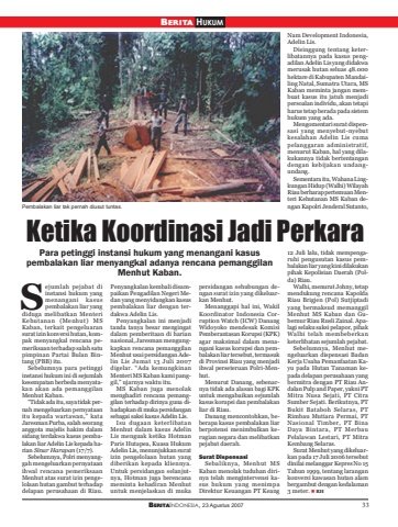 BERITAINDONESIA, 23 Agustus 2007 33BERITA HUKUMKetika Koordinasi Jadi PerkaraPara petinggi instansi hukum yang menangani kasuspembalakan liar menyangkal adanya rencana pemanggilanMenhut Kaban.ejumlah pejabat diinstansi hukum yangmenangani kasuspembalakan liar yangdiduga melibatkan MenteriKehutanan (Menhut) MSKaban, terkait pengeluaransurat izin konversi hutan, kompak menyangkal rencana pemeriksaan terhadap salah satupimpinan Partai Bulan Bintang (PBB) itu.Sebelumnya para petinggiinstansi hukum ini di sejumlahkesempatan berbeda menyatakan akan ada pemanggilanMenhut Kaban.“Tidak ada itu, saya tidak pernah mengeluarkan pernyataanitu kepada wartawan,” kataJaresman Purba, salah seoranganggota majelis hakim dalamsidang terdakwa kasus pembalakan liar Adelin Lis kepada harian Sinar Harapan (17/7).Sebelumnya, Polri menyanggah mengeluarkan pernyataanihwal rencana pemeriksaanMenhut atas surat izin pengelolaan hutan gambut terhadapdelapan perusahaan di Riau.Penyangkalan kembali disampaikan Pengadilan Negeri Medan yang menyidangkan kasuspembalakan liar dengan terdakwa Adelin Lis.Penyangkalan ini menjaditanda tanya besar mengingatdalam pemberitaan di hariannasional, Jaresman mengungkapkan rencana pemanggilanMenhut usai persidangan Adelin Lis Jumat 13 Juli 2007digelar. “Ada kemungkinanMenteri MS Kaban kami panggil,” ujarnya waktu itu.MS Kaban juga menolakmenghadiri rencana pemanggilan terhadap dirinya guna dihadapkan di muka persidangansebagai saksi kasus Adelin Lis.Isu dugaan keterlibatanMenhut dalam kasus AdelinLis menguak ketika HotmanParis Hutapea, Kuasa HukumAdelin Lis, menunjukkan suratizin pengelolaan hutan yangdiberikan kepada kliennya.Untuk persidangan selanjutnya, Hotman juga berencanameminta kehadiran Menhutuntuk menjelaskan di mukapersidangan sehubungan dengan surat izin yang dikeluarkan Menhut.Menanggapi hal ini, WakilKoordinator Indonesia Corruption Watch (ICW) DanangWidoyoko mendesak KomisiPemberantasan Korupsi (KPK)agar maksimal dalam menangani kasus korupsi dan pembalakan liar tersebut, termasukdi Provinsi Riau yang menjadiihwal perseteruan Polri-Menhut.Menurut Danang, sebenarnya tidak ada alasan bagi KPKuntuk mengabaikan sejumlahkasus korupsi dan pembalakanliar di Riau.Danang mencontohkan, beberapa kasus pembalakan liarberpotensi menimbulkan kerugian negara dan melibatkanpejabat daerah.Surat DispensasiSebaliknya, Menhut MSKaban menolak tuduhan dirinya telah mengintervensi kasus hukum yang menimpaDirektur Keuangan PT KeangNam Development Indonesia,Adelin Lis.Disinggung tentang keterlibatannya pada kasus pengadilan Adelin Lis yang didakwamerusak hutan seluas 48.000hektare di Kabupaten Mandailing Natal, Sumatra Utara, MSKaban meminta jangan membuat kasus itu jatuh menjadipersoalan individu, akan tetapiharus tetap berada pada sistemhukum yang ada.Mengomentari surat dispensasi yang menyebut-nyebutkesalahan Adelin Lis cumapelanggaran administratif,menurut Kaban, hal yang dilakukannya tidak bertentangandengan kebijakan undangundang.Sementara itu, Wahana Lingkungan Hidup (Walhi) WilayahRiau berharap pertemuan Menteri Kehutanan MS Kaban dengan Kapolri Jenderal Sutanto,12 Juli lalu, tidak mempengaruhi pengusutan kasus pembalakan liar yang kini dilakukanpihak Kepolisian Daerah (Polda) Riau.Walhi, menurut Johny, tetapmendukung rencana KapoldaRiau Brigjen (Pol) Sutjiptadiyang bermaksud memanggilMenhut MS Kaban dan Gubernur Riau Rusli Zainal. Apalagi selaku saksi pelapor, pihakWalhi telah membeberkanketerlibatan sejumlah pejabat.Sebelumnya, Menhut mengeluarkan dispensasi BadanKerja Usaha Pemanfaatan Kayu pada Hutan Tanaman kepada delapan perusahaan yangbermitra dengan PT Riau Andalan Pulp and Paper, yakni PTMitra Nusa Sejati, PT CitraSumber Sejati. Berikutnya, PTBukit Bataboh Selaras, PTRimbau Mutiara Permai, PTNasional Timber, PT BinaDaya Bintara, PT MerbauPelalawan Lestari, PT MitraKembang Selaras.Surat Menhut yang dikeluarkan pada 17 Juli 2006 tersebutdinilai melanggar Kepres No 15Tahun 1999, tentang larangankonversi kawasan hutan alambergambut dengan kedalaman3 meter. RHSPembalakan liar tak pernah diusut tuntas.