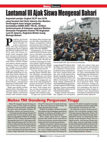 BERITAINDONESIA, 23 Agustus 2007 53BERITA HANKAMMabes TNI Gandeng Perguruan TinggiLantamal III Ajak Siswa Mengenal BahariMabes TNI menggandeng sejumlah perguruantinggi di Tanah Air dalam rangka meningkatkankerjasama di bidang penelitian, pengembanganalat utama sistem persenjataan (Alutsista) TNI,pendidikan, pelatihan dan kerjasama lainnya.Kontrak kerja sama ditandatangani Panglima TNIMarsekal Djoko Suyanto bersama kelima rektorperguruan tinggi negeri itu di Mabes TNI, Cilangkap,Jakarta Timur (25/7). Masing-masing Rektor InstitutTekonologi Bandung Prof.Dr.Ir. Djoko Santoso,MSc,Rektor Universitas Hasannuddin Prof.DR.dr. IdrusA.Patursi, Rektor Istitut Teknologi Sepuluh November Surabaya/ITS Prof.Ir.Priyo Suprobo,MS,PhP,Rektor Universitas Indonesia saat itu, Prof.Dr.Usman Chatib Warsa PhD,SP, MK dan Rektor Universitas Gadjah Mada/UGM Prof.Ir.Sudjarwadi,M.Eng,PhD. Kerja sama ini merupakan tindak lanjutdari kerja sama sebelumnya antara Mabes TNIdengan sejumlah perguruan tinggi.Panglima TNI mengakui, kerja sama yang telahdibina selama ini belum terselenggara secara optimal,disebabkan kompleksnya permasalahan yang dihadapi, baik secara internal maupun eksternal.Namun dengan adanya MoU ini, Panglimaberharap dapat dicetak Sumber Daya Manusia(SDM) yang handal dan memiliki Alutsista dalampenggunaan hasil-hasil teknologi pertahanan.Panglima menyebutkan, tiga pilar utama yangberkompetensi dalam pembangunan kekuatanpertahanan negara, yakni TNI, perguruan tinggi,dan industri strategis pertahanan (BUMNIS).Sesuai dengan UU No 34 tahun 2004 tentang TNI,tugas pokok TNI adalah menegakkan kedaulatannegara, mempertahankan keutuhan wilayah NKRIyang berdasarkan Pancasila dan UUD 1945.Dari ketiga pilar itu ada dua hal lagi yang perludipahami untuk meningkatkan kerjasama antaraTNI dengan perguruan tinggi tersebut. Pertama, TNIselaku pengguna hasil rekayasa teknologi dalampelaksanaan operasi dan pengembangan taktislapangan sangat dipengaruhi dengan sifat danhakekat ancaman, serta teknologi Alutsista yangdimiliki. Kedua, perguruan tinggi selaku lembagapencetak SDM yang berkualitas memiliki peran danfungsi menentukan dalam penguasaan Iptek,rekayasa engineering bagi kebutuhan Alutsista TNI,dan merupakan postur yang sangat melekat denganindustri strategis pertahanan. RON, SPanglima KomandoArmada RI KawasanBarat (Pangko Armabar) LaksamanaMuda TNI Agus Suhartono,mengajak para siswa/i Jakartadan Banten tingkat SLTP danSLTA pada saat liburan sekolah untuk mengenal lebihjauh wawasan nusantara khususnya di bidang kemaritiman.Kegiatan Bintal Juang Remaja Bahari (BJRB) denganrute Jakarta- Banten yang berlangsung selama empat hari(9/7 hingga 12/7) itu diikuti389 peserta. Dimulai dari Dermaga 115 Tanjung Priok, menaiki KRI Teluk Ende-517 menuju Selat Sunda. Selama dalam perjalanan di atas kapal,Komandan KRI Teluk Ende517 Letkol Laut (P) YeheskielKatiandhago, menjelaskanbagaimana seluk-beluk kehidupan di atas kapal perang.Begitu juga pejabat PemkotJakarta Utara, Zainuddin, mengambil bagian memberikanceramah seputar pembinaanmental, baik ceramah mengenai agama Islam maupun agama non Islam. Kemudian pentingnya menghindari bahayadari Narkoba, HIV (AIDS), serta bahaya merokok yang disampaikan Nina dari BKKBN.Sesampainya di DermagaIndah Kiat Merak Banten, parasiswa/i disambut KomandanPangkalan Angkatan Laut(Dan Lanal) Kolonel Laut (P)Imron Djunaedi. Mereka meneruskan kunjungan ke beberapa tempat, seperti mengunjungi Museum Banten, MasjidAgung Banten dan Cagar Budaya Benteng Surosowan.Tak lupa mereka juga mendatangi Pantai Pulorida Banten sekaligus mendapatkanmateri bagaimana cara selamdasar yang dipandu PenyelamTNI AL dan penggunaan perahu karet yang langsung dipimpin Komando PasukanKatak (Kopaska) untuk wilayah Barat. Pada malam harinya, mereka menyaksikan pemutaran film seputar perjuangan TNI Angkatan Laut.Di pagi hari, peserta BJRBmengunjungi PT Krakatau Steeldi Cilegon. Para peserta mendapat penjelasan tentang prosesproduksi besi baja mulai dari bahan dasar sampai bahan jadidan siap untuk dipasarkan.Mereka mengakhiri perjalan diDermaga Komando Lintas LautMiliter (Kolinlamil) TanjungPriok, Jakarta. Sebelumnya, diatas kapal dilakukan upacara penutupan kegiatan BJRB denganInspektur Upacara KomandanKRI Teluk Ende Letkol Laut (P)Yeheskiel Katiandhago.Pangko Armabar menyebutkan, kegiatan ini merupakansalah satu wahana bagi pararemaja untuk menanamkanjiwa bahari serta mengembangkan wawasan cinta tanahair, guna menumbuhkan jiwakepejuangan dan kebaharian.Upaya TNI AL ini merupakan implementasi kepedulianterhadap masa depan bangsalewat generasi muda. Panglima berharap, dengan kegiatan ini dapat menyadarkanarti pentingnya laut bagi kelangsungan hidup bangsa Indonesia, serta menanamkansemangat jiwa kebaharian bagigenerasi muda. RON, SPSejumlah pelajar tingkat SLTP dan SLTAyang berasal dari Kota Jakarta dan Banten,berseragam kaos lengan panjangbertuliskan BJRB 2007 TNI AL, terlihatberkerumunan di halaman upacara MarkasKomando Pangkalan Utama TNI AngkatanLaut III Jakarta. Kegiatan Bintal JuangRemaja Bahari.PPeserta BJRB 2007 saat menerima pembekalan.foto: dok. pen. lantamal III