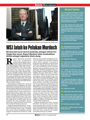 54 BERITAINDONESIA, 23 Agustus 2007BERITA MANCANEGARAWSJ Jatuh ke Pelukan MurdochBerawal dari koran kecil di Australia, jaringan televisi Foxhingga Dow Jones, Rupert Murdoch telah membuktikandirinya sebagai negosiator bisnis ulung.Murdoch Timelineupert Murdoch eksekutifNews Corp - konglomerasimedia terbesar ketiga di duniadengan nilai US$68 miliar,dan salah satu dari sedikit mega korporasiyang dikendalikan oleh satu orang -berhasil membeli Dow Jones dengan nilaiUS$5 miliar atau sekitar Rp 45 triliun.Calon investor lain, seperti General Electric yang memiliki jaringan berita bisnisCNBC dan Washington Post dan PearsonPLC yang memiliki koran Financial Times,sudah kandas di tengah jalan. Dari hasilpenjualan tersebut para pemegang sahamakan menerima US$ 60 atau sekitar Rp 540ribu per lembar saham.Berpindahnya kendali Dow Jones kepelukan Murdoch mengakhiri satu abadkepemilikan keluarga Bancroft di perusahaan media terkemuka Amerika Serikatitu. Setelah tiga bulan alot bernegosiasi,kesepakatan bisnis antara kedua perusahaan diumumkan pihak Dow Jones,Rabu (1/8) pagi, yang ditandai penandatanganan kesepakatan merger. Dow Jonesselama ini dikenal sebagai penerbit koranThe Wall Street Journal yang saat inimemiliki dua juta pelanggan, kantorberita Dow Jones Newswire, serta korandan majalah di beberapa kawasan.Dengan keberhasilan Murdoch - memulai usaha lewat koran kecil warisan ayahnya di Australia tahun 1953 - membeliDow Jones, berarti menambah satu lagianggota konglomerasi bisnisnya mulaidari Fox movie studio and television network (di Indonesia ia memiliki sebagiansaham ANTV), satellite TV systems diEropa dan Asia, lebih dari 100 koran (NewYork Post, Chicago Sun) dan divisi internet yang berkembang pesat termasukMySpace, situs pertemanan populer. Duatahun lalu, Murdoch membuat orang terkesiap dengan membeli MySpace senilaiUS$580 juta atau sekitar Rp 5,2 triliun,lebih besar US$30 juta dari penawaranpesaingnya, Sumner Redstone dari Viacom. Saat itu, orang berpikir jumlah yangditawarkan Murdoch berlebihan untuksebuah situs baru yang masih berkembang. MySpace kemudian berkembangdari 20 juta anggota menjadi hampir 200juta anggota dan Google rela membayarUS$900 juta untuk mendapatkan hakmenayangkan iklan di MySpace. Hasilnya,nilai yang ditawarkan Murdoch kelihatanmurah dan membuat Murdoch seolahseorang visioner internet. Naluri danpenciuman bisnisnya yang luar biasatajam masih mengendus ingin menukarMySpace dengan sebongkah besar kepemilikan di Yahoo! dan berusaha meluncurkan Polish TV Network.Dengan memiliki Dow Jones, rencanaMurdoch memperkuat jajaran bisnisberita kabelnya akan tercapai. Fox Business Channel kepunyaannya akan mendapatkan pasokan berita mutakhir secararutin dari para wartawan di jaringanperusahaan barunya itu. MLP1953 - Rupert Murdoch sekembalinya dari OxfordUniversity mengambil alih perusahaan surat kabarAdelaide Australia yang ditinggal mati ayahnya.Bertahun-tahun kemudian ia membangun perusahaan-perusahaan surat kabar di seluruh negarabagian Australia, dimulai dari Sunday Times (Perth)termasuk The Daily Mirror (Sydney).1968 - Mulai memasuki pasar di Inggris denganmembeli News of the World, surat kabar Inggris paling laris. Meski penjualan terus menurun hinggasetengahnya dalam 40 tahun terakhir, News of theWorld masih menjadi salah satu surat kabar terlarissaat ini.1969 - Membeli Sun (Daily Herald) lalu mengubahnya menjadi bentuk tabloid. Sejak tahun 70-an,media ini mengambil alih Daily Mirror untuk menjadisurat kabar harian terlaris di Inggris.1972 - Membeli tabloid Daily Telegraph (Sydney).1973 - Membuat gebrakan pertama di pasar Amerikadengan membeli San Antonio Express-News.1976 - Membeli New York Post. Ia terpaksamenjualnya kembali tahun 1988 karena hukum yangmelarang adanya cross-media ownership. Namun,dibeli kembali tahun 1993.1981 - Membeli Times Newspapers.1985 - Membeli perusahaan film 20th Century Foxdan sejumlah stasiun televisi lokal dimana satudekade berikutnya, ia membangun Fox Network,jaringan televisi nasional keempat di Amerika.1987 - Membeli surat kabar Today namun tutuptahun 1995. Membeli perusahaan penerbitanAmerika Harper & Row, lalu dua tahun kemudianmembeli Collins, dan menggabungkan keduanyamenjadi HarperCollins.1989 - Meluncurkan Sky television di Inggris lalumenggabungnya dengan BSB untuk membentukBSkyB setahun kemudian. Kini perusahaan inimenguasai pasar TV berbayar dengan lebih dari 8juta pelanggan.1993 - Membeli Star TV di Asia.1996 - Meluncurkan Fox News channel di Amerika.2003 - Membeli DirectTV, distributor TV satelit diAmerika, namun menjual saham kepemilikannyaempat tahun kemudian kepada John Malone sebagaipenukaran akan saham yang dimiliki John di NewsCorp.2005 - Membeli situs pertemanan, MySpaceAgustus 2007 - Membeli perusahaan terkemukaAmerika, Dow Jones.Sumber: Disarikan dari Columbia Journalism ReviewRRupert Murdoch, pemilik konglomerasi media terbesar ketiga di dunia dengan nilai US$68 miliar.foto: timeinc.net