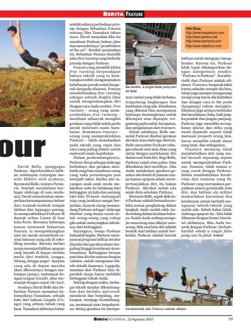 BERITAINDONESIA, 23 Agustus 2007 59BERITA FEATUREourDavid Belle, penggagasParkour, diperkenalkan latihan melampau rintangan metode Hébert oleh ayahnya,Raymond Belle, tentara Perancis. Setelah mendalami berbagai olahraga di usia mudanya, David memutuskan memperluas kemampuannya keluardari tembok-tembok tempatlatihan dan lapangan perang.Ia mempraktekkan Parkour didaerah urban Lisses di luarkota Paris. Bersama beberapateman termasuk SebastianFaucan, ia mengembangkanseni ini untuk mendobrak semua batasan yang ada di sekeliling mereka. Mereka berlaritanpa memperdulikan apapunyang berada di depan merekamulai dari tembok, tangga,lubang, hingga pagar. Apapunyang ada di depan merekaakan dilewatinya dengan melompat (jump), melompat dengan tangan (vault), atau memanjat dengan cepat (tic-tac).Awalnya David Belle dan Sebastian Faucan menamai kelompoknya Yamakasi, sebuahkata dari bahasa Lingala (Congo) yang artinya tubuh yangkuat. Yamakasi akhirnya bubarsetelah adanya perbedaan prinsip dengan Sebastian Faucantentang film Yamakasi tahun2001. David menyebut film itumembuat Parkour keluar jalurdan menyebutnya “prostitutionof the art”. Setelah perpisahanini, Sebastian Faucan memilihjalur free running yang berbedaprinsip dengan Parkour.Foucan yang memilih kiblatfree running berpendapatbahwa teknik yang ia kembangkan lebih mengutamakankebebasan penuh untuk bergerak daripada efisiensi. Foucanmendefinisikan free runningsebagai sebuah displin ilmuuntuk mengembangkan diridengan cara Anda sendiri. Freerunners - orang yang mempraktekkan free running -membuat sebanyak mungkingerakan yang tidak selalu perluuntuk melewati suatu hambatan. Sementara traceurs -orang yang mempraktekkanParkour – lebih menekankanpada teknik yang cepat dancara yang paling efisien untukmelewati suatu hambatan.Dalam perkembangannya,Parkour dicap sebagai olahragaberbahaya dan gerakan akrobatik yang bisa membuat orangyang suka petualangan punmenjadi takut. Ketika ada tayangan anak-anak muda melakukan salto ke belakang dariketinggian 25 kaki dan seoranglaki-laki Prancis melompatiatap yang jaraknya sangat berjauhan, banyak orang memandang Parkour sebagai ‘olahragaekstrim’ yang hanya cocok untuk orang-orang yang cukupgila untuk melayangkan tubuhnya dari ketinggian.Sayangnya, image Parkourbukanlah begitu. Parkour mempunyai program latihan teraturdimulai dari gerakan dasar berguling hingga kombinasi-kombinasinya. Ketinggian berapapun bisa dicoba namun dengancatatan, sudah menguasai teknik-teknik dasarnya. Lagipula,manfaat dari Parkour bisa diperoleh tanpa harus melebihiketinggian tubuh Anda.Seiring dengan waktu, berbagai teknik standar dikembangkan dan berlaku universal:mendarat dan berguling, melompat, menjaga keseimbangan, memanjat atau bergelayutan. Setiap gerakan ini mempunyai variasi yang tidak terbatas,tergantung lingkungan danhambatan yang ada. Hambatanyang ditemui bisa mempunyaibeberapa kemungkinan untukdilompati atau dipanjat, tergantung pada sudut, kecepatan,dan pengalaman dari traceurs.Itulah sebabnya, Belle menolak Parkour disebut gerakanakrobat atau olahraga ekstrim.Belle menyebut Parkour sebagai sebuah seni atau ilmu yangmirip dengan pertahanan diridalam seni bela diri. Bagi Belle,Parkour sejati atau palsu, bisadibedakan dari motifnya. JikaAnda melakukan gerakan-gerakan akrobatik di jalanan tanpa tujuan apapun selain mempertunjukkan diri, itu bukanParkour. Akrobat sudah adasejak dulu sebelum Parkour.Menurut Belle, aspek fisik dari Parkour adalah berusaha melalui semua penghalang dalamlangkah Anda seolah-olah Anda sedang dalam keadaan bahaya. Entah Anda sedang mengejar seseorang atau dikejar seseorang. Bila seni bela diri adalahbentuk dari latihan untuk berkelahi, Parkour adalah bentuklatihan untuk mengejar/menghindar. Karena itu, Parkourlebih tepat dikategorikan dengan kategorinya sendiri:“Parkour is Parkour”. Karakteristik dari Parkour adalah efisiensi. Traceurs, bergerak tidakhanya sekadar secepat dia bisa,tetapi juga mampu mengurangienergi yang harus dia habiskandan dengan cara to the point(langsung) sebisa mungkin.Efisiensi juga artinya terhindardari kecelakaan/luka, baik jangka pendek dan jangka panjang.Parkour juga memiliki serangkaian aturan dan etika yangmesti dipatuhi seperti tidakmerusak properti orang lain,harus memiliki teknik dasaryang kuat, dan sebagainya.Traceurs memang tidakmembutuhkan alat yang mahal kecuali sepasang sepatuuntuk mempraktekkan Parkour. Namun, tidak semua orang cocok dengan Parkour.Selain membutuhkan kreativitas dan stamina yang fit,Parkour yang merupakan perpaduan antara gymnastik, beladiri, dan latihan ala militermemerlukan kecintaan danketekunan untuk berlatih menguasai teknik-teknik yangsudah ada. Sebab kalau tidak,olahraga apapun itu - bila tidakdikuasai dengan benar bisa fatal akibatnya. Bila Anda tertarik dengan Parkour, berhatihatilah sebab a single falsejump can be fatal. MLPInfo Situs:http://americanparkour.comhttp://www.parkour.nethttp://www.parkourtv.comhttp://www.sfparkour.comBe careful, a single false jump canbe fatal.Karakteristik dari Parkour adalah efisien.