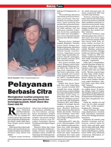 62 BERITAINDONESIA, 23 Agustus 2007BERITA PUBLIKPelayananBerbasis CitraMeningkatkan kualitas pelayanan danmenciptakan aparatur yang bersih danbertanggung jawab. Itulah obsesi BeaCukai saat ini.eformasi birokrasiyang dilakukanoleh Bea Cukai bukan sekadar lipsservice. Hal itu semakin dirasakan jajaran Bea Cukai danpara pengusaha di bidang ekspor-impor untuk tidak mainmain dengan aturan hukumyang ada.Keberanian Bea Cukai melakukan reformasi birokrasi merupakan langkah menciptakanbirokrasi yang efisien danefektif.Program utama birokrasitahun 2007 meliputi penataan organisasi, perbaikan sistem tata laksana, peningkatan manajemen, sumberdaya manusia dan perbaikanstruktur remunerasi denganberbasis kinerja serta kenaikan Tunjangan KhususPembinaan Keuangan Negara(TKPKN).Menurut Dirjen Bea CukaiAnwar Suprijadi, dedikasi terhadap customer merupakanperhatian utama. Kondisi itutidak lepas dari dukungan teknologi informasi yang semakinbaik dan UU Kepabean No. 17/2007.“Di era reformasi, kita harussiap untuk good governance,clean governance. Kita berlakukan reward dan punishment. Kami berharap bisamemberikan pelayanan kepada dunia usaha dan masyarakat lebih optimal. Dari sisipelayanan semakin maksimal, di sisi lain, pendapatanBea Cukai terus meningkat,”kata Anwar Suprijadi kepadaSamsuri dari Berita Indonesia.Menurut Anwar, berbagailangkah dilakukan. Pertama,proses bisnis dengan pendekatan kekuasaan, tujuannyauntuk perbaikan. Kedua, pendekatan kepada customer.Artinya, bagaimana prosesbisnis dapat memberikan kepuasan kepada pelanggan,baik melalui prioritas jalurhijau atau jalur merah.Kini proses berubah, kataAnwar. Sebagai contoh, keberadaan Kantor Pelayanan Utama (KPU) Bea Cukai di Tanjung Priok. Sebelumnya, adatiga kantor pelayanan, sekarang menjadi satu kanwil,yaitu Kantor Pelayanan Utama (KPU). Disederhanakandan dimaksimalkan pelayanannya.Diakui oleh Anwar Suprijadi, dari 1.300 orang karyawan, setelah berubah KPUmenjadi 842 orang. Sebaliknya karyawan yang mendaftardan ingin ditempatkan di KPUmencapai 4.000 orang, sedang yang lulus 1.800 orang.Untuk itu, dilakukan pemetaan dan kode etik kepatuhan.“Nantinya KPU akan dikembangkan di berbagai daerah,misalnya, Semarang, Surabaya, Bandara SoekarnoHatta, Batam dan diuji coba diKudus dan Kediri. Tentunyasecara bertahap,” tutur mantan Menteri Penertiban Aparatur Negara (Menpan) di eraGus Dur itu.Keberadaan KPU, jelas dia,perlu dikembangkan lebihjauh. Indikator pelayanan berbasis citra, telah meningkatkan penerimaan bea masukdan pajak sebesar Rp 700miliar per bulan. Sementarapendapatan Bea Cukai padasemester pertama tahun 2007ini sudah mencapai 53%. Dimana, remunerasi KPU dannon-KPU jelas berbeda.“Kriteria terhadap kepatuhan internal dan kinerjanyasecara terus menerus menjadidasar penilaian penerima remunerasi secara penuh, tetapiremunerasi perlu kerja samadengan instansi lain, sepertipelabuhan dan instansi terkait,” tuturnya.Reformasi birokrasi yangdikembangkan Bea Cukai tidak lepas dari kerja samadan koordinasi dengan KPK,kata Anwar lebih jauh, dimana indeks persepsi korupsi sangat tergantung dariindeks persepsi pelayananpublik. Misalnya, pelayananpublik kurang baik, sehinggaindeks persepsi korupsi tidakbagus. Untuk itu, KPK memantau apakah instansi patuhatau tidak terhadap aturanyang ada,” ungkapnya.Lebih jauh ia menjelaskan,kontrak pimpinan dengan bawahan, diantaranya yang dilakukan oleh KPU, supayamereka lebih baik dan lebihtertib. “Mereka yang bertugasdi jalur hijau untuk menyelesaikan pekerjaan dan dokumen selama 30 menit, yaharus sesuai dengan standaryang sudah ditetapkan, bahkan lebih cepat akan lebihbaik,” katanya.Mengoptimalkan pengawasan, ungkap Anwar, di antaranya dengan sidak. Ini bagiandari langkah-langkah internal,sistem kontrol yang dilakukandi Departemen Keuangan melalui Itjen (Inspektorat Jenderal).Untuk itu, melalui cek andricek, hal itu tidak menjadisoal. “Kita selalu mengembangkan diri,” jelasnya.Anwar berharap, Bea Cukaiyang dipimpinnya semakinbaik. Konsepnya, mematuhiaturan dan menjaga kepuasankonsumen.Kepuasan itu sesuatu yangdinamis, terutama soal pelayanan, semisal waktu 60menit, suatu saat lebih cepatdari itu akan lebih baik. Makaproses perubahan bisnis, penataan kelembagaan, peningkatan SDM yang didukungremunerasi, diharapkan semakin baik. RIRAnwar Suprijadi: Selalu mengembangkan diri.foto: berindo samsuri