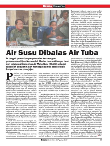 BERITAINDONESIA, 23 Agustus 2007 65BERITA HUMANIORAAir Susu Dibalas Air TubaDi tengah penantian penyelesaian kecuranganpelaksanaan Ujian Nasional di Medan dan sekitarnya, buahdari kejujuran Komunitas Air Mata Guru (KAMG) sebagaisaksi dan pelapor malah mendapat sanksi dari sekolahtempat mereka mengajar.uluhan guru pengawas ujiannasional (UN) 2007 di berbagaiSLTP dan SLTA sederajat, Medan dan sekitarnya, Kamis 26April 2007 berkumpul di Jalan Sei Merah,Medan, Sumatera Utara. Malam itu, mereka bersatu tekad akan membongkar kecurangan pelaksanaan UN yang mereka saksikan sampai tuntas. Saat itu, mereka jugasepakat menamakan komunitas merekadengan nama Komunitas Air Mata Guru(KAMG). Nama yang sengaja diambil,berdasarkan latar belakang serta misi perjuangan mereka mengungkap kecuranganpelaksanaan UN yang dilakukan oleh aparatpendidik sendiri.Kecurangan tersebut terjadi secarasistematis, mulai dari permintaan pihaksekolah agar guru pengawas itu mau bekerjasama dengan cara tidak terlalu kerasmengawas, memberi jawaban ujian kepada para peserta melalui secarik kertas,bahkan ada guru yang langsung membacakan jawaban di depan kelas saat ujianberlangsung.Tidak kuat melihat kecurangan itu,KAMG pun berusaha membongkarnya dengan melapor ke berbagai instansi sepertiDewan Pengawas, Dinas PendidikanProvinsi Sumatera Utara, bahkan keIstana Presiden. Namun, sejauh ini belumada tanggapannya.Ironisnya, akibat kejujuran merekamembongkar kecurangan tersebut, mereka mendapat “imbalan” menyakitkandari pihak sekolah bahkan dari kolegakolega mereka sesama guru. Oleh sesamaguru, mereka dianggap pahlawan kesiangan, sehingga dijauhkan. Beberapa orang dari KAMG, sejak awal juga sudahdikurangi jam mengajarnya oleh pihak sekolah, bahkan ada juga yang sudah dirumahkan. Puncaknya, “air tuba’ itu merekaterima pada awal tahun ajaran 2007-2008ini.Teriakan yang KAMG lontarkan selamaini melalui laporan ke berbagai instansiterkait, ditambah gencarnya pemberitaanmedia menyangkut masalah ini hampirtidak ada gunanya. Semua teriakan ituibarat bisikan di tengah gurun di telingapara pejabat pendidikan negeri ini. Parapejabat terkait seakan tidak mendengarapa yang dituntut KAMG selama ini. Terbukti, jangankan sanksi terhadap sekolahdan oknum guru pelaku kecurangan,keselamatan pekerjaan para anggotaKAMG saja pun tidak terlindungi. Merekayang berusaha meluruskan pelaksanaanUN ke jalur yang benar malah menerimahukuman yang benar-benar salah alamat.Awal tahun ajaran ini, dari 27 anggotaKAMG itu, 14 diantaranya dipecat oleh sekolah mereka dan 13 lainnya mendapatpengurangan jam mengajar. Sebenarnya,menurut Sekretaris KAMG Daud M Hutabarat, belum semua guru yang dikenaisanksi terdata. Ia perkirakan, masihbanyak guru lainnya yang terkena sanksi,tetapi belum berani menyuarakan. Sedihnya, mereka yang diberhentikan itu punkabarnya, bahkan tidak diberikan pesangon atau ‘uang terima kasih’.Sebenarnya, anggota komunitas ini sudah sadar, tindakan mereka mempunyairisiko. Namun, sebagian dari mereka tidakmenduga akan mendapat sanksi seberatitu, sebab kecurangan yang mereka bongkar bukan di sekolah tempat mereka mengajar tapi di sekolah lain. Dina Adrianiboru siregar (26), salah seorang yang dipecat misalnya, mengaku merasa biasa saja ketika memasuki tahun ajaran baru,maka ia berangkat ke sekolah sepertibiasa. Tapi ketika dipanggil pihak yayasan, ia merasa heran dikatakan tak usahmengajar lagi. “Yayasan hanya mengatakan, jika tak ada panggilan lagi, berarti saya tak mengajar untuk tahun ini. Sampaisekarang memang saya tak dipanggil lagi,”kata Dina seperti dikutip Tabloid Novaedisi No.1013/XX, Juli lalu. Sadarlah Dina, ia sudah diberhentikan dari pekerjaannya. Pemberhentian itu dirasakan semakin sakit sebab dilakukan pada awal ajaran baru, karena Dina dan temannya yanglain tidak punya kesempatan lagi untukmelamar ke sekolah lain. “Saya sudahdiperlakukan tak adil. Saya tak tahu mestibekerja di mana. Sekarang, kan tahunajaran baru sudah dimulai,” ujar Dina.Sementara 13 guru yang mendapatsanksi pengurangan jam mengajar, ratarata bekurang jam mengajarnya darisebelumnya sekitar 30-40 jam per pekan,menjadi 6-10 jam per pekan. Karenapengurangan itu, pendapatan mereka pundengan sendirinya jauh berkurang.Tapi walau mendapat tekanan sedemikian rupa, KAMG bertekad tak akan menyurutkan perjuangan. Menurut Daud M.Hutabarat, pihaknya akan mengambillangkah-langkah perlawanan sepertimenyusun kronologi pemberian sanksibagi 27 guru itu. “Nanti akan disampaikankepada kuasa hukum kami,” katanya.Mereka juga berencana mengadu keDPRD dan Komnas HAM. Dalam konteksitu, Ditjen Peningkatan Mutu Pendidikdan Tenaga Kependidikan Depdiknas,Fasli Jalal menyatakan, tetap memberiperlindungan kepada mereka. “Kami tidakakan membiarkan para guru itu sendiri.Pasti akan dilindungi. Departemen Pendidikan Nasional telah bekerja sama denganLKBH di 33 provinsi,” kata Fasli.Air mata guru belum berhenti. Mudahmudahan apa yang dikatakan Fasli tidakhanya janji. Karena semua anak bangsaterus menanti buah dari kejujuran. MSPKAMG berencana mengadu ke Komnas HAM. foto: repro kompas