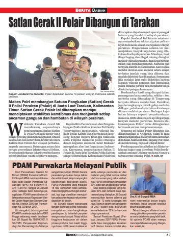 BERITAINDONESIA, 06 September 2007 51Satlan Gerak II Polair Dibangun di TarakanMabes Polri membangun Satuan Pangkalan (Satlan) GerakII Polisi Perairan (Polair) di Juata Laut Tarakan, KalimantanTimur. Satlan Gerak Polair ini diharapkan mampumenciptakan stabilitas kamtibmas dan menjawab setiapancaman ganguan dan hambatan di wilayah perairan.alikota Tarakan Jusuf SKmendukung sepenuhnyapembangunan Markas SatlanII Polair sebagai unsur yangsangat penting dalam menciptakan situasikeamanan dan ketertiban di wilayah utaraKalimantan Timur dan wilayah perbatasan pada umumnya. Dukungan antara lainberupa penyediaan lahan seluas 5 Hektar.Proses pembebasan lokasi tersebut hanyamembutuhkan waktu sekitar 3 minggu.Kepala Biro Perencanaan dan Pengembangan Polda Kaltim Kombes Pol.DeddyWoeryantono menyatakan, wilayah hukum Polda Kaltim yang berbatasan langsung dengan negara tetangga Malaysiaserta Filipina memiliki posisi strategisdalam kegiatan ekonomi. Selat Makasarmerupakan alur laut kepulauan Indonesia. Karenanya, pembangunan Satlan IIPolair di Juata laut Tarakan Polda Kaltimsangat dibutuhkan. Keberadaan Polair inidiharapkan dapat menjadi aparat penegakhukum yang handal di wilayah perairan.Kapolri Jenderal Pol.Sutanto sebelumnya menyebutkan, sekitar 2/3 atau 70% wilayah Indonesia adalah merupakan wilayahperairan. Pengalaman selama ini menunjukkan, banyak kejahatan yang dilakukan di wilayah perairan. Misalnya, hasilillegal loging dan illegal mining diangkutmelalui wilayah perairan, dan illegal fishingsudah jelas terjadi diperairan. Narkoba punternyata dikirim melalui lautan. Karena jikamelalui daratan atau melalui udara sangatterbatas jumlah yang bisa dibawa danmudah dideteksi dan ditangkap. Sementarajika melalui laut sulit dideteksi karenaluasnya wilayah perairan dan banyaknyapulau dimana perahu bisa mendarat tanpadiketahui petugas keamanan.Berdasarkan hasil yang dicapai dalampenanganan kasus narkoba, sekitar 1 tonnarkoba yang ditangkap di Tangerangternyata dibawa melalui laut. Demikianjuga terungkapnya pabrik gelap narkobadi Bogor, puluhan drum bahan kimiamyadibawa melalui perairan. Berbagai kejahatan lainnya seperti penyelundupanmanusia, BBM dan senjata api illegal jugabanyak melalui perairan. Karena itu,kemampuan Polair terus ditingkatkantermasuk sarana dan prasarananya.Sekarang ini Satlan Polair dibangun dandikembangkan di 5 wilayah. Yakni di Riauuntuk mengatisipasi di wilayah barat, kemudiandi Tarakan, Sulawesi Utara, Kupang (NTT) dandi daerah Sorong, Papua di wilayah timur.Pembangunan lima Satlan ini dilatarbelakangi tugas yang diemban Polisi berdasarkan amanat Undang-undang Nomor 2tahun 2002 tentang Polri. ASM, SPWBERITA DAERAHPDAM Purwakarta Melayani PublikDirut Perusahaan Daerah AirMinum (PDAM) Purwakarta Drs.H.Idi Suryadi MBA membantah kalauhasil audit Badan Pemeriksa Keuangan (BPK) No 50/5/XIV,11-XIV.11.3/01/07, tanggal 25 Januari2007 sebagai bukti buruknya pengelolaan PDAM karena belum dilaksanakan sesuai Keputusan Menteri Dalam Negeri dan Otonomi Daerah No. 8 tahun 2000 dan Permendagri No. 02 tahun 2007.Idi mengakui, tata organisasiPDAM Purwakarta sejak tahun1983hingga sekarang masih berdasarkan SK Bupati No 188/HK/021.1/SK/1983. Penyesuaian Kepmendagri dan Permendagri itu dinilainyasangat menyulitkan PDAM. Karenapersoalannya bukan hanya teknisdan administrasi, tetapi menyangkutkepentingan pelayanan publik.PDAM Purwakarta yang melayani18 ribu konsumen tidak sematamata mengejar keuntungan komersial, tapi juga diarahkan mewujudkan pelayanan kepada rakyat mendapatkan air bersih.Idi Suryadi dalam wawancaradengan wartawan Berita Indonesia,menyatakan, membengkaknyapembiayaan itu bukanlah penyelewengan atau korupsi. Tetapi akibattingginya kebocoran air dalamproses produksi dan masih tingginya losses di titik rawan instalasi airserta adanya pencurian air danmeteran yang tidak normal akibatulah konsumen yang nakal. Akibatnya, PDAM kehilangan pendapatan10% lebih dari anggaran per tahun.Soal belanja pegawai yang melebihi 30% dari rencana biaya operasional yang ditetapkan, Idi Suryadimenyebutkan karena adanya gajibulan ke 13 serta tunjangan hariraya. Namun dalam penganggarantb 2007 sudah bisa diturunkansesuai ketentuan 30% dari rencanabiaya operasional.Sesuai Peraturan Bupati (Perbup) January 2007 PDAM Purwakarta bisa mengajukan kenaikantarif. Namun karena kondisi ekonomi masyarakat belum begitumembaik, maka langkah tersebutbelum dilaksanakan.Tetapi dengan efisiensi sertamengoptimalkan perawatan peralatan serta tata kelola yang lebih baik,Idi optimis PDAM akan mampumencapai laba sesuai yang ditargetkan. BRD, SPDrs.H. Idi Suryadi MBAKapolri Jenderal Pol.Sutanto: Polair diperlukan karena 70 persen wilayah Indonesia adalahperairan.foto: berindo wilson