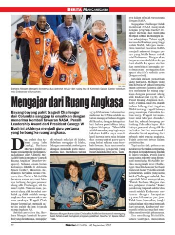 52 BERITAINDONESIA, 06 September 2007BERITA MANCANEGARAMengajar dari Ruang AngkasaBayang-bayang pahit tragedi Challengerdan Columbia sanggup ia enyahkan denganmenerima kembali tawaran NASA. PeraihLeadership Award dari President George WBush ini akhirnya menjadi guru pertamayang terbang ke ruang angkasa.ua puluh dua tahun yang lalu(1985), BarbaraMorgan dipilih sebagai pendamping (pengganti/cadangan) dari Christa McAuliffe untuk program ‘Guru diRuang Angkasa’ (teacher-inspace). Selama enam bulankeduanya dilatih di JohnsonSpace Center, Houston. Semuanya berjalan sesuai rencana dan Christa McAuliffebersama enam astronot lainnya terbang dengan pesawatulang alik Challenger, 28 Januari 1986. Namun naas, pesawat ulang alik tersebut meledak 73 detik setelah mengangkasa dan menewaskan semua awaknya. Tragedi Challenger kemudian menjadi catatan pahit dalam sejarahruang angkasa AS.Setelah peristiwa itu, Barbara Morgan kembali ke profesi yang dicintainya, mengajardi sebuah sekolah di Idaho.Sebelum mengajar di Idaho,Morgan memulai profesi gurudengan menjadi guru matematika dan membaca tahun1974 di Montana. Ia kemudianmelamar ke NASA setelah setahun mengajar bahasa Inggrisdi Ekuador, dengan keteguhanhati bahwa pendidikan tetaptujuan hidupnya. “Mendidikadalah sesuatu yang ingin sayalakukan ketika saya masihkecil karena saya suka belajardan mempunyai guru-guruyang hebat selama saya tumbuh dewasa. Saya rasa merekamempunyai pengaruh yangbesar dalam hidup saya,” katanya dalam sebuah wawancaradengan NASA.Kegagalan Challenger tidakmembuat NASA menyerahdengan program teacher-inspace mereka dan memintaMorgan untuk menunggu kabar selanjutnya. Tahun 1998,karena dedikasinya yang tinggiuntuk NASA, Morgan menerima kembali tawaran NASAmenjadi astronot dengan peran yang lebih besar untukmisi Endeavour. Morgan akanberperan memindahkan kargodari shuttle ke space stationdan merelokasi kerangka penyimpanan menggunakanspace shuttle’s robotic arm(lengan robot).Setelah dalam penantianyang panjang, Morgan yangkini berusia 55 tahun bersamaenam astronot lainnya akhirnya meluncur ke ruang angkasa dengan pesawat ulangalik Endeavour (9/8), dariPusat Ruang Angkasa Kennedy, Florida. Saat itu, masihbelum hilang dari ingatanNASA tentang tragedi lainnyayang menimpa Columbia tahun 2003. Tragedi ini membuat misi Morgan diundur.Saat itu, sebuah lempeng pelindung Columbia lepas. Akibatnya, pesawat ulang alik ituterbakar ketika memasukiatmosfer bumi sepulang darisebuah misi ruang angkasa.Tujuh astronot tewas dalamperistiwa itu.Tapi syukurlah, peluncuranEndeavour berjalan sempurna.Morgan dengan tenang dudukdi kursi tengah. Posisi kursiyang sama seperti yang ditempati mendiang McAuliffe ketika mengikuti misi Challenger. Saat Endeavour berhasilmelewati batas 73 detik setelahpeluncuran, waktu yang samaketika Challenger meledak, Pengendali Misi menyatakan,“Untuk Barbara Morgan dankru, pelajaran dimulai.” Roketpendorong terpisah sekitar duamenit setelah Endeavour meluncur dengan kecepatan24.000 kilometer per jam.Tidak lama kemudian, tangkibahan bakar eksternal terpisahdari pesawat. Endeavour memasuki orbit kurang dari sembilan menit setelah peluncuran.Ibu mendiang McAuliffe,Grace Corrigan, menontonDBarbara Morgan (tengah) bersama dua astronot keluar dari ruang kru di Kennedy Space Center sebelummisi Endeavour diluncurkan.Barbara Morgan (kanan) dan Christa McAuliffe berfoto sambil memeganghelm NASA saat mengikuti program pelatihan Teacher in Space tahun1985.foto: nasafoto: nasa