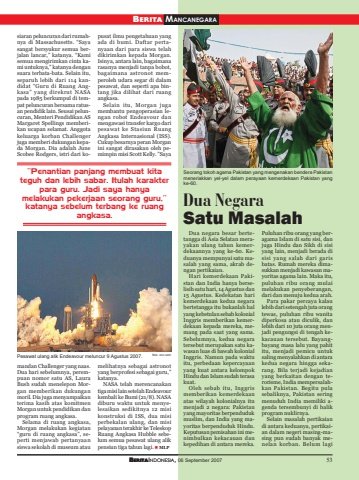 BERITAINDONESIA, 06 September 2007 53BERITA MANCANEGARADua NegaraSatu MasalahDua negara besar bertetangga di Asia Selatan merayakan ulang tahun kemerdekaannya yang ke-60. Keduanya mempunyai satu masalah yang sama, akrab dengan pertikaian.Hari kemerdekaan Pakistan dan India hanya berselisih satu hari, 14 Agustus dan15 Agustus. Kedekatan harikemerdekaan kedua negarabertetangga itu bukanlah halyang kebetulan sebab kolonialInggris memberikan kemerdekaan kepada mereka, memang pada saat yang sama.Sebelumnya, kedua negaratersebut merupakan satu kawasan luas di bawah kolonialInggris. Namun pada waktuitu, perbedaan kepercayaanyang kuat antara kelompokHindu dan Islam sudah terasakuat.Oleh sebab itu, Inggrismemberikan kemerdekaanatas wilayah kolonialnya itumenjadi 2 negara: Pakistanyang mayoritas berpendudukmuslim, dan India yang mayoritas berpenduduk Hindu.Keputusan pemisahan ini menimbulkan kekacauan dankepedihan di antara mereka.Puluhan ribu orang yang beragama Islam di satu sisi, danjuga Hindu dan Sikh di sisiyang lain, menjadi berada disisi yang salah dari garisbatas. Rumah mereka dimasukkan menjadi kawasan mayoritas agama lain. Maka itu,puluhan ribu orang mulaimelakukan penyeberangan,dari dan menuju kedua arah.Para pakar percaya kalaulebih dari setengah juta orangtewas, puluhan ribu wanitadiperkosa atau diculik, danlebih dari 10 juta orang menjadi pengungsi di tengah kekacauan tersebut. Bayangbayang masa lalu yang pahititu, menjadi pemicu untuksaling menyalahkan di antarakedua negara hingga sekarang. Bila terjadi kejadianyang berkaitan dengan terorisme, India mempersalahkan Pakistan. Begitu pulasebaliknya, Pakistan seringmenuduh India memiliki agenda tersembunyi di balikprogram nuklirnya.Selain masalah pertikaiandi antara keduanya, pertikaian dalam negeri masing-masing pun sudah banyak menelan korban. Belum lagiBERITAINDONESIA, 06 September 2007 53Seorang tokoh agama Pakistan yang mengenakan bendera Pakistanmeneriakkan yel-yel dalam perayaan kemerdekaan Pakistan yangke-60.siaran peluncuran dari rumahnya di Massachusetts. “Sayasangat bersyukur semua berjalan lancar,” katanya. “Kamisemua mengirimkan cinta kami untuknya,” katanya dengansuara terbata-bata. Selain itu,separuh lebih dari 114 kandidat “Guru di Ruang Angkasa” yang direkrut NASApada 1985 berkumpul di tempat peluncuran bersama ratusan pendidik lain. Seusai peluncuran, Menteri Pendidikan ASMargaret Spellings memberikan ucapan selamat. Anggotakeluarga korban Challengerjuga memberi dukungan kepada Morgan. Dia adalah JuneScobee Rodgers, istri dari kopusat ilmu pengetahuan yangada di bumi. Daftar pertanyaan dari para siswa telahdikirimkan kepada Morgan.Isinya, antara lain, bagaimanarasanya menjadi tanpa bobot,bagaimana astronot memperoleh udara segar di dalampesawat, dan seperti apa bintang jika dilihat dari ruangangkasa.Selain itu, Morgan jugamembantu pengoperasian lengan robot Endeavour danmengawasi transfer kargo daripesawat ke Stasiun RuangAngkasa Internasional (ISS).Cukup besarnya peran Morganini sangat dirasakan oleh pemimpin misi Scott Kelly. ”Sayamandan Challenger yang naas.Dua hari sebelumnya, perempuan nomor satu AS, LauraBush sudah menelepon Morgan memberikan dukunganmoril. Dia juga menyampaikanterima kasih atas komitmenMorgan untuk pendidikan danprogram ruang angkasa.Selama di ruang angkasa,Morgan melakukan kegiatan“guru di ruang angkasa”, seperti menjawab pertanyaansiswa sekolah di museum ataumelihatnya sebagai astronotyang berprofesi sebagai guru,”katanya.NASA telah merencanakantiga misi lain setelah Endeavourkembali ke Bumi (21/8). NASAdiburu waktu untuk menyelesaikan sedikitnya 12 misikonstruksi di ISS, dua misiperbekalan ulang, dan misipelayanan terakhir ke TeleskopRuang Angkasa Hubble sebelum semua pesawat ulang alikpensiun tiga tahun lagi. MLP“Penantian panjang membuat kitateguh dan lebih sabar. Itulah karakterpara guru. Jadi saya hanyamelakukan pekerjaan seorang guru,”katanya sebelum terbang ke ruangangkasa.Pesawat ulang alik Endeavour meluncur 9 Agustus 2007. foto: cnn.com