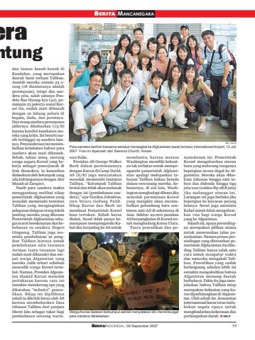 BERITAINDONESIA, 06 September 2007 55BERITA MANCANEGARAerantungdan taman kanak-kanak diKandahar, yang merupakandaerah basis terkuat Taliban.Jumlah mereka semula 23 orang (18 diantaranya adalahperempuan), tetapi dua sandera pria, salah satunya Pendeta Bae Hyung-kyu (42), pemimpin 23 pekerja sosial Korsel itu, sudah mati dibunuhdengan 10 lubang peluru dikepala, dada, dan perutnya.Dua orang sandera perempuanakhirnya dibebaskan (13/8)karena kondisi kesehatan mereka yang kritis. Ini berarti masih tertinggal 19 sandera lainnya. Penyanderaan ini menimbulkan ketakutan bahwa parasandera akan mati dibunuh.Sebab, tahun 2004, seorangwarga negara Korsel yang bekerja sebagai penerjemah diIrak disandera. Ia kemudiandieksekusi oleh kelompok yangada hubungannya dengan AbuMusab al-Zarqawi.Nasib para sandera makinmenggantung melihat sikappemerintah Afghanistan yangmenolak memenuhi tuntutanTaliban yang menginginkanpelepasan delapan orang tokohpenting mereka yang ditawanPemerintah Afghanistan sebagai syarat keselamatan dan kebebasan 19 sandera NegeriGingseng. Taliban juga meminta pembebasan 10 pengikut Taliban lainnya untukpembebasan satu tawananJerman (satu tawanan lagisudah mati dibunuh) dan empat warga Afganistan yangmereka culik sehari sebelummenculik warga Korsel tersebut. Namun, Presiden Afganistan Hamid Karzai menolakpertukaran karena cara inisemakin mendorong apa yangdikatakan “industri” penculikan. Sikap ini dipilihnyasebab ia dikritik keras oleh ASkarena membebaskan limatahanan Taliban dari penjaraMaret lalu sebagai tukar bagipembebasan seorang wartawan Italia.Presiden AS George WalkerBush dalam pertemuannyadengan Karzai di Camp David,AS (6/8) juga menyatakanmenolak memenuhi tuntutanTaliban. “Kelompok Talibanbrutal dan tidak akan melunakdengan ini (pembebasan sandera),” ujar Gordon Johndroe,juru bicara Gedung Putih.Sikap Karzai dan Bush inimembuat Pemerintah Korselkian tertekan. Sebab harusdiakui, Seoul tidak punya kemampuan mempengaruhi Kabul dan berpaling ke AS untukmembantu, karena merasaWashington memiliki kekuatan tak terbatas untuk mempengaruhi pemerintah Afghanistan apalagi melepaskan tahanan Taliban bukan beradadalam wewenang mereka. Sebenarnya, di sisi lain, Washington menghadapi dilema jikamenolak permintaan Korselyang mungkin akan menimbulkan gelombang baru sentimen anti-AS di sekutunya diAsia. Sekitar 29.000 pasukanAS berpangkalan di Korsel untuk menghadang Korea Utara.Pasca penculikan dan penyanderaan ini, PemerintahKorsel mengeluarkan aturanbaru yang melarang warganyabepergian secara ilegal ke Afganistan. Mereka akan dihukum tahanan hingga satu tahun dan didenda hingga tigajuta won (sekitar Rp 28,8 juta)jika melanggar aturan ini.Larangan ini juga berlaku jikabepergian ke kawasan peranglainnya. Seoul juga memintaKabul untuk tidak mengeluarkan visa bagi warga Korselyang ke Afganistan.Sejauh ini, upaya perundingan merupakan pilihan utamauntuk menemukan jalan penyelesaian. Namun proses perundingan yang ditawarkan pemerintah Afghanistan itu dituding Taliban hanya salah satucara untuk mengulur waktudan mencoba mengakali Taliban. Penculikan yang sudahberlangsung sebulan lebih inisemakin mengukuhkan bahwaAfganistan memang daerahberbahaya. Fakta itu juga menjelaskan bahwa Taliban tetapmerupakan kekuatan yang harus diperhitungkan di Afganistan. Oleh sebab itu, komunitasinternasional harus terus melakukan segala upaya untukmenghindarkan kekerasan danpertumpahan darah. MLPPara sandera berfoto bersama sebelum berangkat ke Afghanistan lewat Incheon International Airport, 13 Juli2007. Foto ini diperoleh dari Sammul Church, Korsel.foto: ctv.caWarga Korea Selatan berkumpul sambil menyalakan lilin meminta agarpara sandera dibebaskan.foto: abc.net.au