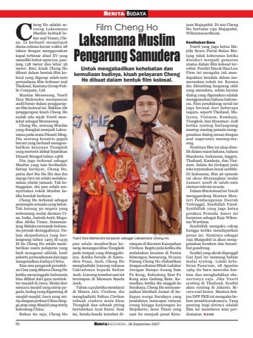 56 BERITAINDONESIA, 06 September 2007BERITA BUDAYAFilm Cheng HoLaksamana MuslimPengarung SamuderaUntuk mengabadikan kehebatan dankemuliaan budinya, kisah pelayaran ChengHo dibuat dalam bentuk film kolosal.heng Ho adalah seorang LaksamanaMuslim berbudi luhur asal Yunan, China. Ia berhasil menjelajahdunia selama kurun waktu 28tahun dengan menggunakankapal terbesar abad XV yangmemiliki bobot 2500 ton, panjang 138 meter dan lebar 56meter. Kini, kisah Cheng Hodibuat dalam bentuk film kolosal yang digarap salah-satuperusahaan film terbesar asalThailand, Kantana Group Public Company, Ltd.Mantan Mensesneg, YusrilIhza Mahendra mempunyaiandil besar dalam penggarapan film kolosal ini. Bahkan idepenggarapan kisah Cheng Hosudah ada sejak Yusril menjabat sebagai Mensesneg.Cheng Ho, seorang Muslimyang diangkat menjadi Laksamana pada masa Dinasti Ming.Dia seorang kesatria gagahberani yang berhasil mengembalikan kejayaan Tiongkokyang merosot akibat kejatuhanDinasti Mongol tahun 1368.Dia juga terkenal sebagaiMuslim yang taat beribadah.Setiap berlayar, Cheng Ho,putra dari Ma Ha Zhi dan ibumarga Oen ini selalu melaksanakan shalat jamaah. Tak ketinggalan, dia pun selalu menyertakan tokoh Muslim ketika hendak berlayar.Cheng Ho terkenal sebagaipemimpin armada yang hebat.Tak kurang 30 negara yangterbentang mulai daratan Cina, India, Jazirah Arab, Mogadisu Afrika Timur, Semenanjung Malaka termasuk Indonesia pernah disinggahinya. Dalam ekspedisinya yang berlangsung tahun 1405 M-1433M itu Cheng Ho selalu memberikan suatu pelajaran yangbaik mengenai akhlak, budipekerti, persaudaraan dan jugamengenalkan budaya China.Sisa-sisa pengaruh peradaban Cina yang dibawa Cheng Hoketika menyinggahi Indonesiabisa dilihat dari gaya arstitektur masjid di Jawa. Mulai darimenara masjid yang mirip pagoda, bedug yang digantung dimasjid-masjid Jawa yang mirip dengan perkusi China hingga atap-atap Masjid yang miripkelenteng China.Bukan itu saja, Cheng Hopun selalu memberikan kenang-kenangan khas Tiongkokpada tempat yang disinggahinya. Ketika berada di Samudera Pasai, Aceh, Cheng Homenghadiahi lonceng raksasaCakradonya kepada SultanAceh. Lonceng tersebut saat initersimpan di Museum BandaAceh.Tahun 1415 ketika mendaratdi Muara Jati, Cirebon, diamenghadiahi Sultan Cirebonsebuah cindera mata khasTiongkok dan sebuah piringbertuliskan Ayat Kursi. Saatini, benda-benda tersebut disimpan di Keraton KasepuhanCirebon. Begitu pula ketika diamelakukan lawatan di PantaiSimongan, Semarang. Di sanaPatung Cheng Ho diabadikandengan sebutan Mbah LedakarJuragan Dampo Awang SamPo Kong, Kelenteng Sam PoKong atau Gedung Batu. Kemudian, ketika dia singgah keSurabaya, Cheng Ho menyampaikan khotbah Jumat di hadapan warga Surabaya yangjumlahnya mencapai ratusanorang hingga kunjungan keMojokerto, Jawa Timur yangsaat itu menjadi pusat Kerajaan Majapahit. Di sini ChengHo bertemu raja Majapahit,Wikramawardhana.Kesibukan BaruYusril yang juga ketua Majelis Syuro Partai Bulan Bintang tidak keberatan ketikadisodori menjadi pemeranutama dalam film kolosal tersebut. Pendiri Ihza & Ihza LawFirm ini mengaku tak mendapatkan kendala dalam memerankan tokoh ini. Karenadia dibimbing langsung olehsang sutradara, selain karenadialog yang digunakan adalahmenggunakan bahasa Indonesia. Para pendukung serial inijuga berasal dari beberapanegara, seperti Thailand, Malaysia, Vietnam, Kamboja,Tiongkok, dan Myanmar. Jadiketika syuting berlangsungmasing-masing pemain menggunakan dialog sesuai denganasal negaranya masing-masing.Nantinya film ini akan disulih dalam enam bahasa, bahasaMandarin, Indonesia, Inggris,Thailand, Kamboja, dan Vietnam. Selain itu terdapat pulateks terjemahan lewat subtitle.Di Indonesia, film 26 episodeini akan ditayangkan mulaiJanuari 2008 di salah-satustasiun televisi swasta.Dalam film kolosal ini Yusrilmenggandeng Mantan Menteri Pembangunan DaerahTertinggal, Syaifullah Yusuf.Syaifullah yang juga ketuagerakan Pemuda Ansor iniberperan sebagai Raja Wikrama Wardana.Syaifullah mengaku cukupbangga ketika mendapatkanperan ini. Nantinya sebagairaja Majapahit ia akan menggunakan kemben dan berambut gondrong.Syaiful yang akrab dipanggilGus Ipul ini memang belummulai syuting. Lelaki kelahiran Pasuruan, 28 Agustus1964 itu baru mencoba kostum dan menghafalkan skenarionya saja. Jika Yusrilsyuting di Thailand, Syaifulakan syuting di Jakarta. Bicara soal honor, Mantan Sekjen DPP PKB ini mengaku belum membicarakannya. Yangpenting bagi dirinya adalahfilm ini membawa misi perdamaian. ZAHCfoto: repro suara pembaruanYusril Ihza Mahendra berperan sebagai Laksamana Cheng Ho