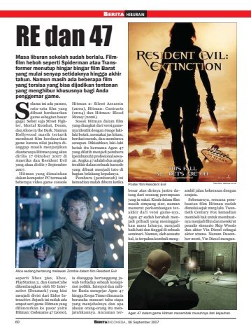 60 BERITAINDONESIA, 06 September 2007BERITA HIBURANRE dan 47Masa liburan sekolah sudah berlalu. Filmfilm heboh seperti Spiderman atau Transformer menutup hingar bingar film Baratyang mulai senyap setidaknya hingga akhirtahun. Namun masih ada beberapa filmyang tersisa yang bisa dijadikan tontonanyang menghibur khususnya bagi Andapenggemar game.elama ini ada pameo,rata-rata film yangdibuat berdasarkangame sebagian besargagal. Sebut saja Street Fighter, Mortal Kombat, Doom,dan Alone in the Dark. NamunHollywood masih tertarikmembuat film berdasarkangame karena nilai jualnya dianggap masih menjanjikandiantaranya Hitman yang akandirilis 17 Oktober 2007 diAmerika dan Resident Evilyang akan dirilis 7 September2007.Hitman yang dimainkandalam komputer PC termasukbeberapa video game consoleHitman 2: Silent Assassin(2002), Hitman: Contracts(2004) dan Hitman: BloodMoney (2006).Sosok Hitman dalam filmyang diangkat dari versi gamenya identik dengan image lakilaki botak, memakai jas hitam,berdasi merah, dan membawasenapan. Dikisahkan, laki-lakibotak itu bernama Agen 47yang dilatih menjadi pemburu(pembunuh) profesional sewaan. Angka 47 adalah dua angkaterakhir dalam sebuah barcodeyang dibuat menjadi tato dibagian belakang kepalanya.Pemburu (pembunuh) inikemudian malah diburu ketikaSfoto-foto: allocine.co.ukbesar atas dirinya justru datang dari seorang perempuanyang ia sukai. Kisah dalam filmmasih simpang siur, namunmenurut perkembangan terakhir dari versi game-nya,Agen 47 sudah berubah menjadi pribadi yang meninggalkan masa lalunya, menjadibaik hati dan tinggal di sebuahseminari. Namun, oleh sesuatuhal, ia terpaksa kembali mengambil jalan kekerasan dengansenjata.Sebenarnya, rencana pembuatan film Hitman sudahdimulai sejak 2003 lalu. Twentieth Century Fox kemudianmembeli hak untuk membuatnya menjadi film dan merekrutpenulis skenario Skip Woodsdan aktor Vin Diesel sebagaiaktor utama. Namun Desember 2006, Vin Diesel mengunseperti Xbox 360, Xbox,PlayStation 2, dan GameCubedikembangkan oleh IO Interactive (Denmark) yang kinimenjadi divisi dari Eidos Interactive. Sejauh ini sudah adaempat seri game Hitman yangdiluncurkan ke pasar yaituHitman: Codename 47 (2000),ia dianggap bertanggung jawab terhadap sebuah konspirasi politik. Interpol dan militer Rusia mengejar Agen 47hingga Eropa Timur dimana iaberusaha mencari tahu siapayang menjebaknya dan apaalasan orang-orang itu menjatuhkannya. Ancaman terPoster film Resident EvilAlice sedang bertarung melawan Zombie dalam film Resident EvilAgen 47 dalam game Hitman menembak musuhnya dari kejauhan