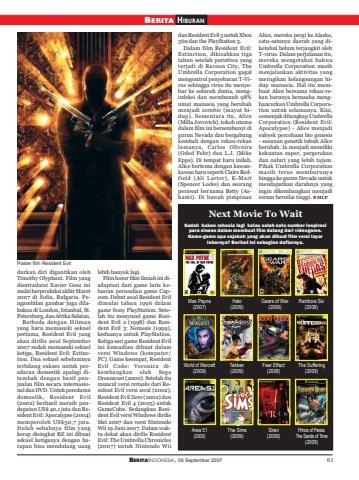 BERITAINDONESIA, 06 September 2007 61BERITA HIBURANNext Movie To WaitMax Payne(2007)Halo(2009)Gears of War(2009)Rainbow Six(2008)World of Warcraft(2009)Tekken(2009)Fear Effect(2008)The Suffering(2009)Area 51(2009)The Sims(2009)Siren(2009)Prince of Persia:The Sands of Time(2009)durkan diri digantikan olehTimothy Olyphant. Film yangdisutradarai Xavier Gens inimulai berproduksi akhir Maret2007 di Sofia, Bulgaria. Pengambilan gambar juga dilakukan di London, Istanbul, St.Petersburg, dan Afrika Selatan.Berbeda dengan Hitmanyang baru memasuki sekuelpertama, Resident Evil yangakan dirilis awal September2007 sudah memasuki sekuelketiga, Resident Evil: Extinction. Dua sekuel sebelumnyaterbilang sukses untuk peredaran domestik apalagi ditambah dengan hasil penjualan film secara internasional dan DVD. Untuk peredarandomestik, Resident Evil(2002) berhasil meraih pendapatan US$ 40,1 juta dan Resident Evil: Apocalypse (2004)memperoleh US$50,7 juta.Itulah sebabnya film yangkerap disingkat RE ini dibuatsekuel ketiganya dengan harapan bisa mendulang uanglebih banyak lagi.Film horor fiksi ilmiah ini diadaptasi dari game laris keluaran perusahan game Capcom. Debut awal Resident Evildimulai tahun 1996 dalamgame Sony PlayStation. Setelah itu menyusul game Resident Evil 2 (1998) dan Resident Evil 3: Nemesis (1999),keduanya untuk PlayStation.Ketiga seri game Resident Evilini kemudian dibuat dalamversi Windows (komputer/PC). Game keempat, ResidentEvil Code: Veronica dikembangkan oleh SegaDreamcast (2000). Setelah itumuncul versi remake dari Resident Evil versi awal (2002),Resident Evil Zero (2002) danResident Evil 4 (2005) untukGameCube. Sedangkan Resident Evil versi Windows dirilisMei 2007 dan versi NintendoWii 19 Juni 2007. Dalam waktu dekat akan dirilis ResidentEvil: The Umbrella Chronicles(2007) untuk Nintendo Wiidan Resident Evil 5 untuk Xbox360 dan the PlayStation 3.Dalam film Resident Evil:Extinction, dikisahkan tigatahun setelah peristiwa yangterjadi di Racoon City, TheUmbrella Corporation gagalmengontrol penyebaran T-Virus sehingga virus itu menyebar ke seluruh dunia, menginfeksi dan membunuh 98%umat manusia yang berubahmenjadi zombie (mayat hidup). Sementara itu, Alice(Milla Jovovich), tokoh utamadalam film ini bersembunyi digurun Nevada dan bergabungkembali dengan rekan-rekanlamanya, Carlos Oliveira(Oded Fehr) dan L.J. (MikeEpps). Di tempat baru inilah,Alice bertemu dengan kawankawan baru seperti Claire Redfield (Ali Larter), K-Mart(Spencer Locke) dan seorangperawat bernama Betty (Ashanti). Di bawah pimpinanAlice, mereka pergi ke Alaska,satu-satunya daerah yang diketahui belum terjangkit olehT-virus. Dalam perjalanan itu,mereka mengetahui bahwaUmbrella Corporation masihmenjalankan aktivitas yangmerugikan kelangsungan hidup manusia. Hal itu membuat Alice bersama rekan-rekan barunya berusaha menghancurkan Umbrella Corporation untuk selamanya. Kini,semenjak ditangkap UmbrellaCorporation (Resident Evil:Apocalypse) - Alice menjadisubyek percobaan bio genesis- susunan genetik tubuh Aliceberubah. Ia menjadi memilikikekuatan super, pergerakandan naluri yang lebih tajam.Pihak Umbrella Corporationmasih terus memburunyahingga ke gurun Nevada untukmendapatkan darahnya yangingin dikembangkan menjadiserum bernilai tinggi. MLPSudah bukan rahasia lagi kalau salah satu sumber inspirasipara sineas dalam membuat film datang dari videogame.Game-game apa sajakah yang akan dibuat film versi layarlebarnya? Berikut ini sebagian daftarnya.Poster film Resident Evil