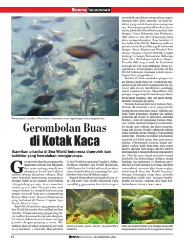 64 BERITAINDONESIA, 06 September 2007BERITA LINGKUNGANGerombolan Buasdi Kotak KacaIkan-ikan piranha di Sea World Indonesia diperoleh darikolektor yang kewalahan mengurusnya.erombolan ikan buas menyerbuikan emas seberat dua kilogramdan ayam potong yang dicemplungkan ke dalam habitatbuatan berupa akuarium raksasa. Ikanbuas tersebut menyantap mangsanyadengan tidak kenal ampun menyisakantulang-tulangnya saja. Acara memberimakan 3.000 ekor ikan piranha asalsungai Amazon itu menjadi tontonan yangsangat menarik bagi para pengunjungTaman Biota Laut Seaworld Indonesiayang berlokasi di Taman Impian JayaAncol, Jakarta Utara.Sejak didirikan tahun 1994, pengunjungSea World Indonesia bisa melihat 20 ikanpiranha. Tetapi sekarang pengunjung dapat melihat kawanan ikan piranha berjumlah ribuan dalam akuarium besar setinggi3 meter dengan panjang 4 meter. Kehadiran ikan tersebut menandai hari jadike-13 SeaWord, 3 Juni lalu. Ikan piranhadi Sea World itu, menurut Yongki E. Salim,Presiden Direktur Sea World Indonesia,tidak hanya dari habitat aslinya di perairantawar Amerika Selatan, tetapi juga dari parakolektor ikan hias di dalam negeri.Seperti diutarakannya kepada Gatra, 5-11 Juli 2007, Sea World Indonesia yangmemiliki 3.550 spesies ikan laut maupuntawar baik dari dalam maupun luar negeri,memperoleh ikan piranha itu dari kolektor yang sudah kewalahan mengurusnya. Saat mengumpulkan ikan-ikan piranha itu, pihak Sea World berkonsultasi duludengan Dinas Kelautan dan PerikananDKI Jakarta. Sea World berjanji tidakakan mengembangkan ikan tersebut diluar habitat Sea World. Sebab memeliharapiranha sebetulnya dilarang di Indonesiadengan Surat Keputusan Menteri Pertanian Nomor 179/KPTS/UM/3/1982tentang Larangan Pemasukan BeberapaJenis Ikan Berbahaya dari Luar Negeri.Piranha dilarang masuk ke Indonesiakecuali untuk kepentingan ilmu pengetahuan. Penempatan piranha di SeaWorld Indonesia memang untuk kepentingan ilmu pengetahuan.Sea World tidak melakukan pengamanan khusus pada ikan ini. Pemberian makannya tiga kali sehari yakni pukul 09.30,12.00 dan 16.00. Setidaknya seminggusekali akuarium harus dibersihkan olehpetugas dengan baju khusus dan peralatanmenyelam lengkap. Hal ini guna menghindari serangan piranha.Piranha berasal dari kata bahasa TupiWarani di Amerika Latin, yang berartibergigi tajam atau ikan setan. Habitat asliikan buas pemakan daging ini adalahperairan air tawar di kawasan AmerikaSelatan, yakni di sepanjang Sungai Amazon. Ia bisa tumbuh sampai 50 sentimeter.Di dunia ada sekitar 20 jenis piranha.Yang ada di Sea World Indonesia adalahjenis piranha perut merah (Pygocentrusnattereri). Piranha memiliki penciumansepuluh kali lebih tajam dari penciumananjing. Sekelompok piranha dapat melahap seekor anak kambing atau ayamhanya dalam beberapa menit hanyameninggalkan tulang belulang mangsanyaitu. Piranha pun dapat menjadi sangatkanibalis jika kekurangan oksigen, ruanglingkup, dan makanan. Di alamnya, piranha tak pernah merasa kenyang, dan bisamencederai manusia jika terperangkapsekelompok ikan itu. Meski berperansebagai pemangsa yang buas, piranhamerupakan salah satu mangsa lumbalumba air tawar, caiman, dan ikan berbadan besar lainnya. RH, MLPGPenempatan piranha di Sea World Indonesia untuk kepentingan ilmu pengetahuan.Jenis piranha perut merah (pygocentrusnattereri).Salah satu piranha terbesar yang dianggap paling indahdengan panjang maksimum 50 cm (pygocentrus piraya).foto-foto: wikipedia