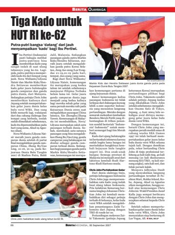 66 BERITAINDONESIA, 06 September 2007BERITA OLAHRAGATiga Kado untukHUT RI ke-62Putra-putri bangsa ‘datang’ dari jauhmenyampaikan ‘kado’ bagi Ibu Pertiwi.bu Pertiwi (Indonesia)pasti bahagia melihatputra-putrinya bisamemberikan kado yangsangat indah di saat ulangtahunnya yang ke-62. Lagipula, putra-putrinya memperoleh kado itu dari tempat yangjauh. Nova Widianto/LilyanaNatsir dan Markis Kido/Hendra Setiawan memberikankado gelar juara bulutangkisganda campuran dan gandaputra dunia, dari Malaysia.Sedangkan petinju Chris Johnmemberikan kadonya dariJepang setelah mempertahankan gelar juara dunia kelasbulu versi WBA. Dan yanglebih menarik lagi, walaupundari dua cabang olahraga dantempat yang berbeda, seolahsudah dimufakati sebelumnya,kado itu dipersembahkan padahari yang sama, Ahad 19 Agustus silam.Nova Widianto/Lilyana Natsir meraih juara ganda campuran dunia setelah di partaifinal mengalahkan ganda campuran China, Zheng Bo/GaoLing, 21-16, 21-14, pada Kejuaraan Dunia Bulu Tangkis2007 di Stadion Putra, BukitJalil, Malaysia. Sedangkanpasangan ganda putra MarkisKido/Hendra Setiawan, meraih juara setelah mengalahkan ganda putra Korea Selatan, Jung Jae-sung/Lee Yongdae 21-19,21-19 pada hari,tempat, dan ajang yang sama.Bagi duet Nova Widianto/Lilyana Natsir, kemenanganitu merupakan yang keduatahun ini setelah sebelumnyamenjuarai Filipina Terbukabelum lama ini. Gelar juaraganda campuran dunia jugamenjadi yang kedua kalinyabagi mereka sebab gelar yangsama pernah mereka raih padaKejuaraan Dunia 2005 saatmengalahkan pasangan Chinalainnya, Xie Zhongbo/ZhangYawen. Kemenangan di Malaysia ini membuktikan, Nova/Lilyana merupakan salah satupasangan terbaik dunia. Sebab, merekalah satu-satunyapasangan yang bisa mengalahkan Zheng Bo/Gao Ling, gandacampuran yang belakangan inidinilai sebagai ganda campuran terkuat dunia. Sedangkan bagi pasangan ganda putraMarkis Kido/Hendra Setiawan, kemenangan ini merupakan kemenangan pertama diajang kejuaraan dunia.Kunci kemenangan keduapasangan Indonesia ini tidakterlepas dari dukungan kuranglebih 2.000 suporter Indonesia yang menonton langsungpertandingan. Mereka dengansemarak melambai-lambaikanBendera Merah Putih yang dibentangkan di tribun penonton sambil berteriak “Indonesia! Indonesia!” untuk memberi semangat bagi tim MerahPutih.Kado dari ajang bulutangkisini bertambah istimewa karenasudah begitu lama bangsa inimerindukan bangkitnya kembali kejayaan bulu tangkisnegeri ini. Doa anak-anakbangsa: Semoga prestasi diMalaysia ini menjadi awal darilahirnya kembali Rudi Hartono-Rudi Hartono muda.Chris John Pertahankan GelarDari dunia olahraga tinju,petinju kebanggaan IndonesiaChris John juga mempersembahkan satu kado yang indahbuat ulang tahun Indonesia.Pria kelahiran Semarang bernama lengkap Johannes Christian John ini kembali membuktikan diri sebagai petinjuterbaik di kelasnya, kelas buluversi WBA setelah mengalahkan penantangnya Zaiki Takemoto dari Jepang denganTKO di ronde ke-10.Pertandingan melawan Zaiki Takemoto (petinju Jepangketurunan Korea) merupakanpertandingan pilihan bagiChris John. Takemoto sendiriadalah petinju Jepang keduayang dikalahkan Chris Johnsetelah sebelumnya mengalahkan Osamu Sato di Tokyo,Jepang, 4 Juni 2004 lalu sekaligus awal dirinya memegang gelar juara kelas buludunia versi WBA.Dengan kemenangan ini,berarti Chris John yang merupakan peraih medali emas dicabang wushu SEA Games1997 ini telah berhasil mempertahankan gelar juara kelasbulu dunia versi WBA selamatujuh kali. Dengan demikianpula, rekor bertanding ChrisJohn di tinju profesional terhitung 41 kali naik ring, 40 kalimenang (21 kali diantaranyamenang KO/TKO, 19 kali menang angka), satu kali seri, dantidak pernah kalah.Menpora Adhyaksa Daultyang menyaksikan langsungpertandingan tersebut di Fashion Mart, Rokko Island, Kobe, Jepang, Ahad 19 Agustussilam mengatakan, bangga sekali atas kemenangan ChrisJohn ini. Wakil Presiden JusufKalla juga sempat berbicaradengan Chris John dan mengucapkan selamat kepada ChrisJohn.Setelah sukses mempertahankan gelar juara dunia kelasbulu versi WBA, Chris Johnmenyatakan siap bertarung diLas Vegas, AS. MS, MLPIMarkis Kido dan Hendra Setiawan juara dunia ganda putra padaKejuaraan Dunia Bulu Tangkis 2007.Chris John hadiahkan kado ulang tahun ke-62 RI. foto: ca.sports.yahoo.comfoto: ca.sports.yahoo.com