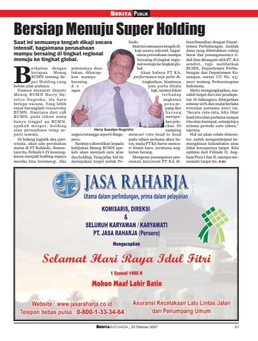 BERITAINDONESIA, 25 Oktober 2007 61BERITA PUBLIKBersiap Menuju Super HoldingSaat ini semuanya tengah dikaji secaraintensif, bagaimana perusahaanmampu bersaing di tingkat regionalmenuju ke tingkat global.erkaitan denganharapan MenegBUMN tentang Super Holding yangbelum jelas arahnya.Namun menurut DeputyMeneg BUMN Harry Susetyo Nugroho, itu baruberupa wacana. Yang lebihtepat barangkali resourcingBUMN. Nantinya dari 158BUMN, pada tahun 2009hanya tinggal 49 BUMN,apakah merger, holdingatau perusahaan tetap seperti semula.Di bidang logistik dan pariwisata, akan ada perubahanstatus di PT Rukindo. Sementara itu, Pelindo I-IV kemungkinan menjadi holding supayamereka bisa bersinergi. Jikapotensinya disatukan, diharapkan mampubersaingde,ngannegara tetangga seperti Singapura.Nantinya diserahkan kepadakebijakan Meneg BUMN apakah akan menjadi satu ataudua holding. Yang jelas, hal itumerupakan target untuk Pelindo.Saat ini semuanya tengah dikaji secara intensif, bagaimana perusahaan mampubersaing di tingkat regional menuju ke tingkat global.Akan halnya PT KA,performance-nya perlu ditingkatkan, bisnisnyapun perlu ditatalagi, namun fokusterhadapangkutanpenumpang danbarangmerupakan prioritas. Disampingmencari rute head to headpada tahun pertama akan berat, maka PT KA harus mencari bisnis baru, terutama angkutan barang.Mengenai penanganan pensiunan karyawan PT KA dikoordinasikan dengan Departemen Perhubungan. Jumlahdana yang dibutuhkan cukupbesar dan penanganannya tidak bisa ditangani oleh PT. KAsendiri, tapi melibatkanBUMN, Departemen Perhubungan dan Departemen Keuangan, sesuai UU No. 23/2007 tentang PerkeretaapianIndonesia.Harry mengungkapkan, masalah target dari sisi pendapatan di bidangnya ditargetkansebesar 20% dan mulai berlakutriwulan pertama 2007 ini.“Secara rata-rata, kita lihathasil triwulan pertama sampaitriwulan keempat, selanjutnyaselama periode satu tahun,”ujarnya.Hal ini akan selalu dimonitor, untuk mengantisipasi kemungkinan kelambatan atautidak tercapainya target. Kitaoptimis dari Pelindo II, Angkasa Pura I dan II, mampu memenuhi target itu. RIBHarry Susetyo Nugroho foto: berindo samsuri