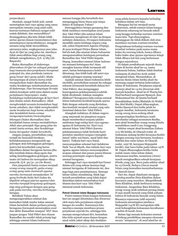 BERITAINDONESIA, 08 November 2007 41LENTERAperpecahan).Ataukah, sangat boleh jadi, untukmenetapkan hari raya agung yang samamerupakan sesuatu yang amat sulit,karena tuntunan Ilahinya sangat sulituntuk didekati, dan menyulitkan?Sesungguhnya jika kita dekati lebihserius ajaran shaum (memulainya) danmenutupnya (menyudahinya), sungguhsesuatu yang tidak menyulitkan,ajarannya jelas, ungkapannya pun jelas.Ayat Al-Qur’an yang jelas ini, mestinyatidak menyulitkan bagi orang yangikhlash mengikutinya, Q.S. 2/185 (AlBaqarah).Bulan Ramadlan di dalamnyaditurunkan Al-Qur’an sebagai petunjukbagi manusia dan penjelasan mengenaipetunjuk itu, dan pembeda (antarayang benar dari yang salah). Makabarangsiapa di antara kamu telahmenyaksikan bulan Ramadlan itu,maka hendaknya melaksanakan puasadi dalamnya. Dan barangsiapa beradadalam keadaan sakit atau dalam suatuperjalanan (bepergian), makahendaknya melaksakannya di hari-harilain (bulan selain Ramadlan). Allahmenghendaki sesuatu kemudahan bagikamu sekalian, dan tidak menghendakisuatu kesukaran bagi kamu sekaliandan hendaklah kamu semuamenyempurnakan/mencukupkanbilangan (bulan Ramadlan) danhendaklah kamu semua mentakbirkanAllah atas petunjuk-Nya yang jelas ituuntuk kamu semua, dan hendaknyakamu bersyukur (tidak berselisih).Jangan-jangan, perselisihan yangterjadi itu hanyalah berdasarketidakmampuan mengendali egogolongan atau kebanggaan golongan,justru hal tersebutlah yang harusdijauhkan dalam beragama karena jikakita terjebak dalam sikap egois dansaling membanggakan golongan, justrusuatu ciri bahwa itu merupakan sikapmusyrik, Q.S. 30/31- 32 (Ar-Rum).Dan janganlah kamu semua menjadiorang-orang musyrik, yaitu orangorang yang suka memecah agamamereka (termasuk menjalankan ‘Idyang berbeda-beda hari kalau itudiyakini sebagai ajaran agama) danmereka menjadi bergolong-golongan,tiap-tiap golongan dengan apa yangada pada mereka, mereka berbanggabangga.Betulkah Tuhan akanmenganugerahkan rahmat dankemudian tidak murka kalau ummatIslam berselisih dalam perkara prinsipberagama (termasuk menetapkan awaldan akhir Ramadlan maupun ‘Id)? Ataujangan-jangan ‘Idul Fithri dan shaumRamadlan itu sendiri tidak prinsip lagisehingga ummat Islam Indonesiamerasa bangga jika berselisih danmenganggap biasa-biasa saja tanpabeban di hadapan Tuhan?Sesungguhnya betapa gampang dantidak susahnya menetapkan awal puasadan ‘Idul Fithri jika ummat IslamIndonesia mengimani Al-Qur’an dengansedalam-dalamnya. Di negara Indonesiamemiliki suatu lembaga negara yangsah, yakni Depatemen Agama (Depag),di sana terdapat Dirjen Bimas Islam,bid’ah-kah jika ummat Islam Indonesiamengamanatkan ketetapan permulaanRamadlan dan ‘Idul Fithri kepadaDepag, kemudian ummat Islam Indonesia menaati ketetapan itu? Ataumungkin karena tidak termasuk ulilamri, lantas ketetapannya bolehditentang, dan lebih baik ulil amri-nyaadalah golongan masing-masing?Apakah ummat Islam Indonesia lebihmemilih, perselisihan ummat itu sebagairahmat (termasuk berselisih dalam ber-‘Idul Fithri), dan menganggapkeseragaman pelaksanaannya adalahtidak dirahmati, bahkan mungkindilaknat? Seyogyanya kita semua ummatIslam Indonesia kembali kepada ajaranIlahi dengan sukarela yang direlakan,dan kembali menjadi ummat yang satu(minimal dalam ber-‘Idul Fithri).Alangkah indahnya di dalam negarayang majemuk ini pimpinan negaradapat memberikan ucapan/pidatosambutan bagi setiap hari raya agamaagama di Indonesia ini. Hari rayaummat Islam ‘Idul Fithri (karenapelaksanaannya tidak berbeda hari)presiden memberi ucapan (mungkinminal ‘aidin wal faizin, maaf lahir danbatin). Tatkala hari raya Natal,menyampaikan selamat hari kelahiranNabi ‘Isa al-Masih, dan tatkala hari rayaagama-agama lainnya menyampaikanucapan selamat dan pesan-pesan khususseorang pemimpin negara kepadaummat beragama.Sehingga hari raya menjadi hari besardalam arti yang seluas-luasnya bagiummat beragama di Indonesia ini, danjuga bagi para pemimpinnya. Semogatahun-tahun mendatang, tidak lagiterjadi perselisihan yang tidak dapatdisatukan dalam menentukan harishaum dan hari raya ‘Idul Fithriminimal untuk Indonesia.Potret Ummat Islam Bangsa IndonesiaPotret ummat Islam bangsa Indonesiahari ini sangat ditentukan dan diwarnaioleh masa lalu perjalanan sejarahbangsa itu sendiri. Karenanya kitamestinya mampu membaca prosesperjalanan sejarah itu, sehingga kitamampu mengevaluasi diri, kemudiankita tulis sejarah masa depan denganamal soleh yakni sikap dan tindakanyang selalu konsern kepada/terhadapkebaikan dalam arti luas.Mengapa hal ini menjadi suatukeharusan, sebab ummat Islam bangsaIndonesia sekarang ini banyak sekaliyang bangga terhadap warisan-warisanmasa lalu. Tapi disayangkan,kebanggaan itu tidak diikuti oleh etosmembaca warisan-warisan tersebut.Pengetahuan terhadap warisan-warisantersebut terbatas pada nama-namakalau itu seorang tokoh, hanya dibacabuku-buku atau ajaran-ajarannya tetapitidak dibaca hal-hal yang berkenaandengan sejarahnya.Di dalam pembahasan sejarah duniaIslam di kurun abad ke-14, namaIndonesia belum, bahkan tidak disebutwalaupun di abad itu Aceh sudahmengenal Islam. Menandakan, ditataran dunia Islam ketika abad itumemang sangat terbatas keberadaanIslam di Indonesia. Perjalanan sejarahmenuju abad ke-14 itu diwarnai olehbanyak kejadian. Abad ke-8 Thariq binZiad berhasil menguasai Spanyol, danMuhammad bin Al-Qasim berhasilmenaklukkan India (Khilafah Al-Walidibn Abd Malik). Dapat dibayangkan,ketika Spanyol dan India jatuh ketangan muslim, Indonesia terutamaorang-orang Jawa sedang sibukmempersiapkan berdirinya candiBorobudur sebagai monumen Budha,satu abad kemudian orang-orang Hindumendirikan candi Loro Jonggrang.Sekitar empat abad kemudian (tahun1111 M) ketika Al-Ghazali wafat, diIndonesia sedang berdiri kerajaan Kediridengan seorang raja bernama Jayabaya.Setelah dua ratus tahun Al-Ghazaliwafat, 1297 M, kerajaan Majapahitberdiri, dan baru habis pada tahun 1478M. Dapat dibayangkan ketika Indiasudah enam ratus tahun dalamkekuasaan muslim, nusantara (Jawa)masih menghasilkan se
