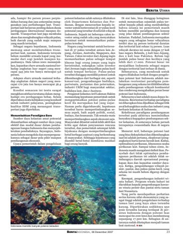 BERITAINDONESIA, 06 Desember 2007 23BERITA UTAMAada, hampir 80 persen proses perpindahan barang dan jasa antarpulau menggunakan jasa perhubungan laut. Transportasi laut berperan penting dalam duniaperdagangan internasional maupun domestik. Transportasi laut juga membukaakses dan menghubungkan wilayah pulau,baik daerah yang sudah maju maupunyang masih terisolasi.Sebagai negara kepulauan, Indonesiamemang amat membutuhkan transportasi laut, namun, Indonesia ternyatabelum memiliki armada kapal yang memadai dari segi jumlah maupun kapasitasnya. Data tahun 2001 menunjukkan, kapasitas share armada nasional terhadap angkutan luar negeri yang mencapai 345 juta ton hanya mencapai 5,6persen.Adapun share armada nasional terhadap angkutan dalam negeri yang mencapai 170 juta ton hanya mencapai 56,4persen.Kondisi semacam ini tentu sangatmengkhawatirkan terutama dalam menghadapi era perdagangan bebas. Selaindiperlukan suatu kebijakan yang kondusifuntuk industri pelayaran, peningkatankualitas SDM yang menangani transportasi juga diperlukan.Menumbuhkan Paradigma BaruSumber daya kelautan amat potensialdimanfaatkan sebagai sumber daya yangefektif dan modal dasar dalam pembangunan bangsa Indonesia dan menyejahterakan penduduknya. Sayangnya, Indonesia belum mengelola dan mempergunakannya sebagai dasar pola pikir maupunpembangunan ekonomi.Upaya pemerintah dalam pengelolaanpotensi kelautan salah satunya dilakukanoleh Departemen Kelautan dan Perikanan, dengan menawarkan kepada investor untuk berinvestasi di 37 pulau kecilpotensial yang tersebar di seluruh wilayahIndonesia. Sejauh ini beberapa calon investor asing sudah ada yang menyatakanberminat untuk memanfaatkan pulaupulau tersebut.Negara yang berminat untuk berinvestasi di 37 pulau tersebut antara lain Jepang, Jerman, Australia, Singapura, danTaiwan. Calon investor dari Jepang inginmemanfaatkan pulau sebagai tempatkhusus bagi orang jompo yang inginberistirahat, sedangkan calon investordari Jerman ingin menjadikan pulau keciluntuk tempat berlayar. Pulau-pulautersebut dianggap memiliki potensi untukdikembangkan dari berbagai sisi, sepertikonservasi, pengembangan budidaya,pariwisata, pertanian dan peternakan,industri UKM bagi masyarakat sekitar,budidaya laut, dan e-business.Pengamat kelautan Arif Lukman Hakimmemandang keputusan pemerintah untukmengoptimalkan potensi pulau-pulaukecil itu merupakan hal yang wajar.Namun perlu digarisbawahi, keputusantersebut harus mempertimbangkan semua aspek, baik aspek politik, sosial,budaya, dan keamanan. Tak semata-matamempertimbangkan aspek ekonomi saja.Masyarakat dituntut untuk lebih aktif dankritis agar dalam penyusunan rencanatersebut, dan pemerintah setempat lebihbijaksana dengan mempertimbangkanbetul berbagai aspirasi yang berkembangdi masyarakat. Sehingga keputusan yangdiambil betul-betul membawa manfaatbagi orang banyak.Di sisi lain, bisa dianggap keinginanuntuk menawarkan sejumlah pulau tersebut kepada pihak asing membuktikanbahwa selama ini pemerintah masihbelum memiliki paradigma dan konsepyang jelas dalam pembangunan sektorkelautan. Padahal, Indonesia merupakannegara yang sebagian besar wilayahnyaterdiri atas 25 persen teritorial daratandan teritorial laut seluas 75 persen. Luaswilayah daratan ini sama dengan 57 kaliluas negara Belanda, 5 kali luas Jepang,dan 2 kali luas Pakistan. Belum lagijumlah pulau besar dan kecilnya yanglebih dari 17.000. Potensi besar inimenjadikan Indonesia sebagai negaradengan teritorial laut terluas di dunia.Sebenarnya, yang mendesak untuksegera dilakukan terkait dengan pengelolaan potensi laut Indonesia adalah melakukan reorientasi paradigma pembangunan yang selama ini dititikberatkanpada pembangunan wilayah kontinentaldan cenderung mengabaikan peran besarpotensi laut Indonesia.Sebenarnya laut adalah masa depan Indonesia. Reorientasi terhadap paradigmaini diharapkan bisa dijadikan sebagai titikawal kebangkitan usaha dan industri yangberbasis kelautan di Indonesia.Kekeliruan paradigma pembangunantersebut pada akhirnya menimbulkanbanyaknya kegagalan pembangunan sektor kelautan, di antaranya belum pernahtercapainya swasembada ikan di negaraini.Menurut Arif, beberapa potensi lautyang bisa dieksploitasi dan dikembangkansaat ini adalah pertama, eksplorasi (pengangkatan) harta karun bawah laut. Kedua,optimalisasi perikanan, khususnya usahaperikanan laut. Sampai tahun 2002, Indonesia masih mengalami defisit ikan. Penyebab dari tidak optimalnya pembangunan perikanan ini adalah tidak seimbangnya daerah operasional penangkapan ikan dan kapasitas sumber dayanya. Ketiga, pengembangan wilayah pesisir, pantai, dan pulau-pulau kecil, yangselama ini masih belum digarap denganserius.Keempat, pengembangan industri wisata bahari. Program wisata bahari inidiarahkan kepada pengembangan kawasan wisata pesisir dan pantai serta tamanlaut Nusantara.Yang perlu mendapatkan perhatianserius karena nilai ekonominya yang sangat tinggi adalah pengelolaan terhadaptaman laut yang kaya akan terumbukarang. Diperkirakan sedikitnya 950jenis terumbu karang terdapat di perairan Indonesia dengan potensi luasmencapai 60.000 km2 dan membentangsepanjang 17.500 km. Sebagian di antaranya sudah ditetapkan menjadi tamanIndonesia memiliki banyak potensi kelautan laut nasional. RH