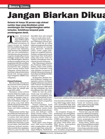 24 BERITAINDONESIA, 06 Desember 2007BERITA UTAMAJangan Biarkan DikuaSelama ini hanya 30 persen saja alokasisumber daya yang disediakan untukmembangun dan mengembangkan sektorkelautan. Selebihnya berpusat padapembangunan darat.anpa bermaksudmenyalahkan siapasiapa, bidikan sektorkelautan masih belum menjadi primadona dinegara tercinta ini. Padahalkita bisa melihat betapa kayanya potensi laut Indonesia,yang harusnya bisa dinikmatioleh 240 juta penduduknya.Ada beberapa potensi kelautanyang bisa menghasilkan devisasehingga sangat perlu untukterus dikembangkan. Misalnyaperikanan tangkap di laut, jasapengiriman laut (forwarding),pertambangan dan energi laut,transportasi laut, pengangkutan barang dengan kapal(shipping), potensi pulau pulau terluar, potensi harta karunbawah laut, barang muatankapal tenggelam (BMKT) dansebagainya.Potensi PerikananBila dicermati, nilai potensiekonomi dari sektor perikanandan kelautan mencapai 82miliar dolar AS, sebuah nilaiyang tidak sedikit.Sayangnya semua potensitersebut tidak bisa begitu sajadinikmati. Melainkan harusmelalui perjuangan yang cukup lama. Belum lagi kitaharus berhadapan dengan pihak asing yang telah lebihdahulu menguasai sedemikianbesar bidang kelautan. Terutama soal sektor perikanantangkap.Potensi lestari sumber dayaikan (SDI) laut Indonesia sekitar 6,4 juta ton per tahun, atau7,5 persen dari total potensilestari ikan laut dunia. Saat initingkat pemanfaatan ikan Indonesia baru mencapai 4,4 jutaton per tahun. Dua tahun laluIndonesia berhasil membukukan jumlah ikan tangkapansebesar 6,4 juta ton ikan, yangdiprediksi akan naik menjadi9 juta ton pada tahun 2008.Negara ini hampir tiap tahun kehilangan potensi perikanan senilai Rp 30 triliunakibat penangkapan ikan ilegal(illegal fishing) di wilayahZona Ekonomi Eksklusif(ZEE). Tentu, angka kehilangan ini sangatlah fantastis.Padahal, terdapat pula banyakkapal-kapal ikan berbenderaasing yang secara resmi melakukan penangkapan ikan diwilayah perairan Indonesia.Data Departemen Kelautandan Perikanan (DKP) menyebutkan, tahun 2006 jumlahkapal ikan berbendera asingyang diijinkan beroperasi diwilayah Indonesia terutama diZona Ekonomi Eksklusif (ZEE)sebanyak 712 kapal.Ali Supardan, Direktur Jendral Perikanan Tangkap mengatakan potensi perikanantangkap Indonesia yang dicuritelah berhasil dimanfaatkansebesar 80 persen. DKP sudahtak lagi membuka ijin barupenangkapan ikan oleh asing.Selain itu, kata Ali, pemerintah juga mewajibkan perusahaan penangkapan ikanasing yang beroperasi di perairan Indonesia untuk mendirikan industri pengolahanikan di tanah air.Dengan demikian, hasiltangkapan tidak boleh lagidibawa keluar namun harusterlebih dahulu diolah di Indonesia, dan diekspor sudahdalam bentuk olahan. Carademikian membuat perikananIndonesia memiliki nilai tambah dan mampu membukalapangan kerja.Sejak tahun 2005 hingga2007, DKP secara bertahaptelah menghentikan ijin-ijinoperasi kapal ikan asing darinegara Philipina, Thailand danCina di perairan Indonesia. Paling tidak hingga akhir tahun2007 pemerintah tidak akanmemperpanjang lagi ijin kapalikan asing beroperasi di Indonesia.Ali mengakui dengan dihentikannya ijin mengakibatkan terjadi penurunan Penerimaan Negara Bukan Pajak(PNBP), yang sebelumnya bersumber dari sedikitnya 700 kapal asing. Untuk tahun 2007DKP hanya menargetkanPNBP Rp 200 miliar.Namun demikian Ali meyakini, kewajiban pengembangan industri pengolahan ikan diTanah Air membuat pemasukan negara justru akan lebihtinggi dibanding PNBP.Potensi Transportasi BarangPotensi laut yang tak kalahbesarnya adalah jasa pengangkutan atau pengiriman barangmelaui laut (forwarding) danbisnis pengangkutan cargomelalui laut (shipping)Setiap tahun, sekitar 600juta ton barang dikirim melaluilaut. Setiap tahun jasa pengiriman kargo pada jalur perdagangan internasional melaluiTDiperkirakan, sedikitnya 950 jenis terumbu karang ada di perairan Indonesia.