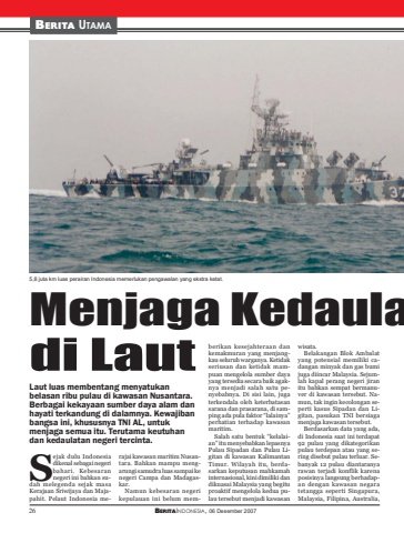 26 BERITAINDONESIA, 06 Desember 2007BERITA UTAMASMenjaga Kedauladi LautLaut luas membentang menyatukanbelasan ribu pulau di kawasan Nusantara.Berbagai kekayaan sumber daya alam danhayati terkandung di dalamnya. Kewajibanbangsa ini, khususnya TNI AL, untukmenjaga semua itu. Terutama keutuhandan kedaulatan negeri tercinta.ejak dulu Indonesiadikenal sebagai negeribahari. Kebesarannegeri ini bahkan sudah melegenda sejak masaKerajaan Sriwijaya dan Majapahit. Pelaut Indonesia merajai kawasan maritim Nusantara. Bahkan mampu mengarungi samudra luas sampai kenegeri Campa dan Madagaskar.Namun kebesaran negerikepulauan ini belum memberikan kesejahteraan dankemakmuran yang menjangkau seluruh warganya. Ketidakseriusan dan ketidak mampuan mengelola sumber dayayang tersedia secara baik agaknya menjadi salah satu penyebabnya. Di sisi lain, jugaterkendala oleh keterbatasansarana dan prasarana, di samping ada pula faktor “lalainya”perhatian terhadap kawasanmaritim.Salah satu bentuk “kelalaian” itu menyebabkan lepasnyaPulau Sipadan dan Pulau Ligitan di kawasan KalimantanTimur. Wilayah itu, berdasarkan keputusan mahkamahinternasional, kini dimiliki dandikuasai Malaysia yang begituproaktif mengelola kedua pulau tersebut menjadi kawasanwisata.Belakangan Blok Ambalatyang potensial memiliki cadangan minyak dan gas bumijuga diincar Malaysia. Sejumlah kapal perang negeri jiranitu bahkan sempat bermanuver di kawasan tersebut. Namun, tak ingin kecolongan seperti kasus Sipadan dan Ligitan, pasukan TNI bersiagamenjaga kawasan tersebut.Berdasarkan data yang ada,di Indonesia saat ini terdapat92 pulau yang dikategorikanpulau terdepan atau yang sering disebut pulau terluar. Sebanyak 12 pulau diantaranyarawan terjadi konflik karenaposisinya langsung berhadapan dengan kawasan negaratetangga seperti Singapura,Malaysia, Filipina, Australia,5,8 juta km luas perairan Indonesia memerlukan pengawalan yang ekstra ketat.