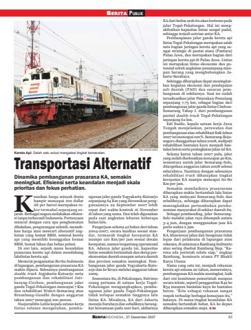 BERITAINDONESIA, 27 Desember 2007 61Transportasi AlternatifDinamika pembangunan prasarana KA, semakinmeningkat. Efisiensi serta keandalan menjadi skalaprioritas dan fokus perhatian.enaikan harga minyak duniahampir mencapai 100 dollarAS per barrel merupakan rekor termahal sepanjang sejarah. Berbagai negara melakukan efisiensi tanpa terkecuali Indonesia. Pertanyaanmuncul dengan cara apa penghematandilakukan, pengurangan subsidi, menaikkan harga atau mencari alterantif angkutan yang hemat BBM, semisal keretaapi yang memiliki keunggulan hematBBM, hemat lahan dan bebas polusi.Di sisi lain, sejauh mana keandalanprasarana kereta api dalam mendukunglalulintas kereta api.Menurut pengamatan Berita Indonesiadi lapangan, pembangunan prasarana KAmakin dipacu. Selesainya pembangunandouble track Jogjakarta-Kutoarjo sertapembangunan dan rehabilitasi Jatibarang-Cirebon, pembangunan jalurganda Tegal-Pekalongan mencapai 7 Kmdan rehabilitasi Weleri-Semarang atauBrumbung-Gundhi dengan anggarantahun 2007 mencapai 100 persen.Nasjaruddin Lubis kepala satuan kerjalintas selatan mengatakan, pembangunan jalur ganda Yogyakarta-Kutoarjosepanjang 64 Km yang diresmikan penggunaannya 29 September 2007 lebihcepat dari waktu kontrak 16 Novemberdi tahun yang sama. Dan telah digunakanpada saat angkutan lebaran beberapabulan lalu.Pengerjaan selama 42 bulan dari tahun2004-2007, secara kualitas sesuai standar, termasuk tingkat kecepatan KAmampu 120 Km/per jam sesuai desainkecepatan, namun tergantung operasionalKA. Adanya jalur ganda ini, kapasitaslintas semakin bertambah dan derap perekonomian daerah maupun antara daerahdan provinsi semakin meningkat. Pembangunan jalur ganda Yogyakarta-Kutoarjo dan ke Kroya melalui anggaran tahun2009.Sementara itu, di Pekalongan, Sutrisnoorang pertama di satuan kerja TegalPekalongan mengungkapkan, pembangunan jalur ganda Tegal-Pekalongantidak terlepas semakin tingginya lalulintas KA. Misalnya, KA dari Jakartamenuju Surabaya dan sebaliknya berangkat bersamaan pada sore hari, akibatnyaKA dari kedua arah itu akan bertemu padajalur Tegal-Pekalongan. Hal ini mengakibatkan kapasitas lintas sangat padat,sehingga terjadi antrian antar KA.Pembangunan jalur ganda kereta apilintas Tegal-Pekalongan merupakan salahsatu bagian jaringan kereta api yang sangat strategis di pantai utara (Pantura)Pulau Jawa, dan merupakan bagian darijaringan kereta api di Pulau Jawa. Lintasini merupakan lintas ekonomis dan potensial untuk angkutan penumpang maupun barang yang menghubungkan Jakarta-Surabaya.Sehingga diharapkan dapat meningkatkan kegiatan ekonomi dan pendapatanasli daerah (PAD) dan sasaran pembangunan di sekitarnya. Saat ini sudahterealisasikan jalur Petarukan-Pemalangsepanjang 7,75 km, sebagai bagian daripembangunan jalur ganda lintas CirebonSemarang Tahap I. dari pembangunanparsial double track Tegal-Pekalongansepanjang 62 km.Edi Susilo, kepala satuan kerja JawaTengah menjelaskan, perawatan danpembangunan atau rehabilitasi fisik tahun2007 ini mencapai 100%. Semarang-Bojonegoro dianggarkan tahun 2008, meliputirehabilitasi bantalan kayu menjadi bantalan beton serta peningkatan jalan rel KA.Selama kurun tahun 2007 pula, jaluryang sudah diselesaikan mencapai 40 Km,sementara untuk jalur Semarang-Solo,ditargetkan anggaran tahun 2008 selesaiseluruhnya. Nantinya dengan selesainyarehabilitasi track diharapkan tingkatkecepatan KA mampu mencapai 60-80Km per jam.Semakin membaiknya prasarasanadiharapkan makin bertambah lalu lintasKA yang melayani Semarang-Solo dansebaliknya, sehingga diharapkan dapatmeningkatkan pertumbuhan perekonomian masyarakat di sekitar daerah itu.Sebagai pembanding, jalur SemarangSolo melalui jalan raya ditempuh antara3-4 jam, dengan menggunakan jasa KAperlu waktu 2 jam.Pengerjaan pembangunan prasaranaKA, khususnya jalan dan bangunan tidaklepas dari pelaksana di lapangan ataurekanan, di antaranya Bambang Indriantoatau sering disebut Bambang Siap. “Karena ada perintah selalu siap,” ungkapBambang, komisaris utama PT BhaktiKarya UtamaNama yang satu ini, menjadi rekamankereta api selama 20 tahun, menurutnya,pembangunan KA makin meningkat, baikdari sisi komitmen pemerintah maupunsecara teknis, seperti penggantian R42 keR54 maupun bantalan kayu ke bantalanbeton. “Kita sebagai rekanan sangatrespek terhadap berbagai kemajuan itu,”katanya. Di mana tingkat keandalan KAsemakin bertambah hebat, KA ke depandiharapkan semakin maju. RIKKereta Api: Salah satu solusi mengatasi tingkat kemacetan.BERITA PUBLIKfoto: berindo wilson
