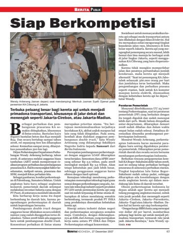 BERITAINDONESIA, 27 Desember 2007 63BERITA PUBLIKSiap BerkompetisiTerbuka peluang besar bagi kereta api untuk menjadiprimadona transportasi, khususnya di jalur dekat danmenengah seperti Jakarta-Cirebon, atau Jakarta-Madiun.erbagai perbaikan dan pembangunan prasarana KA semakin ditingkatkan, khususnyadi lintas utama. Bantalan kayudiganti bantalan beton dan R42 menjadiR54. Dan secara bertahap sampai tahun2008, rel sepanjang 600 km diharapkanselesai. Kemudian sampai 2009, dilanjutkan penambahan 500 km lagi.Dirjen Perkeretaapian Departemen Perhubungan Wendy Aritenang berharap, tahun2008, di antaranya melalui anggaran biayatambahan (ABT) untuk mempercepat realisasi program perbaikan dan pembangunanprasarana KA. Hal itu menyangkut faktor keselamatan, meliputi sarana, prasarana danSDM, menjadi fokus perhatian kita.Sebagai gambaran, kondisi perkeretaapian di Palembang, Sumatera Selatan. Untukangkutan batu bara sebagai angkutankomersil, pemerintah daerah setempatmelakukan investasi bekerja sama denganPT Pusri, di antaranya membeli lokomotif.Kita berharap kerja sama itu dapatberkembang ke daerah lain, karena pengembangan perkeretaapian di daerahuntuk kepentingan bersama.Pembangunan double track dengananggaran besar dilakukan secara selektif,namun yang sudah dianggarkan terus dijalankan. Tahun 2008 tidak ada anggaranbaru untuk pembangunan double track.Konsentrasi perbaikan di lintas utamamerupakan prioritas utama. “Itu bertujuan meminimalisasikan terjadinyakecelakaan KA, akibat anjlok maupun hallain yang tidak diinginkan. Pada 2009,kembali akan dialokasi anggaran pembangunan double track,” kata WendyAritenang yang didampingi SekdikjenNugroho Indrio kepada Samsuri dariBerita Indonesia.Percepatan pembangunan perkeretaapian dengan anggaran LOAN diharapkanterus berjalan. Sementara dana APBN 2007yang sebesar Rp 2,9 triliun, pada 2008meningkat menjadi Rp 3,9 triliun. Akantetapi kebutuhan pun jauh lebih besar,sehingga penggunaan anggaran harusefisien dengan hasil optimal.Kemajuan teknologi mendorong perkeretaapian menerapkan teknologi tepat gunasesuai dengan perkembangan yang ada. Antara lain teknologi industri seperti produksiPT LEN untuk persinyalan kereta api yangsaat ini sudah terpasang di lintas utama diharapkan di tahun mendatang semakinberkembang, termasuk produk PT INKAyang produksinya disesuaikan kebutuhankereta api.Sinergi antara industri dalam negeridan perkeretaapian seyogianya semakinmaju. Contohnya, dengan didatangkannya 40 KRL dari Jerman, yang merupakankerja sama antara PT INKA dan DitjenPerkeretaapian sebagai konsorsium.Sosialisasi untuk memasyarakatkan kereta api sebagai moda transportasi antaralain dilakukan dengan iklan di televisi. Halitu merupakan solusi mengurangi tingkatkepadatan jalan raya, khususnya di kotabesar seperti Jakarta. Kereta api yang mengangkut penumpang secara massal, lebihhemat dan bisa menuju ke berbagai arahdi jalur lingkar Jakarta, seperti menggunakan KA Ciliwung yang baru dioperasionalkan.Karena tidak mungkin memperlebarjalan dan pesatnya pertambahan jumlahkendaraan, maka kereta api menjadialternatif. “Saat ini penumpang KA Jabotabek sebanyak 360.000 orang per haridan jumlahnya terus bertambah. Makapengembangan dan perbaikan prasanaseperti stasiun, baik untuk KA komutermaupun kereta elektrik, disesuaikandengan kebutuhan kereta api ke depan,”tutur Wendy.Peraturan PemerintahMenyusul diterbitkannya UU 23/2007tentang Perkeretaapian, saat ini peraturanpemerintah (PP) yang berkaitan denganitu tengah digodok dan sudah mencapailebih dari 90%. Meski belum dirapatkanantar-departemen, diharapkan Januari2008 sudah dibahas dan dalam waktuempat bulan sudah selesai. Detailnya disesuaikan dinamika pembangunan perkeretaapian Indonesia.Menurut Wendy Aritenang, perkeretaapian Indonesia harus memulai paradigma baru seiring digodoknya peraturan pemerintah. Diharapkan peran pemerintah daerah dan swasta secara bersamamembangun perkeretaapian Indonesia.Berkaitan rencana pengoperasian kembali KA Bogor-Sukabumi akhir tahun 2008,saat ini sedang tahap perbaikan berbagaiprasarana di antaranya perbaikan stasiun.Tingkat kepadatan lalu lintas BogorSukabumi sudah cukup padat, sehinggadiharapkan ada keseimbangan denganmoda angkutan kereta api dalam mendukung lalu lintas di daerah tersebut.Obsesi perkeretaapian Indonesia kedepan adalah agar kereta api menjaditulang punggung angkutan massal, untukrute jarak pendek dan menengah sepertiJakarta–Cirebon, Jakarta–Purwokerto,Jakarta–Tegal atau Jakarta–Madiun. Dalam hal ini kereta api siap berkompetisi.“Dengan harga BBM dunia yang mencapai100 dollar AS per barrel, memberikanpeluang bagi kereta api untuk menjadi primadona transportasi, termasuk rute jarakjauh Jakarta-Surabaya,” kata Wendy optimis. RIBWendy Aritenang (kanan depan) saat mendampingi Menhub Jusman Syafii Djamal padaperesmian KA Ciliwung di Jakarta.foto: humas Daop I/rajab