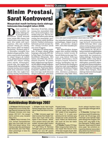 66 BERITAINDONESIA, 10 Januari 2008BERITA OLAHRAGAMinim Prestasi,Sarat KontroversiMasyarakat masih berharap dunia olahragaIndonesia bisa bangkit tahun 2008.Kaleidoskop Olahraga 2007fl 23 Februari: Rita Subowo terpilihsebagai Ketua Umum Komite Olahraga Nasional Indonesia dan KomiteOlimpiade Indonesia untuk masajabatan 2007-2011. Dia menjadiwanita pertama yang menjabatketua umum.fl 3 Maret: Petinju Indonesia, ChrisJohn, berhasil mempertahankangelar juara dunia kelas bulu versiWBA untuk ketujuh kalinya. Chrismenang angka atas penantangnyaasal Venezuela, Jose “Cheo” Rojas,dalam pertandingan di Istora Senayan, Jakarta.fl 20 April: Nurdin Halid terpilihkembali sebagai Ketua Umum Persatuan Sepak bola Seluruh Indonesia.fl 13 Mei: Indonesia gagal totaldalam turnamen Bulu Tangkis Indonesia Open Super Series yangdigelar di Istora Senayan, Jakarta.Untuk pertama kalinya para atletandalan Indonesia gagal merebutsatu pun gelar juara di ajang itu.fl 7 Juli: Petinju M. Rachmankehilangan gelar juara dunia kelasterbang mini versi IBF setelahdikalahkan penantang asal Filipina,Florante Condes.fl 29 Juli: Irak keluar menjadi juaraturnamen sepak bola Piala Asia2007 setelah di final mengalahkanArab Saudi 1-0. Ini gelar juarapertama untuk Irak. Indonesia, yangmenjadi tuan rumah, bersama Malaysia, Thailand, dan Vietnam tampilapik meski tak lolos dari babakpenyisihan grup.fl 27 Oktober: Presiden FIFA SeppBlater mengumumkan bahwa Asosiasi Sepak Bola Seluruh Dunia(FIFA) tidak mengakui Nurdin Halidsebagai Ketua Umum PSSI. StatusNurdin sebagai terpidana kasuskorupsi dianggap melanggar statutaFIFA.fl 15 Desember: Kontingen Indonesia hanya meraih 56 medali emas,64 perak, dan 82 perunggu sertamenempati posisi keempat dalampesta olahraga Asia Tenggara, SEAGames XXIV, yang digelar di Nakhon Ratchasima, Thailand, sejak 6Desember. Target meraih 64 medaliemas gagal, tapi perbaikan peringkat bisa dilakukan karena dalamajang sebelumnya Indonesia hanyamenempati posisi kelima. alam sepuluh tahun terakhir inidunia olahraga kita mengalami kemunduran. Untuk menjadijuara umum SEA Games sajayang levelnya cuma Asia Tenggara, kita sudah sulit mencapainya. Jika mau melihatprestasi cabang per cabang,SEA Games XXIV di NakhonRachasima, Thailand pada 6-15 Desember mungkin bisadipakai sebagai patokan. Indonesia yang berada di peringkatke empat dengan 56 medaliemas, paling banyak mendapatmedali dari empat cabangyakni atletik, bulutangkis,pencak silat, dan angkat besi.Cabang atletik dan bulutangkismasing-masing menyumbangtujuh emas sementara cabangpencak silat, dan angkat besimasing-masing menyumbanglima emas. Di sisi lain, cabangrenang dan menembak tidakbisa menyumbangkan satumedali emas pun. Hal ini menunjukkan bahwa pada cabangrenang dan menembak, prestasi Indonesia sudah demikianbobrok. Padahal sebelumnya,Indonesia pernah merajai kedua cabang tersebut untukarea Asia Tenggara.Sedangkan di cabang sepakbola, di empat cabang palingbergengsi, yakni piala AFF (dulu Piala Tiger), Pra Piala Dunia,Kualifikasi Olimpiade, SEAGames, dan Piala Asia, tim Indonesia terpuruk. Di pentaslokal, pelaksanaan Liga Indonesia bisa dilihat sebagai indikatorsukses tidaknya persepakbolaan Indonesia. Tapi harus diakui,kompetisi sepakbola lokal tahun 2007 juga masih diwarnaidengan kekerasan, pelecehandan intimidasi kepada petugaspertandingan, dugaan suap diPSSI, perseteruan denganFIFA, serta ribut masalah pendanaan.Bila dibandingkan dengannegara lain, prestasi olahragaIndonesia sudah berada dibawah Malaysia dan juga Vietnam yang dalam beberapadekade sebelumnya masihberguru kepada Indonesia.Jangan bandingkan lagi dengan Thailand atau Singapurayang kian jauh meninggalkanIndonesia. Rendahnya budayaolahraga, kurangnya bibitatlet, minimnya pendanaan,pembinaan yang tidak fokus,serta minimnya fasilitas olahraga bertaraf internasionaladalah beberapa faktor yangselama ini kerap diwacanakannamun miskin tindakan nyata.Oleh karena itu, tak ada salahnya kembali menghidupkansemboyan ‘mengolahragakanmasyarakat dan memasyarakatkan olahraga’. Semboyan inimemiliki makna yang dalam.Masyarakat memang perlu diolahragakan, sementara olahraga juga patut dimasyarakatkan.Sebab, banyak hal positif yangdapat diambil dari olahraga itusendiri. Besar harapan, duniaolahraga Indonesia bisa bangkittahun 2008. MLPDChris John saat mempertahankan sabuk kelas bulu WBA.Kejayaan bulutangkis nasional terus mulai pudar. Prestasi Timnas sepakbola lebih sering mengecewakan.