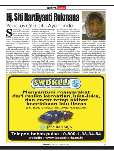 BERITAINDONESIA, 20 Maret 2008 57BERITA TOKOHHj. Siti Hardiyanti RukmanaPenerus Cita-cita Ayahandaepeninggal mantanPresiden Seoharto,putra-putri Presidenkedua RI menjadi rebutan partai politik. Termasuk putri sulungnya, MbakTutut, yang sangat diinginkanoleh Partai Golkar supaya aktifkembali.Bukan tanpa alasan bila pemilik nama lengkap Hj. SitiHardiyanti Hastuti Indra Rukmana ini menerima, dan menyatakan bertekad mengabdikan diri sebagai kader PartaiGolkar. Bergabung dengan partai pohon beringin dilandasioleh keinginannya untuk meneruskan cita-cita sang ayah dalam membangun bangsa, negara dan rakyat Indonesia. Wanita kelahiran 23 Januari 1949ini pun menyatakan kesiapanmenerima instruksi dan bekerjamaksimal untuk partai.Dunia politik bukanlah halyang baru bagi Tutut. SebelumPak Harto lengser, ia aktifberkecimpung dalam partaiGolkar, termasuk menjabatKetua DPP Golongan Karya.Tetapi, pada saat pemilu tahun2004 berlangsung, ia bergabung dengan Partai KaryaPeduli Bangsa (PDKB). Olehpartai yang diketuai R Hartonoitu, Tutut malahan diusung sebagai Calon Presiden (Capres),kendati tak kesampaian sebabsuara yang diraih tak mencukupi untuk mengajukan calon.Darah kepemimpinan PakHarto tampaknya banyak diwarisi Tutut. Ia memang acapkali diajak sang ayah terlibatdalam rombongan kepresidenan, setiap kali Pak Harto semasa menjabat mengadakankunjungan kenegaraan di dalam maupun luar negeri. Bahkan, pada era terakhir KabinetPembangunan VII sebelumlengser, ibu dari Dandy Nugroho Hendro Maryanto, Danty dan Danny Bimo HendroUtomo Rukmana itu diangkatmenjadi Menteri Sosial .Selain aktif di politik, ia jugadikenal di dunia bisnis. Tutut lahyang membesarkan PT CitraLamtorogung Persada. Perusahaan yang bergerak di berbagaisektor usaha, seperti jalan tol,asuransi, perkebunan sawit, media, hingga kelistrikan. Hinggatahun 1998 total aset bisnisTutut mencapai Rp 4,5 triliun.Di bidang sosial, Tutut aktif diPerhimpunan Donor Darah Indonesia (PDDI), Yayasan Tiara Indah(Bhakti Nusantara Indah), Yayasan Dana Gotong Royong Kemanusiaan, dan Yayasan Karana.Namun setelah Pak Hartolengser, Tutut lebih banyak aktifdi balik layar. Kesibukannya terforsir untuk mendampingi sangayah yang sering sakit-sakitan.Tutut paling setia menungguiPak Harto pada hari tuanya,termasuk mendampingi saatsaat terakhir sebelum mantanpenguasa Orde Baru itu meninggal dunia, Minggu (27/1) diRumah Sakit Pusat PertaminaJakarta, Jakarta. ZAHS