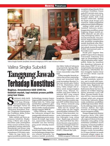 58 BERITAINDONESIA, 20 Maret 2008BERITA PEREMPUANmenjabat sebagai kepala Divisisosialisasi Pemilihan Umumpada KPU periode 2000-2004.Wajahnya sering muncul diberbagai media, baik cetakmaupun elektronik. Apalagidia begitu akrab dengan parawartawan. Inilah pengalamanpaling berarti dalam hidupnya.Apalagi inilah untuk pertamakali Indonesia menyelenggarakan pemilihan umumlangsung dengan jumlah pemilih sebanyak 152 juta jiwayang berlangsung sukses, damai dan demokratis. Atas prestasi ini, bangsa Indonesia pernah mendapat penghargaanmedali demokrasi atau Internasional Democracy Awarddari sebuah Asosiasi KonsultanPolitik Internasional pada 12November 2007.Peraih gelar magister ilmupolitik Program Pasca SarjanaUniversitas Indonesia (UI)1996 ini berpendapat bahwarakyat Indonesia mulai ‘melek”politik. Selain itu, konstitusidan demokrasi Indonesia dimata dosen FISIP UI ini memang berjalan dan maju pesat.Sepatutnya, keberhasilan dalam menggelar hajatan besarini tercatat dalam sejarahbangsa ini.Lulusan S1 FISIP UI 1985 inikembali membuka memorinya, saat ia masih aktif memberikan pencerahan menjelangpemilu 1999. Bagaimana perempuan asal Singkawang,Kalimantan Barat dan besar diJakarta ini terlibat langsungdalam memandu acara talkShow ‘Wacana Pemilu’ di stasiun ANTeve. Acara ini adalahsebagai salah-satu programUniversitas Indonesia dalamusaha melakukan pendidikanpolitik bagi masyarakat. Selainitu dia aktif juga dalam sebuahseminar, diskusi, dan rajinmenulis di berbagai mediamassa mengenai politik.Dengan bangga pula MantanPengurus Besar (PB) HMI1981-1982 menyatakan, belumada negara di dunia ini kecualiIndonesia yang paling seringmelakukan pemilihan secaralangsung, termasuk pemilihankepala daerah. Padahal, kondisi Indonesia menurut pandangan wanita bersuamikanDr H Imam Subekti ini masihtermasuk sebagai negara demokrasi prosedural. ZAH, RHekelumit detik-detikmengamandemenUUD 1945 dituangkan perempuan yangakrab dipanggil Valina inidalam sebuah buku berjudul“Menyusun Konstitusi Transisi; Pergulatan Kepentingandan Pemikiran dalam ProsesPerubahan UUD 1945.”Buku setebal 435 karya perempuan kelahiran Singkawang, 6 Maret 1961 yang diluncurkan pada pertengahanbulan Januari 2008 itu menggambarkan tentang informasimenyeluruh soal proses yangterjadi di MPR saat terjadinyaamandemen UUD tahun 1999.Buku itu juga berisi mengenai pemikiran politik yangberkembang maupun kepentingan politik yang ada saat itu.Dalam buku itu, Valina jugamemberikan gambaran gamblang dari sebuah pergulatandirinya ketika masih menjabatsebagai anggota MPR RI.Valina berharap, masyarakat Indonesia mengerti danmemperoleh informasi menyeluruh bagaimana proses amandemen itu terjadi. Agar nantinya, masyarakat Indonesiamemiliki rasa dan bertanggung jawab terhadap konstitusi.Keberhasilan sebuah demokrasi di mata Valina, bukan hanya berhubungan dengan luasnya wilayah Indonesia, banyaknya jumlah penduduk,dan faktor kultural Indonesiayang majemuk, tapi juga dilandasi dengan tingkat kesejahteraan masyarakat yang lebihbaik.Valina mengaku banyak peristiwa dan proses yang mengiringi saat menyusun bukuyang merupakan disertasi Valina saat meraih gelar Doktordi UI itu. Diantaranya, tahun2004, Valina sempat cuti setahun untuk mempersiapkanPemilu 2004. Disusul, kemudian soal kasus hukum diinternal KPU yang sempatmembuat disertasinya terbengkalai. Khususnya, saatteman-temannya sesama anggota KPU terlibat dalam kasussuap. Dirinya termasuk yangsempat dimintai keterangan.Pada saat itu, hampir sajaValina putus asa dan engganmenyelesaikan tulisannya itu.Namun Valina bersyukur, ternyata keluarganya memberikan dukungan yang cukupbesar. Begitu juga promotornya, Maswadi Rauf dan Isbodroini Suyanto yang memberinya terus semangat untuk menyelesaikan buku itu. Termasuk dukungan dari koleganyadi KPU, Chusnul Mar’iyah.Pengalaman BerartiPublik mengenal Valina saatSValina Singka SubektiTanggung JawabTerhadap KonstitusiBaginya, Amandemen UUD 1945 itutidaklah mudah, tapi melalui proses politikyang luar biasa.Valina Singka Subekti (berjilbab) bersama koleganya di KPU saat menemui Presiden.foto: presidensby.info