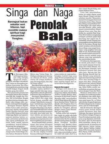 BERITAINDONESIA, 20 Maret 2008 59BERITA BUDAYASinga dan NagaPenolakBalaBarongsai bukansekadar senihiburan, tapimemiliki maknaspiritual bagimasyarakatTionghoa.ari Barongsai dikenal dengan gerakannya yang energik,ekspresif, menegangkan sekaligus menakjubkan. Tarian ini merupakan perpaduan keserasian dan dinamisasi gerak para penarinya yangatraktif dengan iringan musiktambur, gong, dan simbal.Para penari atau pemain TariBarongsai kebanyakan berlatarseni bela diri, kungfu dan Wushu. Hal ini berkaitan dengangerakan tariannya bergaya akrobatik, yakni dengan salto, meloncat, melompat dan berguling.Barongsai biasanya digelarbukan hanya pada perayaanperayaan seperti menyambutImlek (Spring Festival) atauCap Go Meh (Lantern Festival),tetapi juga digelar saat upacaraupacara penting lainnya seperti, peresmian perkantoran,toko, pusat perbelanjaan, restoran, hotel, rumah, upacarapernikahan, festival budaya,kelenteng dan sebagainya.Di negara asalnya, Tiongkok,tarian ini disebut denganLungwu atau Tarian Singa. Dalam bahasa Mandarin disebutShiwu atau Tarian Naga. Setidaknya ada tiga jenis barongsai dikenal di dunia, yaituxuang shi (singa kembar),qing shi (singa hijau), dan xingshi (singa sadar).Barongsai bukan sekadar senihiburan semata, tapi dipercayamemiliki makna spiritual sebagai penolak bala juga mengekspresikan sebuah optimisme,kedamaian dan kesejahteraan.Barongsai digambarkan sebagai simbol dari singa yangberani dengan memiliki sifatsebagai ‘Raja Rimba yang perkasa’ melindungi yang lemah.Selain itu singa juga dilambangkan binatang yang dipercaya memiliki kekuatan mistisdan magis yang bisa mengusirroh jahat atau tolak bala. Zaman dahulu permainan inisering bermain dalam istanakekaisaran yang tujuannya untuk menghibur para penonton.Secara keseluruhan, gerakanutama dari tarian barongsaiadalah gerakan singa yangmemakan amplop berisi uangyang disebut dengan istilah laysee. Di atas amplop tersebutbiasanya ditempeli dengan sayuran selada air yang melambangkan hadiah bagi sangsinga. Proses memakan lay seeini biasanya berlangsung sekitar separuh bagian dari seluruh tarian barongsai itu.Sejarah BarongsaiBerbagai versi muncul mengenai asal mula tarian Barongsai ini. Dalam sebuah buku‘Festival Tradisi Budaya Hina’karangan Dr Kai Kuok Liang diShanghai RRC menyebutkanbahwa Singa datang dari bagianBarat daratan China. Waktu itudinaiki oleh Pangeran Bun CuPhu Sak yang membawa ajaranBudha ke Tiongkok, dikenaldengan zaman Lima DinastiHan (947-950 SM).Sedang cerita lain mengatakan, tarian ini sudah ada padazaman Dinasti Xie Han. Saat itu,Kaisaran Han Bu Tie mengutusMenteri Chang Chiau ke bagianBarat Tiongkok. Sewaktukembali, sang Menteri Chiaumembawa sebuah seni budayasetempat, yakni permainansinga (Tarian Barongsai). Adapula yang menyebutkan tarianini sudah ada sejak abad ke-5atau zaman dinasti Sung, atauzaman Selatan-Utara.Versi lain menyebutkan,tarian ini sudah digelar sejakmasa Dinasti Thang (618-907sebelum masehi). Sementara,menurut seorang guru besar asalUniversitas Jinan, China, HuangKun Zhang, menyebutkan Tarian Barongsai ada sejak tahun420-589 Masehi, yakni, padazaman pemerintahan dinastiSelatan-Utara atau Nan Bei.Ketika itu, pasukan Raja SongWen-Di kewalahan menghadapiserangan pasukan gajah RajaFan-Yang dari negeri Lin Yi.Timbullah sebuah inisiatif darisang panglima perang Raja SongWen Di bernama Zhong Queuntuk membuat sebuah bonekatiruan Singa yang sangat besar.Upaya sang panglima ternyatatidak sia-sia, dia berhasil mengusir pasukan gajah yang lari ketakutan karena melihat singaraksasa yang siap menerkamdan menyerang mereka.Di Indonesia, Barongsai mulai masuk pada abad 17 atausaat terjadi migrasi besar-besaran dari China Selatan. Nama Barongsai menurut versiIndonesia berasal dari duasuku kata, Barong dan Sai.Kata Barong, berasal dari bahasa Melayu yang mirip dengan kesenian barong asal dariJawa atau barong/singa-singaan dari Bali, sedang kataSai berasal dari sebuah dialekHokkian yang bermakna Singa. Suku Hakka sendiri menyebutkan permainan Barongsai ini dengan Tsam Sie Theu.Mulanya keberadaan seniTionghoa ini cenderung sembunyi-sembunyi dan tidak dipertontonkan secara umum. Namun sejak Inpres No. 14 Tahun1967 dicabut dengan KeputusanPresiden (Keppres) No. 6 tahun2000, seni ini mulai bangkit.Kini di Indonesia, Barongsaisecara resmi masuk dalamwadah Persatuan Seni danOlahraga Barongsai Indonesia(Persobarin) dengan PengurusPusat Persobarin periode 2006-2010 yang dipimpin oleh Dahlan Iskan. Saat ini Persobarintelah membuka cabang di sejumlah daerah, di antaranya diDKI Jakarta, Jatim, Jateng,Jabar, Kalsel, Kaltim, Kalbar,Sulut, NTB, Gorontalo, Sumsel,Riau, Papua, Jambi, dan Sumatera Barat. ZAHT