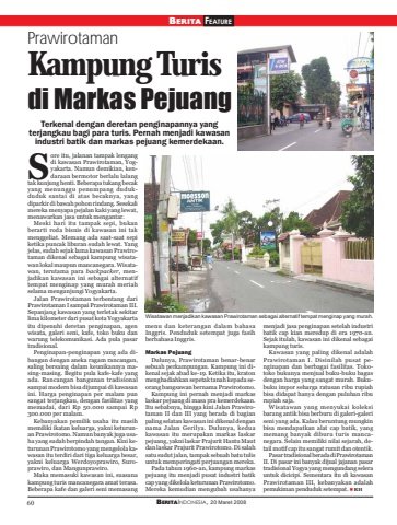 60 BERITAINDONESIA, 20 Maret 2008BERITA FEATUREPrawirotamanKampung Turisdi Markas PejuangTerkenal dengan deretan penginapannya yangterjangkau bagi para turis. Pernah menjadi kawasanindustri batik dan markas pejuang kemerdekaan.menu dan keterangan dalam bahasaInggris. Penduduk setempat juga fasihberbahasa Inggris.Markas PejuangDulunya, Prawirotaman benar-benarsebuah perkampungan. Kampung ini dikenal sejak abad ke-19. Ketika itu, kratonmenghadiahkan sepetak tanah kepada seorang bangsawan bernama Prawirotomo.Kampung ini pernah menjadi markaslaskar pejuang di masa pra kemerdekaan.Itu sebabnya, hingga kini Jalan Prawirotaman II dan III yang berada di bagianpaling selatan kawasan ini dikenal dengannama Jalan Gerilya. Dulunya, keduakawasan itu merupakan markas laskarpejuang, yakni laskar Prajurit Hantu Mautdan laskar Prajurit Prawirotomo. Di salahsatu sudut jalan, tampak sebuah batu tulisuntuk memperingati perjuangan mereka.Pada tahun 1960-an, kampung markaspejuang itu menjadi pusat industri batikcap yang dikelola keturunan Prawirotomo.Mereka kemudian mengubah usahanyamenjadi jasa penginapan setelah industribatik cap kian meredup di era 1970-an.Sejak itulah, kawasan ini dikenal sebagaikampung turis.Kawasan yang paling dikenal adalahPrawirotaman I. Disinilah pusat penginapan dan berbagai fasilitas. Tokotoko bukunya menjual buku-buku bagusdengan harga yang sangat murah. Bukubuku impor seharga ratusan ribu rupiahbisa didapat hanya dengan puluhan riburupiah saja.Wisatawan yang menyukai koleksibarang antik bisa berburu di galeri-galeriseni yang ada. Kalau beruntung mungkinbisa mendapatkan alat cap batik, yangmemang banyak diburu turis mancanegara. Selain memiliki nilai sejarah, detail motif cap itu sangat rumit dan otentik.Pasar tradisional berada di PrawirotamanII. Di pasar ini banyak dijual jajanan pasartradisional Yogya yang mengundang selerauntuk dicicipi. Sementara itu di kawasanPrawirotaman III, kebanyakan adalahpemukiman penduduk setempat. RHore itu, jalanan tampak lengangdi kawasan Prawirotaman, Yogyakarta. Namun demikian, kendaraan bermotor berlalu lalangtak kunjung henti. Beberapa tukang becakyang menunggu penumpang dudukduduk santai di atas becaknya, yangdiparkir di bawah pohon rindang. Sesekalimereka menyapa pejalan kaki yang lewat,menawarkan jasa untuk mengantar.Meski hari itu tampak sepi, bukanberarti roda bisnis di kawasan ini takmenggeliat. Memang ada saat-saat sepiketika puncak liburan sudah lewat. Yangjelas, sudah sejak lama kawasan Prawirotaman dikenal sebagai kampung wisatawan lokal maupun mancanegara. Wisatawan, terutama para backpacker, menjadikan kawasan ini sebagai alternatiftempat menginap yang murah meriahselama mengunjungi Yogyakarta.Jalan Prawirotaman terbentang dariPrawirotaman I sampai Prawirotaman III.Sepanjang kawasan yang terletak sekitarlima kilometer dari pusat kota Yogyakartaitu dipenuhi deretan penginapan, agenwisata, galeri seni, kafe, toko buku danwarung telekomunikasi. Ada pula pasartradisional.Penginapan-penginapan yang ada dibangun dengan aneka ragam rancangan,saling bersaing dalam keunikannya masing-masing. Begitu pula kafe-kafe yangada. Rancangan bangunan tradisionalsampai modern bisa dijumpai di kawasanini. Harga penginapan per malam punsangat terjangkau, dengan fasilitas yangmemadai, dari Rp 50.000 sampai Rp300.000 per malam.Kebanyakan pemilik usaha itu masihmemiliki ikatan keluarga, yakni keturunan Prawirotomo. Namun banyak juga usaha yang sudah berpindah tangan. Kini keturunan Prawirotomo yang mengelola kawasan itu terdiri dari tiga keluarga besar,yakni keluarga Werdoyoprawiro, Suroprawiro, dan Mangunprawiro.Maka memasuki kawasan ini, suasanakampung turis mancanegara amat terasa.Beberapa kafe dan galeri seni memasangSWisatawan menjadikan kawasan Prawirotaman sebagai alternatif tempat menginap yang murah.