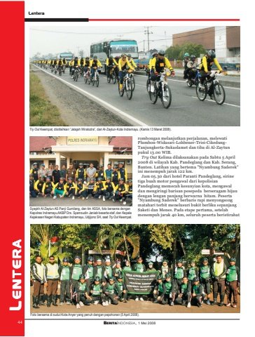 44 BERITAINDONESIA, 1 Mei 2008 L ENTERA44Lenterarombongan melanjutkan perjalanan, melewatiPlumbon-Widasari-Lohbener-Trisi-CikedungTanjungkerta-Sukaslamet dan tiba di Al-Zaytunpukul 13.00 WIB.Try Out Kelima dilaksanakan pada Sabtu 5 April2008 di wilayah Kab. Pandeglang dan Kab. Serang,Banten. Latihan yang bertema \ini menempuh jarak 122 km.Jam 05.30 dari hotel Paranti Pandeglang, sirinetiga buah motor pengawal dari kepolisianPandeglang memecah kesunyian kota, mengawaldan mengiringi barisan pesepeda berseragam hijaudengan lengan panjang berwarna hitam. Peserta\ Saderek\matahari terbit menelusuri bukit berliku sepanjangSaketi dan Menes. Pada etape pertama, setelahmenempuh jarak 40 km, seluruh peserta beristirahatTry Out Keempat, diistilahkan “Jelajah Wiralodra”, dari Al-Zaytun-Kota Indramayu. (Kamis 13 Maret 2008).Syaykh Al-Zaytun AS Panji Gumilang, dan tim ASSA, foto bersama denganKapolres Indramayu AKBP Drs. Syamsudin Janieb beserta staf, dan KepalaKejaksaan Negeri Kabupaten Indramayu, Udjijono SH, saat Try Out Keempat.Foto bersama di sudut Kota Anyer yang penuh dengan pepohonan (5 April 2008).