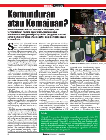 50 BERITAINDONESIA, 1 Mei 2008BERITA NASIONALKemunduranatau Kemajuan?dilakukan oleh pemerintah Indonesiayang mengaku sebagai negara demokrasi.Depkominfo juga dianggap tidak memiliki pekerjaan lain sehingga harus melakukan penyensoran atas akses internet Indonesia yang masih harus tumbuh denganjumlah pengguna yang cuma sekitar 25juta orang. Padahal masyarakat bangsayang berbasis informasi berkembangkarena kemudahan akses, luasnya jaringan, serta kualitas akses yang cepat danmemadai. Perkembangan internet sudahsangat tertinggal dengan negara lain,kemudahan aksesnya malah dibatasi.Sikap skeptis datang dari pengamatbudaya massa Veven Sp. Wardhana.Menurut Veven, rencana pemerintahmengeblok situs-situs berkonten negatifseperti pornografi dan kekerasan yangdiakses lewat internet dinilai tak akanefektif. Sebab internet memiliki akses takterbatas sehingga akan sangat sulit dibatasi. \misalnya, content lain pasti akan terbatasi,\harus ada pembatasan, ia meneruskan,dapat dilakukan dari provider internet diIndonesia, bukan dari situsnya. Tapi, jikapembatasan di provider Indonesia dilakukan, terjadilah pembatasan arus informasi. Nah, solusinya, \peraturan.\Apa yang dikatakan oleh Veven soalpembatasan arus informasi terwujud juga.Pemerintah mulai ‘memanfaatkan’ UUITE dengan menginstruksikan 146 ISP(Internet Service Provider) dan 30 NAP(network access provider) untuk memblokir situs-situs yang memuat film Fitnaawal April lalu. Tindakan drastis inidiambil karena Google tidak mengindahkan permintaan pemerintah untukmenghapus video Fitna dari situsnya.Selain YouTube milik Google, situs-situsseperti MySpace, Metacafe, Multiply, danRapidshare tidak bisa diakses oleh pengunjung selama kurang lebih seminggu.‘Aksi’ pemerintah lewat surat edaranbernomor 84/M.KOMINFO/04/08 yangdikeluarkan oleh Menkominfo Muhammad Nuh itu mendapat kecaman kerasdari sebagian masyarakat. Rektor InstitutTeknologi Bandung Prof Dr Djoko Santosomenilai tindakan pemerintah memblokirsitus YouTube dan situs lainnya merugikan dunia pendidikan. “Itu ibarat membunuh tikus dengan bom nuklir,” katanyauntuk memberi gambaran bahwa aksi pemerintah itu sangat berlebihan.Komentar 'menyentil' datang dari Koran Tempo (27 Maret 2008). DalamAkses informasi melalui internet di Indonesia jauhtertinggal dari negara-negara lain. Namun upayaMenkominfo mengawasi jaringan dan pengguna internet,serta memblokir situs-situs negatif, bisa menjadi sebuahkemunduran.FaktaSebanyak 12 persen situs di dunia ini mengandung pornografi; sekitar 372juta halaman website pornografi; 25 persen yang dicari melalui search engine adalah pornografi. Sebanyak 35 persen dari data yang diunduh adalahpornografi; setiap detik 28.258 pengguna internet melihat pornografi; setiaphari 266 situs porno baru muncul; 70 persen traffic pornografi terjadi padajam kerja, yaitu pukul 09.00-17.00. Sejumlah negara seperti Cina dan Kanadatelah memblokade situs-situs porno itu.elamat yeee pemerintah *suitsuit*, kami mengucapkan selamat atas disahkannya UU ITEdan pornografi. Dengan ini kamimenyatakan dukungan sepenuhnya terhadap pemerintah. Buktikan UU ini dibuatbukan untuk menutupi kebodohan pemerintah. Cihuyyyyyyyyyyy.Kata ejekan ini menyisip di halamandepan situs Depkominfo yang dijebol olehhacker sebagai aksi protes atas disahkannya Undang-Undang Informasi danTransaksi Elektronik (UU ITE) di DPR(25/3).Aksi protes dan perlawanan terhadapUU ITE ini merupakan wujud dari kekhawatiran sebagian pengguna internetbahwa pemerintah akan menggunakanundang-undang ini untuk mengekangkebebasan berekspresi dan berpendapatmasyarakat di area publik. Sejumlahblogger yang rutin menulis opini dankritik menyatakan keprihatinannya.Mereka khawatir bisa dipenjara cumakarena beropini, sama seperti pada eraOrde Baru.Kekhawatiran ini cukup beralasansebab Menkominfo tidak merinci secarajelas yang dimaksud dengan situs-situsnegatif. Apakah blog atau lalu-lintas email melalui mailing list yang mengkritikperilaku pemerintah juga masuk dalamkategori negatif? Mereka kemudian mencurigai pasal ini sengaja digolkan politikusantikritik yang tak mau diawasi masyarakat.Tidaklah mengherankan kalau Menkominfo kemudian dicap sedang kembali keera Departemen Penerangan ala Ordebaru. Dengan UU ITE ini, Menkominfosedang mempersiapkan diri untuk menjadi polisi, memeriksa dan mengawasijaringan dan pengguna internet. Ini dinilaisebuah kemunduran karena pemerintahberlaku seperti pemerintah komunis yangdengan tangan besi mengendalikan rakyatbanyak. Pada praktiknya, China melakukan sensor dengan \backbone nasional-nya dan ini akanSBebas Diperjualbelikan: Situs porno akan diblokir, lalu