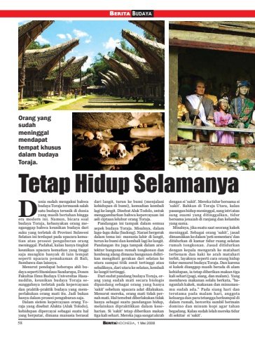 58 BERITAINDONESIA, 1 Mei 2008BERITA BUDAYATetap Hidup Selamanyaunia sudah mengakui bahwabudaya Toraja termasuk salahsatu budaya terunik di duniayang masih bertahan hinggaera modern ini. Namun, bicara soalbudaya Toraja, kebanyakan orang menganggap bahwa keunikan budaya darisuku yang terletak di Provinsi SulawesiSelatan ini terdapat pada upacara kematian atau prosesi penguburan orangmeninggal. Padahal, kalau hanya tingkatkeunikan upacara kematian yang tinggisaja mungkin banyak di lain tempatseperti upacara pemakaman di Bali,Sumbawa dan lainnya.Menurut pendapat beberapa ahli budaya seperti Stanislaus Sandarupa, DosenFakultas Ilmu Budaya Universitas Hasanuddin, keunikan budaya Toraja sesungguhnya terletak pada kepercayaandan praktik-praktik budaya yang memperlakukan orang mati itu. Jadi bukanhanya dalam prosesi penguburan saja.Dalam sistem kepercayaan orang Toraja yang disebut Alukta (Aluk Tolodo),kehidupan dipercayai sebagai suatu halyang berputar, dimana manusia berasaldari langit, turun ke bumi (menjalanikehidupan di bumi), kemudian kembalilagi ke langit. Disebut Aluk Todolo, untukmenggambarkan bahwa kepercayaan iniasli ciptaan leluhur orang Toraja.Pandangan ini tampak dalam semuaaspek budaya Toraja. Misalnya, dalamlagu-lagu duka (badong). Narasi bergerakdalam tema ini: manusia lahir di langit,turun ke bumi dan kembali lagi ke langit.Pandangan itu juga tampak dalam arsitektur bangunan rumah tongkonan danlumbung alang dimana bangunan didirikan mengikuti gerakan dari selatan keutara sampai titik zenit tertinggi atausebaliknya, dari utara ke selatan, kembalike langit tertinggi.Dari sudut pandang budaya Toraja, orang yang sudah mati secara biologisdipandang sebagai orang yang hanya'sakit' sebelum upacara adat dilakukan.Menurut mereka, orang mati tidak pernah mati. Hal tersebut diberlakukan tidakhanya sebagai suatu pandangan hidup,melainkan dipraktikkan dalam keseharian. Si 'sakit' tetap diberikan makantiga kali sehari. Mereka juga sangat akrabDOrang yangsudahmeninggalmendapattempat khususdalam budayaToraja.dengan si 'sakit'. Mereka tidur bersama si'sakit'. Bahkan di Toraja Utara, kalaupasangan hidup meninggal, sang istri atausang suami yang ditinggalkan, tidurbersama jenazah di ranjang dan kelambuyang sama.Misalnya, jika suatu saat seorang kakekmeninggal. Sebagai orang 'sakit', jasaddimasukkan ke dalam 'peti sementara' danditidurkan di kamar tidur ruang selatanrumah tongkonan. Jasad ditidurkandengan kepala mengarah ke matahariterbenam dan kaki ke arah matahariterbit, layaknya seperti cara orang hiduptidur menurut budaya Toraja. Dan karenasi kakek dianggap masih berada di alamkehidupan, ia tetap diberikan makan tigakali sehari (pagi, siang, dan malam). Yangmembawa makanan selalu berkata, \ngunlah kakek, makanan dan minumanmu sudah ada.\terutama pada malam hari, anggotakeluarga dan para tetangga berkumpul didalam rumah, bercerita sambil bermaindomino dan minum kopi agar tahanbegadang. Kalau sudah lelah mereka tidurdi sekitar si 'sakit'.