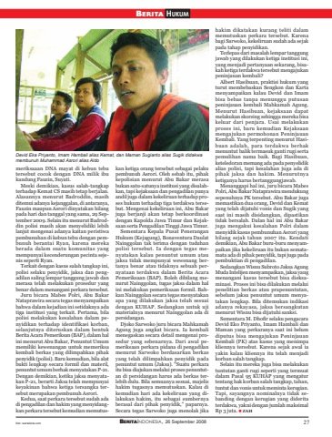 BERITAINDONESIA, 26 September 2008 27BERITA HUKUMmeriksaaan DNA mayat di kebun tebutersebut cocok dengan DNA milik ibukandung Fauzin, Suyati.Meski demikian, kasus salah-tangkapterhadap Kemat CS masih tetap berjalan.Alasannya menurut Badroddin, masihditemui adanya kejanggalan, di antaranya,Fauzin maupun Asrori dinyatakan hilangpada hari dan tanggal yang sama, 29 September 2009. Selain itu menurut Badroddin polisi masih akan menyelidiki lebihlanjut mengenai adanya kaitan peristiwapembunuhan di kebun tebu dengan pembunuh berantai Ryan, karena merekaberada dalam suatu komunitas yangmempunyai kecenderungan pecinta sejenis seperti Ryan.Terkait dengan kasus salah tangkap ini,polisi selaku penyidik, jaksa dan pengadilan saling lempar tanggung jawab danmerasa telah melakukan prosedur yangbenar dalam menangani perkara tersebut.Juru bicara Mabes Polri, Abu BakarNataprawira secara tegas menyampaikanbahwa dalam kejadian ini setidaknya adatiga institusi yang terkait. Pertama, bilapolisi melakukan kesalahan dalam penyidikan terhadap identifikasi korban,selanjutnya diteruskan dalam bentukBerita Acara Pemeriksan (BAP), dalam halini menurut Abu Bakar, Penuntut Umummemiliki kewenangan untuk memeriksakembali berkas yang dilimpahkan pihakpenyidik (polisi). Baru kemudian, bila alatbukti lengkap secara formil dan materil,penuntut umum berhak menyatakan P-21.Dengan demikian, ketika jaksa menyatakan P-21, berarti Jaksa telah mempunyaikeyakinan bahwa ketiga tersangka tersebut merupakan pembunuh Asrori.Kedua, saat perkara tersebut sudah adadi pengadilan dan hakim yang menyidangkan perkara tersebut kemudian memutuskan ketiga orang tersebut sebagai pelakupembunuh Asrori. Oleh sebab itu, pihakkepolisian menurut Abu Bakar merasabukan satu-satunya institusi yang disalahkan, tapi kejaksaan dan pengadilan punyaandil juga dalam kekeliruan terhadap proses hukum terhadap tiga terdakwa tersebut. Mengenai kekeliruan ini, Abu Bakarjuga berjanji akan tetap berkoordinasidengan Kapolda Jawa Timur dan Kejaksaan serta Pengadilan Tinggi Jawa Timur.Sementara Kepala Pusat PeneranganHukum (Kejagung), Bonaventura DaulatNainggolan tak terima dengan tuduhanpolisi tersebut. Ia dengan tegas menyatakan kalau penuntut umum ataujaksa tidak mempunyai wewenang bertanya benar atau tidaknya sebuah pernyataan terdakwa dalam Berita AcaraPemeriksaan (BAP). Boleh dibilang menurut Nainggolan, tugas jaksa dalam halini melakukan pemeriksaan formil. Bahkan Nainggolan secara tegas menyatakanapa yang dilakukan jaksa telah sesuaidengan KUHAP. Sedangkan untuk ujimaterialnya menurut Nainggolan ada dipersidangan.Djoko Sarwoko juru bicara MahkamahAgung juga angkat bicara. Ia kembalimenegaskan secara detail mengenai prosedur yang sebenarnya. Dari awal pemeriksaan perkara pidana di pengadilanmenurut Sarwoko berdasarkan berkasyang telah dilimpahkan penyidik padapenuntut umum (Jaksa). “Suatu perkaraitu bisa diajukan melalui proses penuntutan di persidangan harus ada berkas terlebih dulu. Bila semuanya sesuai, majelishakim tugasnya memutuskan. Kalau dikemudian hari ada kekeliruan yang dilakukan hakim, itu sebagai sumbernyaberasal dari pihak penyidik,” paparnya.Secara tegas Sarwoko juga menolak jikahakim dikatakan kurang teliti dalammemutuskan perkara tersebut. Karenabagi Sarwoko, kekeliruan sudah ada sejakpada tahap penyidikan.Terlepas dari masalah lempar tanggungjawab yang dilakukan ketiga institusi ini,yang menjadi pertanyaan sekarang, bisakah ketiga terdakwa tersebut mengajukanpeninjauan kembali?Albert Hasibuan, praktisi hukum yangturut membebaskan Sengkon dan Kartamenyampaikan kalau Devid dan Imambisa bebas tanpa menunggu putusanpeninjauan kembali Mahkamah Agung.Menurut Hasibuan, kejaksaan dapatmelakukan skorsing sehingga mereka bisakeluar dari penjara. Usai melakukanproses ini, baru kemudian Kejaksaanmengajukan permohonan PeninjauanKembali. Yang terpenting menurut Hasibuan adalah, para terdakwa berhakmenuntut balik termasuk ganti rugi sertapemulihan nama baik. Bagi Hasibuan,keteledoran memang ada pada penyelidikalias polisi, tapi kesalahan juga ada dipihak jaksa dan hakim. Menurutnyaketiganya harus bertanggungjawab.Menanggapi hal ini, juru bicara MabesPolri, Abu Bakar Nataprawira mendukungsepenuhnya PK tersebut. Abu Bakar jugamemastikan dua orang, Devid dan Kematyang telah dijatuhi vonis dan Sugik yangsaat ini masih disidangkan, dipastikantidak bersalah. Dalan hal ini Abu Bakarjuga mengakui kesalahan Polri dalammenyidik kasus pembunuhan Asrori yanghilang sejak tahun 2007 itu. Kendatidemikian, Abu Bakar buru-buru menyampaikan jika kekeliruan itu bukan sematamata ada di pihak penyidik, tapi juga padapembuktian di pengadilan.Sedangkan Wisnu Subroto Jaksa AgungMuda Intelijen menyampaikan, jaksa yangmenangani kasus tersebut bisa dieksaminasi. Proses ini bisa dilakukan melaluipenelitian berkas atau prapenuntutan,sebelum jaksa penuntut umum menyatakan lengkap. Bila ditemukan indikasiadanya rekayasa, jaksa bersangkutanmenurut Wisnu bisa dijatuhi sanksi.Sementara M. Dhofir selaku pengacaraDevid Eko Priyanto, Imam Hambali danMaman yang perkaranya saat ini belumdiputus bisa mengajukan PeninjauanKembali (PK) atas kasus yang menimpakliennya tersebut. Karena sejak awal iayakin kalau kliennya itu telah menjadikorban salah tangkap.Selain itu mereka juga bisa melakukantuntutan ganti rugi seperti yang termuatdalam Pasal 95 KUHAP yang mengaturtentang hak korban salah tangkap, tahan,tuntut dan vonis untuk meminta kerugian.Tapi, sayangnya nominalnya tidak sebanding dengan kerugian yang dideritaterdakwa, yakni dengan jumlah maksimalRp 3 juta. ZAHDevid Eka Priyanto, Imam Hambali alias Kemat, dan Maman Sugianto alias Sugik didakwamembunuh Muhammad Asrori alias Aldofoto: wartakota.com