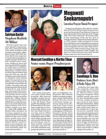BERITAINDONESIA, 26 September 2008 29BERITA TOKOHSutrisno BachirSiapkan Hadiah10 MiliarBersiap-siaplah bagi paracalon legislatif (caleg) pendulang suara terbanyak Pemilu2009 untuk mendapat rezekinomplok sebesar Rp10 milliar.Ketua Umum DPP PAN Soetrisno Bachir atau yang populer disebut SB mengadakan sayembara dengan memberi hadiah tersebut secara cumacuma. Hadiah itu murni darikantong pribadi SB yang dikenal sangat gencar mengiklankan dirinya di berbagai media.Menariknya, hadiah sebesaritu bukan diperuntukkan bagicaleg dari PAN saja, tapi dariberbagai parpol peserta pemilu. Sementara untuk internalcaleg PAN yang berhasil mendulang suara terbanyak SBmenyediakan dana sebesar Rp5 milliar. Sayembara SB yangmengusung tema Sistem SuaraTerbanyak itu juga berlakubagi caleg yang berhasil mendulang 30 persen suara di masing-masing daerah tempatpemilihan dengan perolehanhadiah Rp 1 milliar. Sayembara itu menurut Sekjen PAN,Zulkifli Hasan sudah diumumkan secara resmi dalam pembukaan Silatnas PAN di Pekanbaru tanggal 29-31 Agustus. Lebih jauh Zulkifli menjelaskan kalau sayembara itubertujuan memotivasi paracaleg untuk lebih bersemangatdalam bersaing secara positifdalam pemilu 2009 nanti.Para caleg juga didorong melakukan aktivitas seperti kegiatan sosial, pemberian santunan sampai perbaikan ekonomi masyarakat untuk menarik minat pemilih. MegawatiSoekarnoputriLuncurkan Program ‘Rumah Perempuan’Mooryati Soedibyo & Martha TilaarSama-sama Dapat PenghargaanProgram ini ditangani oleh putrinya sendiri,Ketua DPP PDIP bidang Pemberdayaan Perempuan dan Masyarakat Puan Maharani. Megawatijuga meluncurkan Posko “Ibu dan Anak” denganmoto “Ibu Cerdas Anak Sehat”. Rencananya PDIP akan membangun Posko Ibu dan Anak diseluruh Indonesia. Megawati berharap peluncuran PDIP sebagai rumah perempuan ini benarbenar dijadikan momen kebangkitan perempuanIndonesia. Selama ini masih banyak perempuanyang sesungguhnya tak mau maju. Mega meminta perempuan PDIP menjadi pelopor bagi seluruh perempuan Indonesia untuk bangkit. Dengan cara itulah Indonesia akan cepat menjadibangsa yang besar dan bermartabat. Dua wanita yang samasama pakar dalam bidangkosmetika, BRA MooryatiSoedibyo, pendiri dan pemilik Kosmetik Mustika Ratu dan DR Martha Tilaarpendiri dan sekaligus pemilik Kosmetik Sari Ayu mendapat penghargaan Entrepreneurship Award 2008dari Asia Pasific Entrepreneurship Award (APEA)yang digelar di 16 negara.Penghargaan APEA ini diberikan sebagai apresiasi paraentrepreneur laki-laki maupun perempuan yang terbukti memiliki semangatwirausaha yang besar namun tidak melupakan tanggungjawab pada masyarakatguna meningkatkan perekonomian. BRA MooryatiSudibyo mendapat penghargaan sebagai OutstandingEnterpreneurship Award2008 karena mampu menyerap tenaga kerja sebanyak 3000 orang. Secaratidak langsung Mooryati ikutandil dalam mengentaskanpengangguran di Indonesia.Sementara Martha Tilaarmeraih penghargaan sebagaiWomen EnterpreneurshipAward 2008. Ia terpilih karena dipandang sebagai individu yang luar biasa dalammenjalankan roda bisnisnyadengan perusahaan berbasiskosmetik yang menggunakan bahan alami. Sandiaga S. UnoPembawa Acara (Host)di Radio Trijaya FMKesibukan baru bakal dilakoni pengusaha muda salahsatu pemilik saham di TVOneini. Mantan Ketua UmumHimpunan Pengusaha Muda(HIPMI) periode 2005-2006ini akan menjalankan tugasbarunya sebagai pembawaacara (host) di radio TrijayaFM pada 26 September. Dalamtugas barunya yang digelar sebulan sekali setiap Jumat pekan terakhir itu, ia akan mewawancarai sejumlah tokohatau pengusaha penting setaraChief Executive Officer (CEO).Nantinya, para CEO itu akanmenyampaikan tips atau kiatdalam menjalankan roda bisnisnya hingga mendulang kesuksesan. Subronto Laras, bosIndomobil, adalah satu daritokoh yang hendak ia jadikansebagai narasumber. foto-foto: internet