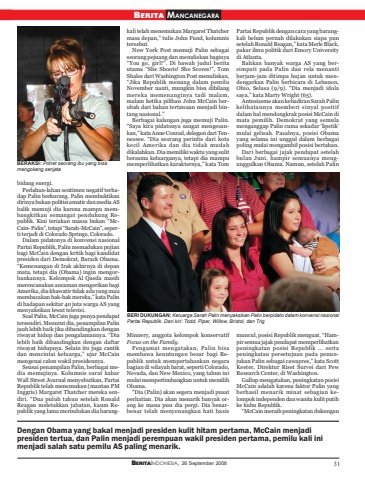 BERITAINDONESIA, 26 September 2008 31BERITA MANCANEGARAbidang energi.Perlahan-lahan sentimen negatif terhadap Palin berkurang. Palin membuktikandirinya bukan politisi amatir dan media ASbalik memuji dia karena mampu membangkitkan semangat pendukung Republik. Kini teriakan massa bukan “McCain- Palin”, tetapi “Sarah-McCain”, seperti terjadi di Colorado Springs, Colorado.Dalam pidatonya di konvensi nasionalPartai Republik, Palin memadukan pujianbagi McCain dengan kritik bagi kandidatpresiden dari Demokrat, Barack Obama.“Kemenangan di Irak akhirnya di depanmata, tetapi dia (Obama) ingin mengorbankannya. Kelompok Al Qaeda masihmerencanakan ancaman mengerikan bagiAmerika, dia khawatir tidak ada yang maumembacakan hak-hak mereka,” kata Palindi hadapan sekitar 40 juta warga AS yangmenyaksikan lewat televisi.Soal Palin, McCain juga punya pendapattersendiri. Menurut dia, penampilan Palinjauh lebih baik jika dibandingkan denganriwayat hidup dan pengalamannya. “Dialebih baik dibandingkan dengan daftarriwayat hidupnya. Selain itu juga cantikdan mencintai keluarga,” ujar McCainmengenai calon wakil presidennya.Seusai penampilan Palin, berbagai media memujinya. Kolumnis surat kabarWall Street Journal menyebutkan, PartaiRepublik telah menemukan (mantan PMInggris) Margaret Thatcher mereka sendiri. “Dua puluh tahun setelah RonaldReagan meletakkan jabatan, kaum Republik yang lama merindukan dia barangkali telah menemukan Margaret Thatchermasa depan,” tulis John Fund, kolumnistersebut.New York Post memuji Palin sebagaiseorang pejuang dan menuliskan baginya“You go, girl!”. Di bawah judul beritautama “She Shoots! She Scores!”, TomShales dari Washington Post menuliskan,“Jika Republik menang dalam pemiluNovember nanti, mungkin bisa dibilangmereka memenanginya tadi malam,malam ketika pilihan John McCain berubah dari bahan tertawaan menjadi bintang nasional.”Berbagai kalangan juga memuji Palin.“Saya kira pidatonya sangat mengesankan,” kata Anne Conrad, delegasi dari Tennessee. “Dia seorang perintis dari kotakecil Amerika dan dia tidak mudahdikalahkan. Dia memiliki waktu yang sulitbersama keluarganya, tetapi dia mampumemperlihatkan karakternya,” kata TomPartai Republik dengan cara yang barangkali belum pernah dilakukan siapa punsetelah Ronald Reagan,” kata Merle Black,pakar ilmu politik dari Emory Universitydi Atlanta.Bahkan banyak warga AS yang bersimpati pada Palin dan rela menantiberjam-jam ditimpa hujan untuk mendengarkan Palin berbicara di Lebanon,Ohio, Selasa (9/9). “Dia menjadi idolasaya,” kata Marty Wright (65).Antusiasme akan kehadiran Sarah Palinkelihatannya memberi sinyal positifdalam hal mendongkrak posisi McCain dimata pemilih. Demokrat yang semulamenganggap Palin cuma sekadar ‘lipstik’mulai gelisah. Pasalnya, posisi Obamayang selama ini unggul dalam berbagaipoling mulai mengambil posisi bertahan.Dari berbagai jajak pendapat setelahbulan Juni, hampir semuanya mengunggulkan Obama. Namun, setelah PalinMinnery, anggota kelompok konservatifFocus on the Family.Pengamat mengatakan, Palin bisamembawa keuntungan besar bagi Republik untuk mempertahankan negarabagian di wilayah barat, seperti Colorado,Nevada, dan New Mexico, yang tahun inimulai mempertimbangkan untuk memilihObama.“Dia (Palin) akan segera menjadi pusatperhatian. Dia akan menarik banyak orang ke mana pun dia pergi. Dia benarbenar telah menyenangkan hati basismuncul, posisi Republik menguat. “Hampir semua jajak pendapat memperlihatkanpeningkatan posisi Republik ... sertapeningkatan persetujuan pada penunjukan Palin sebagai cawapres,” kata ScottKeeter, Direktur Riset Survei dari PewResearch Center, di Washington.Gallup mengatakan, peningkatan posisiMcCain adalah karena faktor Palin yangberhasil menarik minat sebagian kelompok independen dan wanita kulit putihke kubu Republik.“McCain meraih peningkatan dukunganDengan Obama yang bakal menjadi presiden kulit hitam pertama, McCain menjadipresiden tertua, dan Palin menjadi perempuan wakil presiden pertama, pemilu kali inimenjadi salah satu pemilu AS paling menarik.BERAKSI: Potret seorang ibu yang bisamengokang senjataBERI DUKUNGAN: Keluarga Sarah Palin menyaksikan Palin berpidato dalam konvensi nasionalPartai Republik. Dari kiri: Todd, Piper, Willow, Bristol, dan Trig