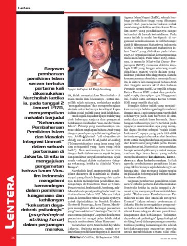 36 BERITAINDONESIA, 26 September 2008 L ENTERALentera36Gagasanpembaruanpemikiran Islamsecara terbukapertama kalidikemukakanNurcholish ketikaia, pada tanggal 2Januari 1970,menyampaikanmakalah berjudul“KeharusanPembaharuanPemikiran Islamdan MasalahIntegrasi Ummat”dalam sebuahpertemuan diJakarta. Di situ iamengajukanpengamatanbahwa kaum Muslim Indonesiamengalamikemandegandalam pemikirankeagamaan dankehilangan“kekuatan dayadobrak psikologis”(psychologicalstriking force)dalam perjuanganmereka.tik, tidak menyebabkan Nurcholish - dimasa muda dan dewasanya - untuk memillih salah satunya, melainkan malah“menggabungkan” dan mengembangkansintesis antar keduanya ke wilayah kepedulian sosial-politik yang jauh lebih luas.Hasil segala daya dan upaya itulah yangoleh beberapa sarjana dan pengamatbelakangan ini disebut “neo-modernismeIslam”. Prinsip yang mendasarinya termuat dalam ungkapan bahasa Arab yangdengan penuh percaya diri sering dikutipnya, Al-Muhâfazhah `alâ al-qadîm alshâlih wa al-akhz bî al-jadîd al-ashlah(“Mempertahankan yang lama yang baikdan mengambil yang baru yang lebihbaik”). Dan semuanya itu tercermindengan baik dalam semua sepak terjangdan pemikiran yang dilontarkannya, sejakmuda - sebagai aktivis mahasiswa - hingga sekarang, ketika ia dijuluki “GuruBangsa”.Nurcholish kecil memperoleh pendidikan dasarnya di Madrasah al-Wathaniyyah yang diasuh langsung oleh ayahnya. Ia lalu melanjutkan pendidikan menengahnya di Pesantren Daar al ‘Ulum.Pesantren ini, berlokasi di Jombang, adalah salah satu pusat penting kaderisasi tradisionalisme Islam NU. Merasa tidakpuas, ia kemudian minta kepada ayahnyauntuk dipindahkan ke Pondok ModernGontor di Ponorogo, Jawa Timur. Meskipun mengklaim diri sebagai pesantrenyang “non-sektarian” dan ingin “berdiri diatas semua golongan”, aspirasi keIslamanpesantren ini sangat jelas lebih dekatkepada modernisme Islam Masyumi.Pada tahun 1962, Nurcholish hijrah keJakarta, ibukota negara, untuk melanjutkan pendidikan tingginya di InstitutAgama Islam Negeri (IAIN), sebuah lembaga pendidikan tinggi yang dibangunpemerintah pasca-kemerdekaan untukmendorong mobilitas vertikal kaum Muslim santri yang pendidikannya sangatterhambat di bawah kolonialisme. Padamasa inilah ia mulai berkiprah di organisasi kemahasiswaan: ia terlibat sangataktif di Himpunan Mahasiswa Indonesia(HMI), sebuah organisasi mahasiswa Islam “kota” yang didirikan pada tahun1947. Di organisasi inilah kemampuannyamulai menonjol. Pada tahun 1965, misalnya, ia menulis Nilai-nilai Dasar Perjuangan (NDP), rumusan doktrin ideologis HMI yang hingga sekarang masihdijadikan materi wajib dalam pengkaderan puluhan ribu anggotanya. Karenakemampuannya demikian menonjol (saatitu, ia antara lain menguasai bahasa Arabdan Inggris secara aktif dan bahasaPerancis secara pasif), ia terpilih sebagaiKetua Umum HMI untuk dua periode:1966 – 1969 dan 1969 – 1971. Hingga saatini, dialah satu-satunya Ketua UmumHMI yang terpilih dua kali.Mungkin faktor inilah yang menjadikan namanya belakangan begitu melekatdengan HMI. Tapi sumbangan Nurcholishsebenarnya jauh dari berhenti di situ,melainkan malah baru bermula. Sumbangan terbesarnya justru terletak padaupayanya merumuskan apa yang mungkin dapat disebut sebagai “wajah IslamIndonesia”, upaya yang pada titik-titiktertentu sengaja ia lepaskan dari benderaHMI untuk menghindarkan organisasi itudari kontroversi yang tidak perlu. Dalamupaya besar ini, Nurcholish mencurahkanhampir seluruh pikirannya untuk menyerasikan tiga tema besar yang selalumenyibukkannya: keislaman, kemodernan dan keindonesian. Inilahagenda pembaharuan pemikiran Islamyang dikibarkannya sejak dekade 1970-anhingga kini - dan memang dalam rangkaini pulalah ia beberapa kali terlibat dalamkontroversi besar.Gagasan pembaruan pemikiran Islamsecara terbuka pertama kali dikemukakanNurcholis ketika ia, pada tanggal 2 Januari 1970, menyampaikan makalah berjudul “Kaharusan Pembaharuan Pemikiran Islam dan Masalah IntegrasiUmmat” dalam sebuah pertemuan diJakarta. Di situ ia mengajukan pengamatan bahwa kaum Muslim Indonesia mengalami kemandegan dalam pemikirankeagamaan dan kehilangan “kekuatandaya-dobrak psikologis” (psychologicalstriking force) dalam perjuangan mereka.Indikasi penting kemandegan itu adalahketidakmampuan mayoritas merekauntuk membedakan antara nilai-nilaiSyaykh Al-Zaytun AS Panji Gumilangfoto-foto: dok. berindo