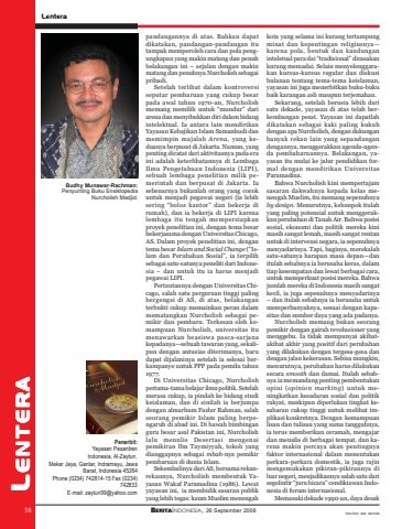 38 BERITAINDONESIA, 26 September 2008LenteraL ENTERA38pandangannya di atas. Bahkan dapatdikatakan, pandangan-pandangan itutampak memperoleh cara dan pola pengungkapan yang makin matang dan penuhbelakangan ini – sejalan dengan makinmatang dan penuhnya Nurcholish sebagaipribadi.Setelah terlibat dalam kontroversiseputar pembaruan yang cukup besarpada awal tahun 1970-an, Nurcholishmemang memilih untuk “mundur” dariarena dan menyibukkan diri dalam bidangintelektual. Ia antara lain mendirikanYayasan Kebajikan Islam Samanhudi danmemimpin majalah Arena, yang keduanya berpusat di Jakarta. Namun, yangpenting dicatat dari aktivitasnya pada eraini adalah keterlibatannya di LembagaIlmu Pengetahuan Indonesia (LIPI),sebuah lembaga penelitian milik pemerintah dan berpusat di Jakarta. Iasebenarnya bukanlah orang yang cocokuntuk menjadi pegawai negeri (ia lebihsering “bolos kantor” dan bekerja dirumah), dan ia bekerja di LIPI karenalembaga itu tengah mempersiapkanproyek penelitian ini, dengan tema besarbekerjasama dengan Universitas Chicago,AS. Dalam proyek penelitian ini, dengantema besar Islam and Social Change (“Islam dan Perubahan Sosial”, ia terpilihsebagai satu-satunya peneliti dari Indonesia – dan untuk itu ia harus menjadipegawai LIPI.Pertautannya dengan Universitas Chicago, salah satu perguruan tinggi palingbergengsi di AS, di atas, belakanganterbukti cukup memainkan peran dalammematangkan Nurcholish sebagai pemikir dan pembaru. Terkesan oleh kemampuan Nurcholish, universitas itumenawarkan beasiswa pasca-sarjanakepadanya—sebuah tawaran yang, sekalipun dengan antusias diterimanya, barudapat dijalaninya setelah ia selesai berkampanye untuk PPP pada pemilu tahun1977.Di Universitas Chicago, Nurcholishpertama-tama belajar ilmu politik. Setelahmerasa cukup, ia pindah ke bidang studikeislaman, dan di sinilah ia berjumpadengan almarhum Fazlur Rahman, salahseorang pemikir Islam paling berpengaruh di abad ini. Di bawah bimbinganguru besar asal Pakistan ini, Nurcholishlalu menulis Desertasi mengenaipemikiran Ibn Taymiyyah, tokoh yangdianggapnya sebagai mbah-nya pemikirpembaruan di dunia Islam.Sekembalinya dari AS, bersama rekanrekannya, Nurcholish membentuk Yayasan Wakaf Paramadina (1986). Lewatyayasan ini, ia membidik sasaran publikyang lebih tegas: kaum Muslim menengahkota yang selama ini kurang tertampungminat dan kepentingan religiusnya—karena pola, bentuk dan kandunganinteletual para dai “tradisional” dirasakankurang memadai. Selain menyelenggarakan kursus-kursus regular dan diskusibulanan tentang tema-tema keislaman,yayasan ini juga menerbitkan buku-bukubaik karangan asli maupun terjemahan.Sekarang, setelah berusia lebih darisatu dekade, yayasan di atas telah berkembangan pesat. Yayasan ini dapatlahdikatakan sebagai kaki paling kukuhdengan apa Nurcholish, dengan dukunganbanyak rekan lain yang sepandangandengannya, menggerakkan agenda-agenda pembaharuannya. Belakangan, yayasan itu mulai ke jalur pendidikan formal dengan mendirikan UniversitasParamadina.Bahwa Nurcholish kini mempertajamsasaran dakwahnya kepada kelas menengah Muslim, itu memang sepenuhnyaby design. Menurutnya, kelompok itulahyang paling potensial untuk menggerakkan perubahan di Tanah Air. Bahwa posisisosial, ekonomi dan politik mereka kinimasih sangat lemah, masih sangat rentanuntuk di intervensi negara, ia sepenuhnyamenyadarinya. Tapi, baginya, merekalahsatu-satunya harapan masa depan—danitulah sebabnya ia berusaha keras, dalamtiap kesempatan dan lewat berbagai cara,untuk memperkuat posisi mereka. Bahwajumlah mereka di Indonesia masih sangatkecil, ia juga sepenuhnya menyadarinya– dan itulah sebabnya ia berusaha untukmemperbanyaknya, sesuai dengan kapasitas dan sumber daya yang ada padanya.Nurcholish memang bukan seorangpemikir dengan gairah revolusioner yangmenggebu. Ia tidak mempunyai akibatakibat akhir yang positif dari perubahanyang dilakukan dengan tergesa-gesa dandengan jalan kekerasan. Sebisa mungkin,menurutnya, perubahan harus dilakukansecara smooth dan damai. Itulah sebabnya ia memandang penting pembentukanopini (opinion marking) untuk meningkatkan kesadaran sosial dan politikrakyat, meskipun diperlukan tingkat kesabaran cukup tinggi untuk melihat implikasi konkretnya. Dengan kemampuanlisan dan tulisan yang sama tangguhnya,ia terus memberikan ceramah, mengajardan menulis di berbagai tempat. dan karena makin percaya akan pentingnyafaktor internasional dalam menentukanperkara-perkara domestik, ia juga rajinmengemukakan pikiran-pikirannya diluar negeri, menjadikannya salah satu darisegelintir “juru bicara” cendikiawan Indonesia di forum internasional.Memasuki dekade 1990-an, daya desakPenerbit:Yayasan PesantrenIndonesia, Al-Zaytun,Mekar Jaya, Gantar, Indramayu, JawaBarat, Indonesia 45264Phone (0234) 742814-15 Fax (0234)742833E-mail: zaytun99@yahoo.comBudhy Munawar-Rachman:Penyunting Buku EnsiklopediaNurcholish Madjid.foto-foto: dok. berindo