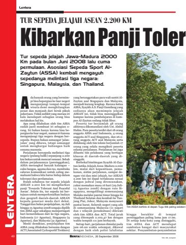40 BERITAINDONESIA, 26 September 2008LenteraL ENTERA40TUR SEPEDA JELAJAH ASEAN 2.200 KMKibarkan Panji TolerTur sepeda jelajah Jawa-Madura 2000Km pada bulan Juni 2008 lalu cumapermulaan. Asosiasi Sepeda Sport AlZaytun (ASSA) kembali mengayuhsepedanya melintasi tiga negara:Singapura, Malaysia, dan Thailand.da banyak orang yang bermimpi bisa bepergian ke luar negerimengunjungi tempat-tempatwisata demi menghilangkanpenat dan menjauh dari hiruk pikukpekerjaan. Tidak sedikit yang merasa irikala mendapati sebagian orang bisamelakukan hal itu.Apa yang dilakukan oleh tim ASSAsudah pasti membuat iri sebagian orang. Iri bukan hanya karena bisa bepergian ke luar negeri, namun iri karenamengunjungi tiga negara dengan bersepeda. Itupun bukan semangat ‘jalanjalan’ yang dibawa, tetapi semangatuntuk menghargai hubungan baiksesama manusia.Perjalanan bersepeda melintasi tiganegara (pulang balik) sepanjang 2.200km bukan untuk mencari sensasi. Sebabdalam perjalanannya (persinggahan),ASSA merangkul banyak kalangan –suku bangsa, agama dan ras, membukasaluran komunikasi untuk saling memahami bahwa kita harus hidup dalamtoleransi dan perdamaian.Itulah sebabnya tur sepeda jelajahASEAN 2.200 km ini mengibarkanpanji ‘Towards Tolerant And PeacefulAsean’. Selain itu, tur sepeda ini bertujuan untuk memperkenalkan budayadan geografi daerah-daerah ASEANkepada generasi muda dari dekat.Tanggal dan bulan penjelajahan, 29 Julihingga 13 Agustus 2008 sengaja dipilihtim ASSA agar sekaligus memperingatihari kemerdekaan dari ke tiga negara,Indonesia (17 Agustus), Singapura (9Agustus), dan Malaysia (31 Agustus).Meski demikian, penjelajahan timASSA yang dilakukan bersama denganACT (Associated Cyclosportif Trekkers)yang beranggotakan para wali santri AlZaytun asal Singapura dan Malaysia,menjadi kurang lengkap. Karena ketuaASSA, Syaykh A.S. Panji Gumilang yangsedianya akan memimpin jelajahASEAN ini, tidak bisa meninggalkankampus karena pembelajaran di kampus Al-Zaytun sedang tidak libur.Peserta tur berjumlah 48 orangakhirnya dikomandani oleh Ust. AbdulHalim. Para peserta terdiri dari 18 oranganggota ASSA asal Indonesia, 4 oranganggota ACT asal Singapura, dan 26 orang anggota ACT asal Malaysia sertadidukung oleh tim teknis berjumlah 17orang yang selalu mengikuti pesertaselama perjalanan. Perjalanan ini jugadibantu tim pelaksana yang bertugaskhusus di daerah-daerah yang disinggahi.Berbekal bimbingan Syaykh Al-Zaytun ketika Jelajah Jawa-Madura 2.000km, mulai dari kepanitiaan, pemakanan, sistim perjalanan, sampai dengan visi dan misi jelajah, tur ASEAN2.200 km ini dapat terlaksana sesuaidengan jadwal yang direncanakan,yakni memakan masa 16 hari (29 Juli13 Agustus 2008) dengan rute Singapura, mengelilingi semenanjungMalaka melalui pantai timur hingga keThailand Selatan dan kembali ke Tanjung Piai, Johor, Malaysia menyusuripantai barat. Seluruh negeri yang adadi semenanjung Malaysia (11 negeridan 1 wilayah persekutuan) dilewatioleh tim ASSA dan ACT. Total jarakyang ditempuh 2.102,47 km denganwaktu tempuh 111 jam berkayuh.Setiap hari, perjalanan dimulai padajam 06.00 waktu setempat, dikawaldengan baik oleh polisi lalulintashingga berakhir di tempatpersinggahan paling lama jam 17.00.Di setiap kota-kota yang disinggahi,tim ASSA dan ACT mendapatsambutan hangat dari masyarakatsekitar. Penyambutan-penyambutanATim ASSA berfoto di depan Tugu titik paling selatan Bfoto: dok. al-zaytun