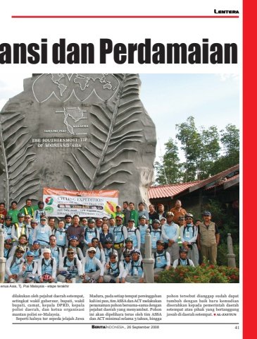 BERITAINDONESIA, 26 September 2008 41LENTERAansi dan Perdamaiandilakukan oleh pejabat daerah setempat,setingkat wakil gubernur, bupati, wakilbupati, camat, kepala DPRD, kepalapolisi daerah, dan ketua organisasimantan polisi se-Malaysia.Seperti halnya tur sepeda jelajah JawaMadura, pada setiap tempat persinggahankali ini pun, tim ASSA dan ACT melakukanpenanaman pohon bersama-sama denganpejabat daerah yang menyambut. Pohonini akan dipelihara terus oleh tim ASSAdan ACT minimal selama 3 tahun, hinggapohon tersebut dianggap sudah dapattumbuh dengan baik baru kemudiandiserahkan kepada pemerintah daerahsetempat atau pihak yang bertanggungjawab di daerah setempat. AL-ZAYTUNBenua Asia, Tj. Piai Malaysia - etape terakhir