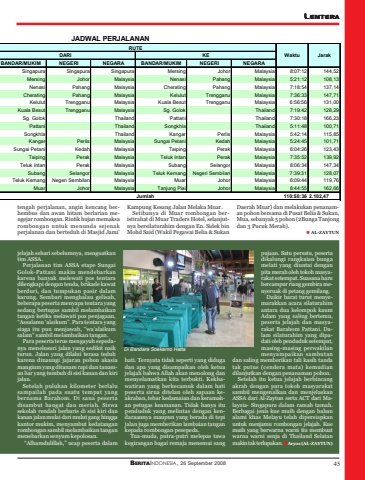 BERITAINDONESIA, 26 September 2008 45LENTERAtengah perjalanan, angin kencang berhembus dan awan hitam berlarian mengejar rombongan. Rintik hujan memaksarombongan untuk menunda sejenakperjalanan dan berteduh di Masjid Jami’jelajah sehari sebelumnya, menguatkantim ASSA.Perjalanan tim ASSA etape SungaiGolok-Pattani makin mendebarkankarena banyak melewati pos tentaradilengkapi dengan tenda, brikade kawatberduri, dan tumpukan pasir dalamkarung. Sembari menghalau gelisah,beberapa peserta menyapa tentara yangsedang bertugas sambil melambaikantangan ketika melawati pos penjagaan,“Assalamu ‘alaikum”. Para tentara yangsiaga itu pun menjawab, “wa’alaikumsalam” sambil melambaikan tangan.Para peserta terus mengayuh sepedanya menelusuri jalan yang sedikit naikturun. Jalan yang dilalui terasa teduhkarena dinaungi jajaran pohon akasiamangium yang ditanam rapi dan tanaman liar yang tumbuh di sisi kanan dan kirijalan.Setelah puluhan kilometer berlalusampailah pada suatu tempat yangbernama Barahom. Di sana pesertadisambut hangat dan meriah. Siswasekolah rendah berbaris di sisi kiri dankanan jalan mulai dari mulut gang hinggakantor mukim, menyambut kedatanganrombongan sambil melambaikan tanganmenebarkan senyum kepolosan. “Alhamdulillah,” ucap peserta dalamhati. Ternyata tidak seperti yang didugadan apa yang disampaikan oleh ketuajelajah bahwa Allah akan menolong danmenyelamatkan kita terbukti. Kekhawatiran yang berkecamuk dalam hatipeserta sirna ditelan oleh sapaan keakraban, tebar kedamaian dan keramahan petugas keamanan. Tidak hanya itupenduduk yang melintas dengan kendaraannya maupun yang berada di tepijalan juga memberikan lambaian tangankepada rombongan pesepeda.Tua-muda, putra-putri melepas tawakegirangan bagai remaja menemui sangpujaan. Satu persatu, pesertadikalungi rangkaian bungamelati yang diuntai denganpita merah oleh tokoh masyarakat setempat. Suasana harubercampur riang gembira menyeruak di petang gemilang.Dzikir barat turut menyemarakkan acara silaturahimantara dua kelompok kaumAdam yang saling bertemu,peserta jelajah dan masyarakat Barahom Pattani. Dalam silaturahim yang dipadati oleh penduduk setempat,masing-masing perwakilanmenyampaikan sambutandan saling memberikan tali kasih tandatak putus (cendera mata) kemudiandilanjutkan dengan penanaman pohon.Setelah itu ketua jelajah berbincangakrab dengan para tokoh masyarakatsambil mengenalkan dan menjelaskanASSA dari Al-Zaytun serta ACT dari Malaysia- Singapura dalam ramah tamah.Berbagai jenis kue muih dengan bahanalami khas Melayu telah dipersiapkanuntuk menjamu rombongan jelajah. Kuemuih yang berwarna warni itu membuatwarna warni senja di Thailand Selatanmakin tak terlupakan. Aryos (AL-ZAYTUN)BANDAR/MUKIM NEGERI NEGARA BANDAR/MUKIM NEGERI NEGARASingapura Singapura Singapura Mersing Johor Malaysia 8:07:12 144,52Mersing Johor Malaysia Nenasi Pahang Malaysia 5:21:12 108,13Nenasi Pahang Malaysia Cherating Pahang Malaysia 7:18:54 137,14Cherating Pahang Malaysia Kelulut Trengganu Malaysia 7:36:33 147,71Kelulut Trengganu Malaysia Kuala Besut Trengganu Malaysia 6:56:56 131,00Kuala Besut Trengganu Malaysia Sg. Golok Thailand 7:19:42 128,29Sg. Golok Thailand Pattani Thailand 7:30:18 166,23Pattani Thailand Songkhla Thailand 5:11:48 100,71Songkhla Thailand Kangar Perlis Malaysia 5:42:14 115,85Kangar Perlis Malaysia Sungai Petani Kedah Malaysia 5:24:45 101,71 Sungai Petani Kedah Malaysia Taiping Perak Malaysia 6:04:26 123,43Taiping Perak Malaysia Teluk Intan Perak Malaysia 7:35:52 139,92Teluk Intan Perak Malaysia Subang Selangor Malaysia 8:06:34 147,34Subang Selangor Malaysia Teluk Kemang Negeri Sembilan Malaysia 7:39:31 128,07 Teluk Kemang Negeri Sembilan Malaysia Muar Johor Malaysia 6:09:44 119,76Muar Johor Malaysia Tanjung Piai Johor Malaysia 8:44:55 162,66Jumlah 110:50:36 2.102,47JADWAL PERJALANANWaktu JarakRUTEDARI KEKampung Kesang Jalan Melaka Muar.Setibanya di Muar rombongan beristirahat di Muar Traders Hotel, selanjutnya bersilaturahim dengan En. Sidek binMohd Said (Wakil Pegawai Belia & SukanDaerah Muar) dan melakukan penanaman pohon bersama di Pusat Belia & Sukan,Mua, sebanyak 5 pohon (2Bunga Tanjongdan 3 Pucuk Merah). AL-ZAYTUNDi Bandara Soekarno Hatta