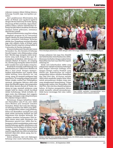 BERITAINDONESIA, 26 September 2008 49LENTERArukunan maupun dalam bidang lainnya,keluarga Syaykh juga merupakan panutan.Dari pembicaraan Khoirunnisa danSofia al-Widad saat ngobrol-ngobroldengan Berita Indonesia di Graha Agung,Semarang 28 Mei 2008 lalu, dapat disimpulkan bahwa rahasia keberhasilan keluarga Syaykh dalam membina kerukunanmaupun dalam pekerjaan, semuanyadiawali dari rumah.Menurut Khoirunnisa yang kini sedangmengikuti program S2 di UniversitasNegeri Jakarta ini, kunci keluarga Syaykhdalam menjalani kehidupan keluargaadalah doa. Pengakuan tersebut diiyakanjuga oleh adiknya Sofia al-Widad, putribungsu Syaykh yang kini sedang kuliah diUniversitas Al-Zaytun Indonesia.Menurut kedua putri Syaykh dari enambersaudara itu, doa bersama di keluargaSyaykh hampir rutin dilaksanakan setiaphari. Mereka juga mengaku selalu membantu sang ayah dengan doa agar dimampukan melakukan aktivitasnya memimpin Mahad Al-Zaytun. Di sampingitu, mereka juga mengaku selalu menurutpada nasehat dan saran kedua orang tua.Kembali ke masalah andil keluarga ataskeberhasilan tour ASSA Jawa-Madura 26Mei-11 Juni 2008. Dengan memperhatikan keberhasilan tour sepeda sehatASSA keliling Jawa-Madura ini, takurung, ajang ini menjadi multiguna bagipesertanya. Di samping sebagai apresiasidalam rangka seabad hari kebangkitannasional, peringatan lahirnya nilai-nilaidasar dan falsafah negara, dan pengenalanlebih dekat daerah-daerah di Tanah Air,ajang ini juga menjadi pelajaran yangsangat baik ke depan untuk bersikapdalam berkeluarga. Sebab terbukti, dengan restu dan dukungan dari anggotakeluarga, tantangan yang cukup berat punbisa dijalani dengan sukses.Bersamaan dengan kehadiran bulansuci Ramadhan 1429 H ini, tour ASSAJawa-Madura pun menjadi semakinbermakna. Belajar dari restu dan dukungan keluarga peserta tim ASSA yang akhirnya menghasilkan sukses yang gemilang,bulan suci Ramadhan menjadi saat yangtepat untuk merenung kembali apa danbagaimana kita dengan keluarga. Ramadhan memberi kesempatan baik kepada semua umat pada umumnya, dankhususnya peserta tour ASSA dan keluarganya untuk membukakan pintu maafkepada keluarga apabila sebelumnya adakesalahan atau kesilapan di dalam rumahtangga. Dengan demikian keberhasilanseperti yang diraih tim ASSA ini kelak bisakembali diperoleh dalam ajang dan kegiatan yang lain.Selain pelajaran dari arti dukungankeluarga atas suatu keberhasilan, beberapa pelajaran lain juga bisa diambildari keberhasilan-keberhasilan tim ASSA,khususnya berkaitan dengan makna bulanRamadhan dan hari raya Idul Fitri sepertisekarang ini.Salah satu keberhasilan ASSA yangcukup besar adalah terjalinnya hubunganbaik dengan beberapa lembaga sertadengan hampir semua Pemkab yangdilalui tim. Keberhasilan ini seakanmengartikan bahwa sebelum Ramadhandan Idul Fitri tiba, Al-Zaytun melaluiASSA telah membuka tangan lebar-lebaruntuk persaudaraan dengan siapa punyang menghormati kemanusiaan. Tanpamengurangi makna dari Ramadhan danIdul Fitri, dari situ bisa diambil pelajaranbahwa, Al-Zaytun mengajarkan bahwauntuk menjalin sebuah persaudaraan,tidak harus menunggu hari atau waktutertentu. Para keluarga peserta tour ASSA dengan setia menunggu ketibaan tim di Kampus Al-ZaytunSetiap melintasi kota sepanjang Jawa-Madura, tim ASSA selalu mendapat dorongan moril darikeluarga dan masyarakat di kota tersebutTour ASSA semakin mengeratkan rasapersaudaraan antara sesama peserta
