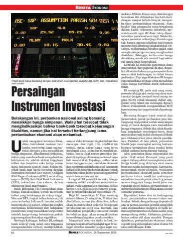 50 BERITAINDONESIA, 26 September 2008BERITA EKONOMIPersainganInstrumen InvestasiBelakangan ini, perbankan nasional saling bersaingmenaikkan bunga simpanan. Walau hal tersebut tidakmengindikasikan bahwa bank-bank tersebut kekuranganlikuiditas, namun jika hal tersebut berlangsung lama,pertumbuhan ekonomi akan melambat.ntuk mengatasi ketatnya likuiditas, bank-bank nasional berlomba menyerap dana masyarakat dengan cara menaikkanbunga simpanan. Jika dirunut lebih jelas,faktor yang membuat bank mengeluarkankebijakan itu adalah akibat tingginyainflasi dan kenaikan suku bunga acuanBank Indonesia atau BI Rate. Selain itu,pihak bank juga harus bersaing denganinstrumen investasi lain seperti ObligasiRitel Negara Indonesia (ORI), surat utangnegara (SUN), Sertifikat Bank Indonesia(SBI), reksadana dan saham, dalammenjaring dana masyarakat.Bank Indonesia (BI) menaikkan sukubunga dimaksudkan untuk meredaminflasi yang belakangan ini cukup tinggi.Menurut BPS, tingkat inflasi tahunan Juli2007 terhadap Juli 2008, tercatat sudahmenyentuh 11,9 persen. Inflasi itu sendirimerupakan konsekuensi dari kebijakanpemerintah yang menaikkan harga BBMsetelah harga-harga kebutuhan pokokjuga mengalami kenaikan signifikan.Berbagai kalangan, bahkan BI, sebagaibank sentral yang salah satu tugasnyamengendalikan inflasi, memprediksi,sampai akhir tahun ini tingkat inflasi bisamencapai dua digit. Jika prediksi ituterjadi, maka harga-harga yang terusmeninggi akan semakin menyulitkan,bukan hanya bagi sektor produksi (industri), tapi juga akan memperlemah dayabeli masyarakat. Tepatnya, inflasi akanterus menggerus pertumbuhan ekonomidan menjerumuskan bangsa ini. Ancamaninflasi lebih besar itu kemungkinan terjadilantaran semua faktor pendorong munculsecara bersamaan saat ini.Langkah BI menaikkan suku bungamemang sedikit sudah bisa menjinakkaninflasi. Pada Agustus lalu misalnya, inflasihanya 0,5 % padahal sebelumnya pengamat memprediksi bakal menembus 1 %.Bagi BI, menaikkan BI Rate memangsebuah dilema. Di satu pihak, BI tidak bisadisalahkan, karena jika dibiarkan, inflasiakan meruntuhkan seluruh bangunanperekonomian yang ada. Namun, jikamelakukan pengetatan moneter secaraberlebihan juga, akan mengakibatkantersendatnya kegiatan perekonomian.Menyadari besarnya risiko inflasi, beberapa pengamat berpendapat agar BI sebagai otoritas moneter jangan ragu menaikkan BI Rate. Hanya saja, diminta agarkenaikan itu dilakukan berhati-hati.Jangan sampai terlalu banyak mengorbankan pertumbuhan ekonomi. Parabankir dan pengusaha yang tergabungdalam Kadin Indonesia misalnya, mewanti-wanti agar BI Rate tetap dipertahankan pada level satu digit. Selain itu,upaya menekan inflasi juga diminta agartak hanya mengandalkan instrumenmoneter tapi dibarengi langkah fiskal. Misalnya, menurunkan besaran pajak ataumenghapus pungutan yang menghambatdistribusi. Sehingga, ketika suku bungadinaikkan, masih ada insentif bagi sektorriil untuk tetap berproduksi.Kembali ke masalah perebutan danamasyarakat, dari paparan di atas, dapatlah diketahui bahwa yang menyedot danamasyarakat belakangan ini tidak hanyaperbankan. Tapi juga dilakukan BI dengancara menaikkan BI Rate serta menaikkansuku bunga Sertifikat Bank Indonesia(SBI).Di samping BI, pada saat yang sama,pemerintah juga giat menjaring dana masyarakat dengan menjual surat utang negara (SUN) untuk menutup defisit anggaran yang tahun ini mencapai Rp94,5triliun. Pemerintah mengandalkan SUNkarena utang luar negeri sudah dipantangkan.Bersaing dengan bank sentral danpemerintah, pihak perbankan pun merangsang masyarakat untuk menyimpanuang di bank dengan cara menaikkanbunga simpanan. Sebab jika tidak dinaikkan, jangankan penyimpan baru, danamasyarakat yang sudah disimpan di Bankpun dikhawatirkan akan ditarik pemiliknya. Padahal, di lain pihak, permintankredit juga meningkat seiring bertambahnya kebutuhan dana modal kerjaakibat naiknya harga barang-barang.Aksi perebutan dana masyarakat itujelas tidak sehat. Dampak yang pastisegera datang adalah meningkatnya sukubunga kredit yang akhirnya akan membuat unit usaha kelimpungan. Karena itu,pemerintah mesti waspada. Walaupunpertumbuhan ekonomi pada semesterpertama tahun 2008 ini melampauiekspektasi banyak pihak yakni 6,4 persen,namun tingginya bunga kredit jelas merupakan sinyal bahwa pertumbuhan semester kedua tahun ini tidak akan sebesarsemester pertama.Diprediksi, kalau aksi itu berlangsunglama, pertumbuhan ekonomi akan melambat. Sebab, dengan bunga deposito diatas 11 persen, pastilah pemilik uang lebihsuka menanamkan uangnya di bank ketimbang berinvestasi di dunia usaha yangmengandung risiko. Akibatnya, pertumbuhan sektor riil akan mandek. Dengandemikian, pertumbuhan ekonomi 2009seperti yang diharapkan yakni di atas 6%akan sulit dicapai. MSUfoto: flickrPihak bank harus bersaing dengan instrumen investasi lain seperti ORI, SUN, SBI, reksadanadan saham