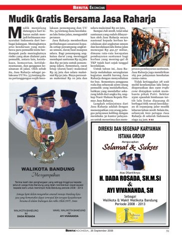 BERITAINDONESIA, 26 September 2008 51BERITA EKONOMIMudik Gratis Bersama Jasa Raharjaudik menjelangdatangnya hari lebaran sudah menjadi kebiasaan masyarakat Indonesia dari berbagai kalangan. Meningkatnyaarus kendaraan yang membawa para pemudik tentu berdampak pada meningkatnyarisiko yang akan dialami parapemudik, antara lain, kecelakaan, kemacetan, ketidaknyamanan, dan gangguan keamanan di jalan. Oleh sebabitu, Jasa Raharja sebagai pelaksana UU No. 33 tentang dana pertanggungan wajib kecelakaan penumpang dan UUNo. 34 tentang dana kecelakaan lalu lintas jalan, mengambilperanan.Jasa Raharja memberikanperlindungan asuaransi kepada setiap penumpang angkutan umum, darat/laut maupunudara. Bagi penumpang angkutan darat yang meninggalmendapat santunan Rp 25 jutadan Rp 50 juta untuk penumpang udara. Sementara, cacattetap (darat/laut) maksimalRp 25 juta dan udara maksimal Rp 50 juta. Biaya perawatan maksimal Rp 10 juta danudara maksimal Rp 20 juta.Sampai Juli 2008, total nilaisantunan yang sudah dibayarkan oleh Jasa Raharja secaranasional kepada korban kecelakaan alat angkutan umumdan kecelakaan lalu lintas jalanmencapai Rp 491,57 miliar,dimana rata-rata kecepatanpembayaran santunan bagikorban yang mening-gal diTKP tujuh hari sejak tanggalkecelakaan.Untuk tahun ini, Jasa Raharja melakukan serangkaiankegiatan mudik bareng JasaRaharja dengan menyediakan60 bus. Sementara penggunaroda dua sebanyak 3000 orangpemudik yang mendaftarkan,bahkan yang mendaftar sekarang lebih dari angka itu, ungkap Nasir Hakam Kepala Humas Jasa Raharja.Langkah selanjutnya dariJasa Raharja adalah denganmenempatkan 102 orang petugas pelayanan keliling denganmembuka 30 kantor pelayanan untuk menerima dan memproses pembayaran santunan.Jasa Raharja juga mendirikan165 pos pelayanan kesehatancuma-cuma.Tidak ketinggalan 28 unitmobil keselamatan lalu lintasdioperasikan dan 1500 traficcone disiapkan untuk membantu pihak Polri. Sekitar2500 spanduk himbauan tertib lalu lintas dipasang diberbagai titik rawan kecelakaan di sepanjang jalur mudiklebaran tahun 2008. Selain itu,sebanyak 600 petugas JasaRaharja di seluruh Indonesiasiaga 24 jam. RIM