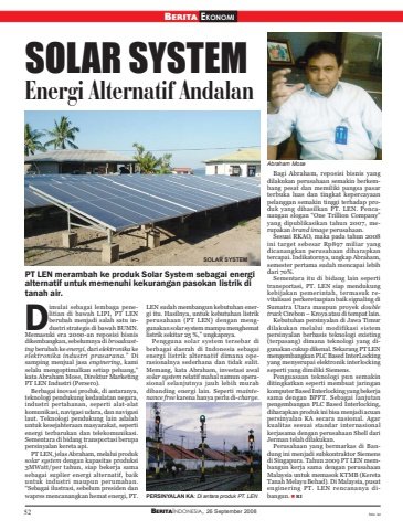 52 BERITAINDONESIA, 26 September 2008BERITA EKONOMISOLAR SYSTEMPT LEN merambah ke produk Solar System sebagai energialternatif untuk memenuhi kekurangan pasokan listrik ditanah air.imulai sebagai lembaga penelitian di bawah LIPI, PT LENberubah menjadi salah satu industri strategis di bawah BUMN.Memasuki era 2000-an reposisi bisnisdikembangkan, sebelumnya di broadcasting berubah ke energi, dari elektronika keelektronika industri prasarana.” Disamping menjual jasa enginering, kamiselalu mengoptimalkan setiap peluang,”kata Abraham Mose, Direktur MarketingPT LEN Industri (Persero).Berbagai inovasi produk, di antaranya,teknologi pendukung kedaulatan negara,industri pertahanan, seperti alat-alatkomunikasi, navigasi udara, dan navigasilaut. Teknologi pendukung lain adalahuntuk kesejahteraan masyarakat, sepertienergi terbarukan dan telekomunikasi.Sementara di bidang transportasi berupapersinyalan kereta api.PT LEN, jelas Abraham, melalui produksolar system dengan kapasitas produksi3MWatt/per tahun, siap bekerja samasebagai suplier energi alternatif, baikuntuk industri maupun perumahan.“Sebagai ilustrasi, sebelum presiden danwapres mencanangkan hemat energi, PT.LEN sudah membangun kebutuhan energi itu. Hasilnya, untuk kebutuhan listrikperusahaan (PT LEN) dengan menggunakan solar system mampu menghematlistrik sekitar 25 %,” ungkapnya.Pengguna solar system tersebar diberbagai daerah di Indonesia sebagaienergi listrik alternatif dimana operasionalnya sederhana dan tidak sulit.Memang, kata Abraham, investasi awalsolar system relatif mahal namun operasional selanjutnya jauh lebih murahdibanding energi lain. Seperti maintenance free karena hanya perlu di-charge.Bagi Abraham, reposisi bisnis yangdilakukan perusahaan semakin berkembang pesat dan memiliki pangsa pasarterbuka luas dan tingkat kepercayaanpelanggan semakin tinggi terhadap produk yang dihasilkan PT. LEN. Pencanangan slogan “One Trillion Company”yang dipublikasikan tahun 2007, merupakan brand image perusahaan.Sesuai RKAO, maka pada tahun 2008ini target sebesar Rp897 miliar yangdicanangkan perusahaan diharapkantercapai. Indikatornya, ungkap Abraham,semester pertama sudah mencapai lebihdari 70%.Sementara itu di bidang lain sepertitransportasi, PT. LEN siap mendukungkebijakan pemerintah, termasuk revitalisasi perkeretaapian baik signaling diSumatra Utara maupun proyek doubletrack Cirebon – Kroya atau di tempat lain.Kebutuhan persinyalan di Jawa Timurdilakukan melalui modifikasi sistempersinyalan berbasis teknologi existing(terpasang) dimana teknologi yang digunakan cukup dikenal. Sekarang PT LENmengembangkan PLC Based InterLockingyang menyerupai elektronik interlockingseperti yang dimiliki Siemens.Penguasaan teknologi pun semakinditingkatkan seperti membuat jaringankomputer Based Interlocking yang bekerjasama dengan BPPT. Sebagai lanjutanpengembangan PLC Based Interlocking,diharapkan produk ini bisa menjadi acuanpersinyalan KA secara nasional. Agarkualitas sesuai standar internasionalkerjasama dengan perusahaan Shell dariJerman telah dilakukan.Perusahaan yang bermarkas di Bandung ini menjadi subkontraktor Siemensdi Singapura. Tahun 2009 PT LEN membangun kerja sama dengan perusahaanMalaysia untuk memasok KTMB (KeretaTanah Melayu Behad). Di Malaysia, pusatenginering PT. LEN rencananya dibangun. RIEnergi Alternatif AndalanDSOLAR SYSTEMAbraham MosePERSINYALAN KA: Di antara produk PT. LENfoto: ist