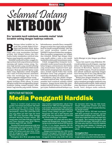 54 BERITAINDONESIA, 26 September 2008BERITA IPTEKSelamat DatangNETBOOKEra ‘semakin kecil notebook semakin mahal’ telahberakhir seiring dengan hadirnya netbook.SEPUTAR NETBOOKeberapa tahun terakhir ini, banyak toko produk digital di berbagai mal berubah wajah. Kalaudulu kita bisa menemukan berbagai toko yang menjajakan berbagaiproduk, kini hampir semua toko berlomba-lomba menjajakan notebook ataulaptop yang harganya semakin turun.Memiliki notebook berfitur canggih dengan polesan bodi yang terkesan premiummemang jadi impian semua orang. Namun bagi mereka yang sensitif terhadapharga, notebook mahal tentu tidak masukhitungan. Buat apa membeli laptop 12 jutakalau cuma digunakan untuk mengetik,cek e-mail, browsing internet, menontonvideo dan mendengar lagu. Kira-kirabegitu anggapan sebagian besar orang.Awalnya, perangkat seperti personaldigital assistant (PDA) phone, di manasebagian sudah bisa menggantikan fungsikomputer jinjing, sempat menjadi ‘jalankeluar’ bagi mereka yang mobile. Namun,kelemahannya, menulis (baca: mengetik)dengan nyaman dan cepat pada perangkatkecil ini masih menjadi kendala. Dua ibujari untuk menekan tombol padaQWERTY keyboard belum bisa menggantikan kecepatan penggunaan jari tengahdan telunjuk. Belum lagi dengan layaryang masih sekitar 3 atau 4 inci masihmenjadi kendala pada kenyamanan mata.Untuk menggantikan komputer kecil,sejumlah vendor ponsel mencoba pendekatan bergaya communicator dari Nokiayang menyertakan keyboard kecil agarlebih mudah menginput data. Konsekuensinya, bentuk seperti Nokia E90 masihdirasakan besar bagi pengguna ponseluntuk bisa diselipkan di dalam saku.Pendekatan yang lain adalah denganmembuat notebook mini. Tapi sayangnya,semakin kecil notebook semakin mahalharganya. Jangan heran kalau kita menjumpai notebook berlayar 12.1 inchi dihargai 12 juta. Padahal notebook berlayar 15.4inchi dihargai 10 juta dengan spesifikasisama.Upaya lain seperti yang dilakukan Microsoft melalui proyek Origami, yang tigatahun lalu diperkenalkan secara besarbesaran di Barcelona, Spanyol, dalamhajat 3GSM Congress. Proyek ini melahirkan sebuah notebook supermini denganlayar kurang dari 8 inci yang dikenal dengan nama Ultra Mobile PC (UMPC).Belum puas dengan kehadiran UMPC,sejumlah vendor komputer terus berupaya membuat perangkat notebook yangideal untuk kondisi mobile. Salah satunyayang diprakarsai pembuat prosesor terkenal, Intel, dengan nama netbook,Media Pengganti HarddiskSelama ini harddisk sangat dominan kitagunakan untuk tempat penyimpanan data dalamPC atau notebook. Namun seiring denganperkembangan teknologi di bidang storage(penyimpanan), muncul SSD (Solid State Drive)yang yang diklaim jauh lebih ringan dan hematdaya. SSD mulai digunakan dalam berbagaiperangkat teknologi termasuk netbook. SSDmenggunakan Solid-State RAM atau Chips RAMyang biasa digunakan pada Modul Memorykomputer seperti DDR atau SDRAM.Teknologi SSD sendiri sebenarnya sudah lamadikembangkan oleh industri komputer (1978) olehperusahaan StorageTek. Awal mula ide pembuatan SSD bahkan sudah ada di tahun 1970an,kala ide penggunaan memori semikonduktordigunakan untuk proyek IBM.Pertengahan tahun 80-an perusahaan SantaClara Systems memperkenalkan sebuah ChipsRAM berukuran 1 MBt untuk mengemulasikan sebuah harddisk. Berikutnya tahun 1995 perusahaan M-System memperkenalkan SSD mereka yangmeraup sukses sebagai pengganti harddisk.Penggunaan SSD saat itu lebih ditujukan padabidang militer yang membutuhkan misi-misi kritisdan industri penerbangan luar angkasa.Perkembangan SSD masih akan terus dikembangkan oleh berbagai pihak. Samsung misalnya,mengumumkan berhasil membuat SSD berukuran1,8 dan 2,5 inci dengan kapasitas 256 GB.Kabarnya produk tersebut akan diproduksi secaramassal pada akhir tahun 2008.Sebagai produk terobosan baru, SSD memilikibeberapa keunggulan dibandingkan denganharddisk yang kini banyak digunakan. Beberapakeunggulan mendasar yang dimiliki SSD antaralain kecepatan lebih tinggi dan tidak berisik.Dengan menggunakan prosesor yang sama,sistem kerja SSD akan lebih cepat jika dibandingkan dengan harddisk.Keunggulan lainnya, SSD lebih kuat karenalebih tahan goncangan dan benturan, juga bisabekerja dalam temperatur panas. Selain itu bentuknya yang ringkas dan bobot yang ringan tentujadi unggulan. Tapi di samping keunggulan, SSDjuga memiliki kekurangan. Kekurangan itu antaralain harga yang masih lebih mahal dan kapasitasmemori yang masih terbatas. Di Indonesia saatini, SSD 64 GB harganya bisa mencapai Rp 4juta-an.Kecanggihan AtomSemakin populernya netbook tidak lepas dari dukungan prosesor yang dirilis Intel bernama Atom.Bfoto-foto: internetAc