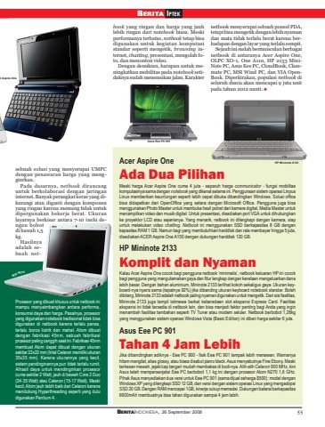 BERITAINDONESIA, 26 September 2008 55BERITA IPTEKAcer Aspire OneAda Dua PilihanMeski harga Acer Aspire One cuma 4 juta - separuh harga communicator - fungsi mobilitaskomputasinya sama dengan notebook yang dikenal selama ini. Penggunaan sistem operasi LinpusLinux memberikan keuntungan seperti lebih cepat dibuka dibandingkan Windows. Solusi officebisa didapatkan dari OpenOffice yang setara dengan Microsoft Office. Pengguna juga bisamenggunakan Photo Master untuk membuka hasil potret dari kamera digital, Media Master untukmenampilkan video dan musik digital. Untuk presentasi, disediakan port VGA untuk dihubungkanke proyektor LCD atau sejenisnya. Yang menarik, netbook ini dilengkapi dengan kamera, siapuntuk melakukan video chatting. Netbook ini menggunakan SSD berkapasitas 8 GB dengankapasitas RAM 1 GB. Namun bagi yang membutuhkan harddisk dan rela membayar hingga 5 juta,disediakan ACER Aspire One A150 dengan dukungan harddisk 120 GB.HP Mininote 2133Komplit dan NyamanKalau Acer Aspire One cocok bagi pengguna netbook ‘minimalis’, netbook keluaran HP ini cocokbagi pengguna yang mengutamakan gaya dan fitur lengkap dengan kerelaan mengeluarkan danalebih besar. Dengan bahan aluminium, Mininote 2133 terlihat kokoh sekaligus gaya. Ukuran keyboard-nya nyaris sama (tepatnya 92%) jika dibanding ukuran keyboard notebook standar. Bolehdibilang, Mininote 2133 adalah netbook paling nyaman digunakan untuk mengetik. Dari sisi fasilitas,Mininote 2133 juga tampil istimewa berkat keberadaan slot ekspansi Express Card. Fasilitasekspansi ini tidak tersedia di netbook lain, dan bisa menjadi faktor penting bagi Anda yang inginmenambah fasilitas tambahan seperti TV Tuner atau modem seluler. Netbook berbobot 1,28kgyang menggunakan sistem operasi Windows Vista (Basic Edition) ini diberi harga sekitar 6 juta.Asus Eee PC 901Tahan 4 Jam LebihJika dibandingkan adiknya - Eee PC 900 - fisik Eee PC 901 tampak lebih menawan. Warnanyahitam mengilat, alias glossy, atau biasa disebut piano black. Asus menyebutnya Fine Ebony. Meskiterkesan mewah, jejak/cap tangan mudah membekas di bodi-nya. Alih-alih Celeron 900 MHz, kiniAsus telah mempersenjatai Eee PC berbobot 1,1 kg ini dengan prosesor Atom N270 1,6 GHz.Pihak Asus menyediakan dua versi untuk Eee PC 901 (sama dijual seharga $500): model denganWindows XP yang dilengkapi SSD 12 GB, dan versi dengan sistem operasi Linux yang mengadopsiSSD 20 GB. Dengan RAM mencapai 1GB, kinerja cukup memadai. Dukungan baterai berkapasitas6600mAh membuatnya bisa tahan digunakan sampai 4 jam lebih.sebuah solusi yang menyerupai UMPCdengan penawaran harga yang menggiurkan.Pada dasarnya, netbook dirancanguntuk berkolaborasi dengan jaringaninternet. Banyak perangkat keras yang dikurangi atau diganti dengan komponenyang ringan karena memang tidak untukdipergunakan bekerja berat. Ukuranlayarnya berkisar antara 7-10 inchi dengan bobotdi bawah 1,5kg.Hasilnyaadalah sebuah netbook yang ringan dan harga yang jauhlebih ringan dari notebook biasa. Meskiperformanya terbatas, netbook tetap bisadigunakan untuk kegiatan komputasistandar seperti mengetik, browsing internet, chatting, presentasi, mengolah foto, dan menonton video.Dengan demikian, harapan untuk meningkatkan mobilitas pada notebook setidaknya sudah menemukan jalan. Karakternetbook menyerupai sebuah ponsel PDA,tetapi bisa mengetik dengan lebih nyamandan mata tidak terlalu berat karena berhadapan dengan layar yang terlalu sempit.Sejauh ini sudah bermunculan berbagainetbook di antaranya Acer Aspire One,OLPC XO-1, One A110, HP 2133 MiniNote PC, Asus Eee PC, CloudBook, Classmate PC, MSI Wind PC, dan VIA OpenBook. Diperkirakan, populasi netbook diseluruh dunia akan mencapai 9 juta unitpada tahun 2012 nanti. Prosesor yang dibuat khusus untuk netbook inimampu menyeimbangkan antara performa,konsumsi daya dan harga. Pasalnya, prosesoryang digunakan notebook tradisional tidak bisadigunakan di netbook karena terlalu panas,terlalu boros listrik dan mahal. Atom dibuatdengan fabrikasi 45nm, sebuah fabrikasiprosesor paling canggih saat ini. Fabrikasi 45nmmembuat Atom dapat dibuat dengan ukuransekitar 22x22 mm (Intel Celeron memiliki ukuran35x35 mm). Karena ukurannya yang kecil,sistem pendinginannya pun tidak terlalu rumit.Alhasil daya untuk mendinginkan prosesorcuma sekitar 2 Watt, jauh di bawah Core 2 Duo(34-35 Watt) atau Celeron (15-17 Watt). Meskikecil, Atom jauh lebih baik dari Celeron karenamendukung Hyperthreading seperti yang duludigunakan Pentium 4.HP Mininote 2133Asus Eee PC 901MSI Winder Aspire One