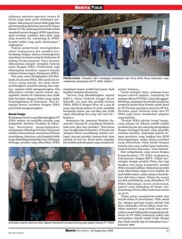 BERITAINDONESIA, 26 September 2008 57BERITA PUBLIKculannya operator-operator swasta dibisnis yang sama perlu mendapat perhatian. Sekarang ini, harus lebih gigih danjeli menangkap peluang, karena ke depandalam UU itu, peluang pemerintah untukmembeli sarana dengan APBN sepertinyaagak tertutup, padahal, kita sadar uangyang tersedia itu, cenderung di APBN,kondisi inilah yang perlu diantisipasi,”ungkapnya.Tujuan pemerintah meningkatkanshare transportasi KA semakin berkembang dengan adanya kemungkinanmasuknya investasi asing ke Indonesia dibidang Perkeretaapian. Para investordiharapkan sedapat mungkin bekerjasama dengan INKA. Pemerintah jugadiharapkan memberi support kepadaindustri dalam negeri, khususnya INKA.Hal yang sama diungkapkan Lili Rustandi, Komisaris INKA. Bila nanti ada investor asing masuk, dia akan memperhitungkan masalah untung dan ruginya. Apakah lebih menguntungkan biladikerjakan sendiri meski belum mengetahui medan di Indonesia atau lebihbaik bermitra dengan INKA yang sudahberpengalaman di Indonesia. Dari hitungan bisnis, bermitra dengan INKAjelas lebih menguntungkan.Brand ImageKonfigurasi bisnis yang dikembangkan PTINKA selama ini memiliki standar yangkompetitif. Direktur Produksi & Teknologi, Kurnijanto mengungkapkan,penguasaan teknologi di bisnis inti sesuaistandar internasional, sementara di bisnispendukung, ibaratnya satu langkah lebihmaju dibanding kompetitor lain. Sehinggaberbagai produk yang dihasilkan INKAmendapat respon positif dari pasar, baikkualitas maupun desainnya.“Inovasi yang dikembangkan, sepertiKRD-I, diesel elektrik hingga dieselhidrolik, era Argo dan produk terbaruINKA, KRD-E dengan lebar rel 1.435 Myang siap dioperasikan di Aceh memilikikecepatan antara 120-140 Km/jam, lebihcepat dibanding KA yang ada saat ini,”katanya.Sementara itu, menurut Direktur Komersial, Gunesti W, paradigma berubah,baik pola pikir dan perilaku. “Kita harussiap menghadapi kompetisi, di bisnis intimaupun bisnis pendukung melalui berbagai macam produk transportasi atauproduk di luar itu. Kami harus semakinjeli melihat potensi pasar yang semakin dinamis,” katanya.Untuk menjadi maju, peluang besarmapun sekecil apapun, sepanjang itumampu dibuat PT INKA, akan ditanggapi.Misalnya, penjualan konstruksi jembatansampai ke pulau Nusa Penida, mobil, kursike PT Pal atau peralatan sinyal ke PT KA.Perilaku pasar berbeda-beda dan PTINKA juga harus melakukan adaptasiyang berbeda.“Produk INKA adalah brand image,yang selama ini dikenal publik adalahproduksi kereta api, sekarang disuguhkandengan berbagai produk yang memilikijaminan kualitas, dukungan pabrik dengan peralatan yang lengkap dan SDMberpengalaman, maka setiap produksiyang dihasilkan tidak kalah denganpemain lain yang sudah lama berkecimpung di bisnis yang sama,” kata Gunesti.Dari pengalaman yang sesuai dengankompetensinya, PT INKA ungkapnya,bekerjasama dengan BPPT. Dalam persaingan dengan produk China dari segikualitas dan harga kompetitif, produkINKA menjadi pilihan. Sementara produkyang ditawarkan negara tirai bambu itujauh lebih mahal, salah satunya disebabkan oleh biaya impor. Selain itu, semuaproduk pendukung yang dihasilkan PTINKA dikerjakan secara profesional,seperti yang dilakukan di bisnis inti.Keuntungan bruto diberi toleransi antara15-20 %.“Kami punya pengalaman pahit saatterjadi krisis di perusahaan. Oleh sebabitu, sebagai generasi kedua setelah PakRoos Diatmoko (Dirut INKA) kami bertekad memberi yang terbaik bagi perusahaan sesuai bidang dan tanggung jawab.Krisis di PT INKA beberapa waktu lalumerupakan sejarah untuk selalu diingatdan tidak terjadi lagi di kemudian hari,”katanya. RIPENINJAUAN: Presiden SBY mendapat penjelasan dari Dirut INKA Roos Diatmoko, saatmelakukan peninjauan ke PT. INKA, MadiunKomisaris Utama Soemino Eko Saputro bersama komisaris lainnya dan jajaran direksi PT. INKAfoto: samsuri/berindo