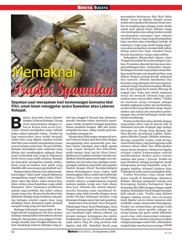 58 BERITAINDONESIA, 26 September 2008BERITA BUDAYASepekan usai merayakan hari kemenangan bernama IdulFitri, umat Islam menggelar acara Syawalan atau LebaranKetupat.udaya Syawalan biasa disebutdengan Lebaran Ketupat. OrangJawa menyebutnya dengan Lebaran Kopat atau acara Syawalan. Syawal merupakan nama sebuahbulan dalam kalender Islam. Tradisi inibagi masyarakat Jawa sudah menjadiritual rutin yang digelar sepekan setelahIdul Fitri atau setelah menjalankan puasasyawal selama enam hari. Secara harfiah,ketupat merupakan jenis makanan yangdibuat dari pembungkus pelepah daunjanur berbentuk hati yang di dalamnyaberisi beras yang sudah matang. Ketupatini hanyalah merupakan bentuk simbolisasi yang bermakna hati putih yangdimiliki oleh seseorang yang kembali suci.Ketupat dalam bahasa Jawa diterjemahkan dengan “Laku Lepat” yang di dalamnyamengandung empat makna yakni: lebar,lebur, luber dan labur. Lebar artinya luas,lebur artinya dosa/kesalahan yang sudahdiampuni, luber maknanya pemberianpahala yang berlebih, dan labur artinyawajah yang ceria. Secara keseluruhan bisadimaknai sebagai suatu keadaan yang paling bahagia setelah segala dosa yangdemikian besar diampuni untuk kembalimenjadi orang yang suci dan bersih.Berbagai kelompok masyarakat di berbagai daerah mempunyai ciri dan caranyamasing-masing dalam memaknai LebaranKetupat. Masyarakat yang tinggal di Kaliwungu, Kendal, Jawa Tengah misalnya. Sehari menjelang Lebaran Ketupat yang jatuh tiap tanggal 8 Syawal tiap tahunnya,mereka beramai-ramai menyerbu pasarpasar untuk membeli berbagai keperluanbahan pembuat ketupat. Bila kita berkesempatan ke sana, setiap rumah pasti menyediakan ketupat ini.Masyarakat Kaliwungu mengawali prosesi Lebaran Kopat atau Syawalan denganmengunjungi atau menziarahi para makam ulama setempat atau tokoh agamayang sangat disegani dan dihormati,salah-satunya Kyai Asy’ari (Kyai Guru).Setibanya di makam tersebut mereka melakukan ritual keagamaan dengan cara melakukan doa bersama dan sekaligus memperingati wafatnya sang tokoh atau populerdisebut dengan khoul. Koentjaraningratdalam Kebudayaan Jawa (1984: 328)menerangkan bahwa salah satu tradisi danbudaya Islam Jawa yang masih hidupadalah adanya penghormatan kepadamakam-makam orang suci, baik ulamaatau kyai. Setelah doa selesai digelar,mereka bersama-sama menikmati hidangan yang telah tersedia dengan menuutama berupa hidangan ketupat yangdicampur dengan sayur dan lauk-pauknya.Sementara masyarakat Desa Krapyak,Pekalongan Utara, Kota Pekalongan, JawaTengah memperingati Syawalan dengancara membuat lopis raksasa seberat 5,5kuintal dengan ketinggian dua meterberdiameter 150 cm. Tradisi ini sudah adasejak tahun 1855 M yang pertama kalidigelar oleh KH. Abdullah Sirodj yangmerupakan keturunan dari Kyai BahuRekso. Acara ini digelar sebagai saranauntuk menciptakan kerukunan umat muslim di samping juga sebagai suatu mediauntuk syiar agama Islam. Ribuan wargarela berdesakan dan saling berebut untukmendapatkan potongan lopis raksasatersebut. Konon, siapa yang mendapatkanlopis tersebut akan mendapat berkah, diantaranya, bagi yang masih lajang dipercaya akan secepatnya memperoleh jodoh.Setiap tahun kue lopis semakin besarkarena banyaknya warga yang terlibat.Sedangkan, Masyarakat Jepara, JawaTengah menyebut Syawalan dengan Lomban. Prosesinya diawali dari kawasan tempat pelelangan ikan, Ujung Batu, Jepara.Di tempat tersebut masyarakat menyediakan sesaji berupa satu kepala kerbau yangdihiasi dengan pernak-pernik makanandan sayuran. Setelah melakukan doabersama yang dipimpin oleh seorang kyai,seluruh sesaji tersebut kemudian diletakkan di atas kapal kecil untuk dilarung ditengah laut. Pada saat itulah makanansesaji itu menjadi rebutan bagi paranelayan atau masyarakat sekitar. Tradisiini menurut warga setempat sebagaibentuk ungkapan syukur atas perlindungan dan berkat yang diterima warga Jeparaselama satu tahun dan memohon perlindungan dan rezeki berlimpah untuk satutahun mendatang.Walau tradisi Syawalan identik denganmasyarakat Jawa, tapi di daerah lain diIndonesia ternyata terdapat juga budayaSyawalan ini. Warga Desa Mamala danDesa Morela, Kecamatan Laihitu, Kabupaten Maluku Tengah, Maluku misalnya.Mereka memiliki tradisi unik beruparitual Pukul Sapu yang berlangsung sejakratusan tahun silam dan dilaksanakansecara turun-temurun. Budaya ini digelarsebagai simbol kemenangan setelahmelaksanakan ibadah puasa selamasebulan dan puasa 7 Syawal. Tradisi inijuga dimaknai sebagai peringatan untukmengenang perang Kapahaha yang dipimpin Kapitan Achmad Leakawa aliasTelukabessy pada zaman penjajahan dulu.Tradisi Syawalan yang cukup unikjustru terjadi di Palembang, SumateraSelatan. Ratusan pengantin remaja asalKayuagung ibukota Kabupaten OganKomering Ilir (OKI) dengan iringan musiktanjidor melakukan kirab dengan berjalankaki sejauh 5 km. Tradisi yang disebutdengan midang morge siwe ini konontelah digelar secara turun temurun olehsembilan marga masyarakat Kayuagung.Tradisi ini memberikan pertanda telahberakhirnya status mereka sebagai seorang bujang dan gadis untuk diketahuisecara luas oleh masyarakat setempat.Dengan status mereka yang baru tersebutsebagai pasangan suami istri, diharapkantingkah laku mereka harus terjaga. ZAHMemaknaiTradisi SyawalanMemaknaiTradisi SyawalanBfoto: flickr
