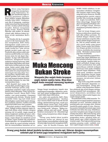 BERITAINDONESIA, 26 September 2008 63BERITA KESEHATANOrang yang duduk dekat jendela kendaraan, kereta api, tiduran dengan menempelkansebelah pipi di lantai juga berpotensi mengalami bell’s palsy.idwan yang bepergiandengan bis menuju kampung halamannya, begitu menikmati angin sepanjang perjalanan jauhnya.Kaca jendela sengaja dibiarkanterbuka lebar-lebar. Celakanya,saat tiba di kampung, wajahnyamulai terasa baal dan mencong kesisi kiri. Awalnya pihak keluargaberpikir, Ridwan mengalamigejala stroke. Namun setelahdiperika oleh dokter di sebuahrumah sakit, Ridwan bukan terkena stroke melainkan Bell'sPalsy.Dr. Wendra Ali, Sp. S, spesialissyaraf di RS Internasional Bintaro menjelaskan, Bell's Palsy(kelumpuhan wajah sesisi) terjadi akibat pembengkakan syarafwajah (syaraf ke-7 atau nervusfasialis perifer) pada satu sisi.Penderita akan merasa salah satumatanya pedih ketika cuci muka,karena mata itu tak dapat dipejamkan. Ia juga sulit berkumur,berbicara, mengunyah karenamulutnya miring/mencong. Dahitidak dapat dikerutkan atau lipatdahi hanya terlihat pada sisi yangsehat. Sudut mulut tidak dapatdiangkat, lipat nasolabialis mendatar pada sisi yang lumpuh danmencong ke sisi yang sehat. Tanda yang khas, disebut Bell's sign,adalah gerakan bola mata padasisi yang lumpuh lambat disertaibola mata berputar ke atas bilamemejamkan mata.Bell diambil dari nama SirCharles Bell, peneliti Inggris yangmeneliti beberapa pasien yangmengalami asimetris wajah yang penyebabnya tidak diketahui. Palsy berarti kelumpuhan (saraf). Kasus Bell's Palsysekitar 1 per 5000 populasi. Umumnyamenyerang pria dewasa. Wanita hamilmemiliki risiko tiga kali lebih besardibandingkan wanita tidak hamil. Sedangkan penderita diabetes mellitus berisikoempat kali lebih besar dari populasi.Penyebab pastinya masih belum diketahui. Diduga terkena paparan angin dingin baik dalam udara terbuka maupuntertutup (AC di mobil). Angin masuk kedalam tengkorak melalui foramen stilomastoideum (terdapat di belakang telinga). Angin dingin ini membuat syarafdi sekitar wajah sembab lalu membesar.Pembengkakan ini mengakibatkan pasokan darah ke syaraf tersebut terhenti.Hal itu menyebabkan kematian sel sehingga fungsi menghantar impuls ataurangsangnya terganggu. Akibatnya, perintah otak untuk menggerakkan otot-ototwajah tidak dapat diteruskan.Ari, salah satu penderita Bell's Palsymenuturkan pengalamannya. \saya merasa tidak enak di daerah bawahtelinga. Setelah beberapa hari, wajah sayasebelah kanan terasa baal. Yang palingmenggangu buat saya adalah mata kanansaya sering perih,\ganggu, minum pun jadi susah\kerjanya memang ber-AC. Ditambah lagikipas casing komputernya dekat denganwajah.''Orang yang duduk dekat jendelakendaraan, kereta api, tiduran di ataslantai dengan menempelkan sebelah pipidi lantai juga berpotensi mengalami bell'spalsy,'' ujar Dr Hardhi Pranata, SpSMARS. Itulah sebabnya, ia menyarankan sebaiknya menghindari terpaan angin secara langsung dan terus-menerus. Hardhimenganjurkan pasien segeraberobat bila terserang penyakitini. Angka kesembuhan Bell'sPalsy cukup tinggi. Hampir 85%akan mengalami perbaikan setelah 3 minggu terapi. Sisanyamengalami perbaikan dalam 3-6bulan.Saat ini terapi dengan pemberian prednisolone masih menjadi obat pilihan pertama. Ditambah dengan vitamin syaraf.Terapi sederhana yang bisa dilakukan adalah dengan senam muka. Hal ini untuk melatih otototot syaraf muka yang terasakebal. Senam muka bisa dilakukan dengan gerakan tersenyum,tertawa, membuka dan menutupmulut. Memakan permen karetjuga bisa membantu.Terapi tambahan seperti fisioterapi juga dapat dilakukan untuk mempertahankan tonus ototyang lumpuh. Apabila tidak terdapat perbaikan dengan pengobatan prednisolone dan padapemeriksaan elektrik terdapatdenervasi total maka tindakanoperatif dapat dilakukan. Padaanak-anak, tindakan operatiftidak dianjurkan karena dapatmenimbulkan komplikasi lokalmaupun intrakranial (dalamtengkorak).Bagi Anda yang lebih memilihterapi alternatif, akupuntur cukup menjanjikan. Terapi akupuntur yang dianjurkan dijalankan sebanyak tiga serial dengan masingmasing sepuluh kali penanganan. Menurut akupunturis, perubahan akanterjadi perlahan-lahan mulai bagian ataswajah sampai mulut.Penyakit Bell's Palsy tidak menular. Tetapi penyakit ini dapat kambuh, kasusnyamencapai 10-20%. Istirahat adalah halpenting pada saat serangan akut. Selamamenderita gejala-gejala di atas, disarankan pasien memakai kacamata agar mataterhindar dari debu dan asap. Sebaliknya,saat tidur tutuplah mata dengan bantuanselotip atau kassa. Bila mata kering, tetesmata membantu menguranginya. Bagipengendara motor, gunakan helm tertutup penuh agar wajah terhindar dariterpaan angin. Dan bagi pendaki gunung,gunakan penutup wajah. Latihlah otototot wajah dengan senam muka. DGRMuka MencongBukan StrokeWaspada jika wajah Anda terpaparangin dalam waktu lama. Bisa-bisawajah Anda menjadi mencong layaknyapenderita stroke.R