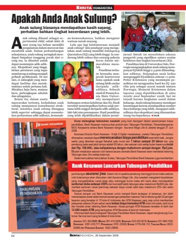 66 BERITAINDONESIA, 26 September 2008BERITA HUMANIORAApakah Anda Anak Sulung?Anak sulung biasanya mendapatkan kasih sayang,perhatian bahkan tingkat kecerdasan yang lebih.nak sulung dikenal sebagai experimental child, sebab lahir disaat orang tua belum memilikipengalaman dalam merawat danmendidik anak. Dalam perkembanganselanjutnya, anak sulung seringkali mendapat limpahan tanggung jawab dari orang tua. Ia dituntut untukdapat memimpin adik-adiknya. Ekspektasi yang tinggi,beban peraturan yang tegasmendorong si sulung menjadipribadi perfeksionis. Di sisilain, si sulunglah yang mendapat fasilitas dan menikmatinya untuk pertama kali.Misalnya baju baru, mainanbaru, perlengkapan sekolahdan sebagainya.Selain itu, dalam suatumasyarakat tertentu, kedudukan anaksulung mempunyai konsekuensi struktural, misalnya anak sulung dianggaplebih superior sehingga dapat menentukan perkawinan adik-adiknya, kemenakan-kemenakannya, bahkan mengaturwarisan nenek moyang.Lalu apa lagi keistimewaan menjadianak sulung? Ada pendapat yang mengatakan anak sulung memiliki IntelegencyQuestation (IQ) yang lebih tinggi. Ia cenderung lebih sukses dan seorang pekerjakeras dalam memecahkan masalah.Penelitian terbaru berusaha menjawab kontroversilama apakah anaksulung lebih cerdasdaripada adikadiknya. Sebuahstudi di Pennsylvania State University mempelajarihubungan urutan kelahiran dan IQ. Studitersebut menyimpulkan bahwa anak pertama lebih unggul daripada adik-adiknya,laki-laki atau perempuan. Hasil penelitianyang telah dipublikasikan dalam jurnaljurnal ilmiah ini menuliskan adanyapengaruh yang signifikan antara urutankelahiran dan tingkat kecerdasan (IQ).Penelitian lain di Universitas Oslo, Norwegia mengungkapkan anak sulung mempunyai IQ lebih tinggi 2.3 poin dibandingkan adiknya. Sedangkan anak keduamengungguli IQ adiknya sebesar 1.1 poin.Petter Kristensen yang memimpin penelitian ini menganalisa hasil tes IQ 250ribu pria sebagai syarat masuk tentaraNorwegia. Menurut Kristensen dalamlaporan yang dipublikasikan di situsmsnbc awal September 2008, hal initerjadi karena tingkatan sosial dalamkeluarga. Anak sulung biasanya mendapatkeuntungan karena mendapatkan sumberdaya keluarga yang lebih, mengajari adikadiknya dan ekspektasi yang ditanamkanorang tua kepadanya. DGRAGuna melengkapi kebutuhan nasabah yang kian beragam dalam perencanaan biayapendidikan, Bank Kesawan meluncurkan produk baru Tabungan Pendidikan. PenandatangananMOU Kerjasama antara Bank Kesawan dengan Asuransi Mega Life di Jakarta tanggal 21 Juni2008.Business Director Bank Kesawan - Entjik S.Djafar menjelaskan, melalui Tabungan Pendidikandiharapkan nasabah dapat merencanakan biaya pendidikan anak lebih baik. Jangkawaktu yang diberikan sangat fleksibel yaitu mulai dari 1 tahun sampai 20 tahun dan usiapenabung pada saat jatuh tempo adalah 65 tahun, dan setoran rutin setiap bulan besarnya mulaidari Rp. 100.000,- atau kelipatannya dengan maksimum sampai dengan Rp5 juta.Mudah melakukan setoran rutin karena secara otomatis Bank Kesawan akan mendebet rekeningTabungan atau Giro setiap bulannya.Selain kemudahan-kemudahan di atas, Tabungan Pendidikan Bank Kesawan juga memberikanJAKARTA: 021-350.8888; MEDAN: 061-415.2929; BANDUNG: 022-422.0618; SURABAYA: 031-568.7530;DENPASAR: 0361-233.777; PEKANBARU: 0761-33308; BATAM: 0778-456.112; TANJUNG BALAI: 0623-92688 dan PEMATANG SIANTAR: 0622-29666.perlindungan asuransi jiwa. Dalam hal ini apabila penabung meninggal dunia maka setoranrutin bulanannya akan diteruskan oleh Asuransi Mega Life. Jika nasabah mengalami kecelakaanyang mengakibatkan cacat tetap atau meninggal dunia maka ahli waris akan mendapatkansantunan duka sebesar 250% dari kumulatif saldo tabungan atau maksimum Rp500 juta, danmanfaat santunan rawat jalan/inap sebesar biaya rumah sakit atau maksimum 25% dari saldoTabungan Pendidikan.Sesuai dengan visi Bank Kesawan untuk menjadi Bank terdepan di kelasnya, kini lebihmemantapkan posisi dalam kancah persaingan perbankan nasional. Hal ini didukung oleh 32 jaringanlayanan yang tersebar di 10 kota di Indonesia dan ATM Kesawan yang siap untuk memberikanpelayanan selama 24 jam sehari serta bebas biaya transaksi ATM untuk info saldo, tarik tunaidan transfer antar rekening Bank Kesawan. Akses jaringan ATM Kesawan tersebar di lebih dari12.000 mesin ATM yang berlogokan ATM Bersama di seluruh Indonesia.Informasi lebih lanjut mengenai Tabungan Pendidikan Bank Kesawan, dapat menghubungi Customer Service kami yang terdekat di kota Anda:Bank Kesawan Luncurkan Tabungan Pendidikan
