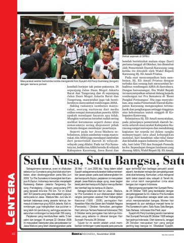 42 BERITAINDONESIA, November 2008 L ENTERA42kembali berjejer tak putus-putusnya. Disepanjang Jalan Daan Mogot JakartaBarat dan Tangerang dan di sepanjangJalan Daan Mogot Jakarta Barat danTangerang, masyarakat juga tak hentihentinya menyambut rombongan ASSA.Saking ramainya sambutan masyarakat, seorang wartawan dari mediaonline sempat menanyakan peserta ASSAapakah mendapat bayaran apa tidak.Mungkin wartawan tersebut sudah seringmelihat keramaian seperti demo atausemacamnya sering disponsori pihaktertentu dengan membayar pesertanya.Seperti pada tur Jawa-Madura sebelumnya, selain sambutan warga masyarakat, tim ASSA juga mendapat sambutandari pemerintah daerah di wilayahwilayah yang dilalui. Pada tur Pra Sumatera ini, ketika tim ASSA berada di wilayahKabupaten Karawang, Jawa Barat danhendak beristirahat malam etape (hari)pertama tanggal 18 Oktober, tim disambutoleh Pemerintah Daerah Karawang yangketika itu diwakili oleh Wakil BupatiKarawang Hj. Eli Amali Priatna.Pada saat menyampaikan kata sambutan, Hj. Eli Amali Priatna denganterbuka dan senang hati menyambut kehadiran rombongan ASSA di daerahnya.Dengan bersemangat, Ibu Wakil Bupatiini menyampaikan selamat datang kepadarombongan tur Pra Sumatera di ‘BumiPangkal Perjuangan’. Dia juga menyatakan, atas nama Pemerintah Daerah Kabupaten Karawang mengucapkan terimakasih dan penghargaan setinggi-tingginyaatas kehormatan untuk singgah di Kabupaten Karawang.Selanjutnya Hj. Eli Amali menyatakan,pada prinsipnya pemerintah daerah beserta seluruh masyarakat Kabupaten Karawang sangat merespon dan mendukungkegiatan tur sepeda ini dalam rangkamemperingati satu abad kebangkitannasional, hari kesaktian nilai-nilai dasardan falsafah negara Indonsia yaitu Pancasila, hari lahir TNI dan Sumpah Pemudake 80. Sependapat dengan landasan yangdiusung ASSA, Wakil Bupati Hj. Eli Amali,Satu Nusa, Satu Bangsa, SatuSebagaimana namanya, even ini dilakukansebelum tur Sumatera yang jika tidak ada hambatan, akan diselenggarakan pada Mei-Juni2009. Tur Pra Sumatera ini berangkat dari Kampus Al Zaytun, Indramayu kemudian menjelajahiKarawang - Bekasi - Jakarta - Tangerang - Serang - Pandeglang – Cilegon, pergi-pulang (PP)yang berjarak kira-kira 753 km. Tur ini diikutioleh 323 peserta yang rata-rata adalah juga peserta pada tur Jawa - Madura Mei- Juni lalu ditambah beberapa orang peserta lainnya, termasuk di dalamnya grup ASSA Jakarta. Kali ini,rombongan juga mengikutkan dua puluhan orang lebih tim pendukung, sehingga secara keseluruhan rombongan tur berjumlah 350 orang.Perjalanan yang membutuhkan waktu 5 hariyakni dari tanggal 18 sampai 22 Oktober 2008ini merupakan kelanjutan atau penyelesaian turJawa Madura yang telah diselenggarakan pada26 Mei - 11 Juni 2008 lalu. Yang dalam istilahSyaykh sebagaimana diutarakan ketika memberikan pesan-pesan pada saat keberangkatan timdari kampus Al-Zaytun, perjalanan ini merupakanjelajah Jawa-Madura etape ujung Jawa bagianbarat yakni dari kampus Al-Zaytun menuju Bantendan kembali lagi ke kampus Al-Zaytun.Sebagai kelanjutan dari tur Jawa - Madura,tur Pra Sumatera ini pun dilaksanakan dalamrangka peringatan seabad Hari KebangkitanNasional (1908 - 2008), peringatan HariKesaktian Nilai-nilai Dasar dan Falsafah Negara(Pancasila) 1 Oktober. Kemudian, peringatanHari Lahirnya Tentara Nasional Indonesia (TNI)5 Oktober serta peringatan hari lahirnya Indonesia yang selama ini dikenal dengan HariSumpah Pemuda 28 Oktober.Tujuan tur ini sendiri adalah untuk memberikan bimbingan nyata kepada para pemudaagar terhindar dari berbagai penyakit sosialseperti, kenakalan remaja dan penyalahgunaanobat-obat terlarang. Kemudian, untuk mengenallebih dekat daerah atau wilayah di Tanah Air,dan untuk lebih mengekalkan cinta akanbangsa dan negara Indonesia.Menyongsong peringatan Hari Sumpah Pemuda 28 Oktober 1928 yang berdekatan denganpenyelenggaraan tur ini, maka tur Pra Sumateraini juga dimaksudkan sebagai salah satu carauntuk mempersatukan bangsa. Momen haribersejarah itu pun sekaligus menjadi tema turPra Sumatera ini yakni, ‘Satu Nusa, Satu Bangsa,Satu Bahasa. Indonesia Kita Pasti Jaya’.Syaykh AS Panji Gumilang sendiri memaknaiHari Sumpah Pemuda 28 Oktober 1928 sebagaihari jadinya Indonesia. Oleh karena itu, tanggal28 Oktober merupakan hari yang sangatpenting bagi bangsa ini. Dikatakan Syaykh,Masyarakat sekitar berlomba-lomba mengambil foto Syaykh AS Panji Gumilang (tengah)dengan kamera ponsel.Rehat sejenak di SPBU.foto-foto: berindo
